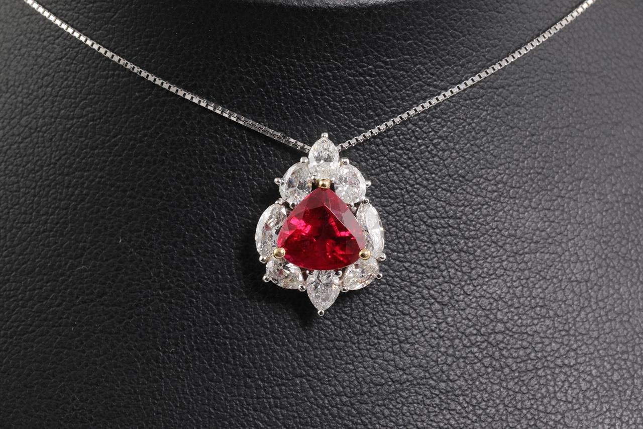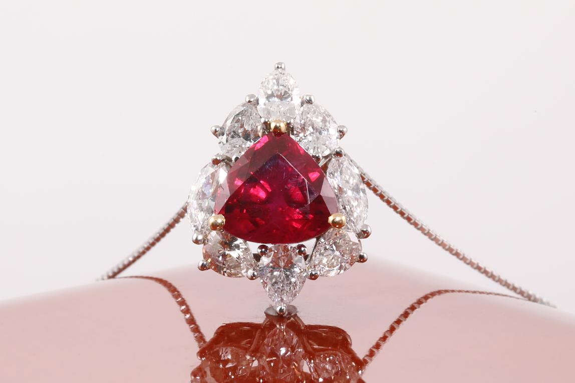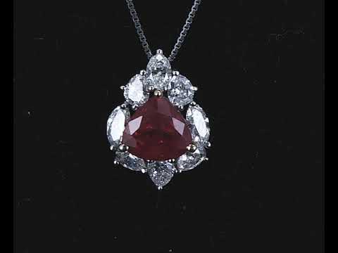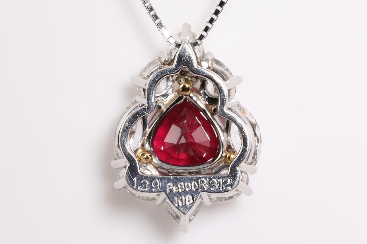 Ruby and Diamond pendant with a pear shape deep Ruby of 3.12ct (with GSL Description #AA 65331/1) and round & marquise cut Diamonds totalling 1.39cts (Estimated grading: G SI). 18ct yellow gold & Platinum with 44cm 18ct white gold adjustable chain. Weight: 5.2g. (Pre-owned)