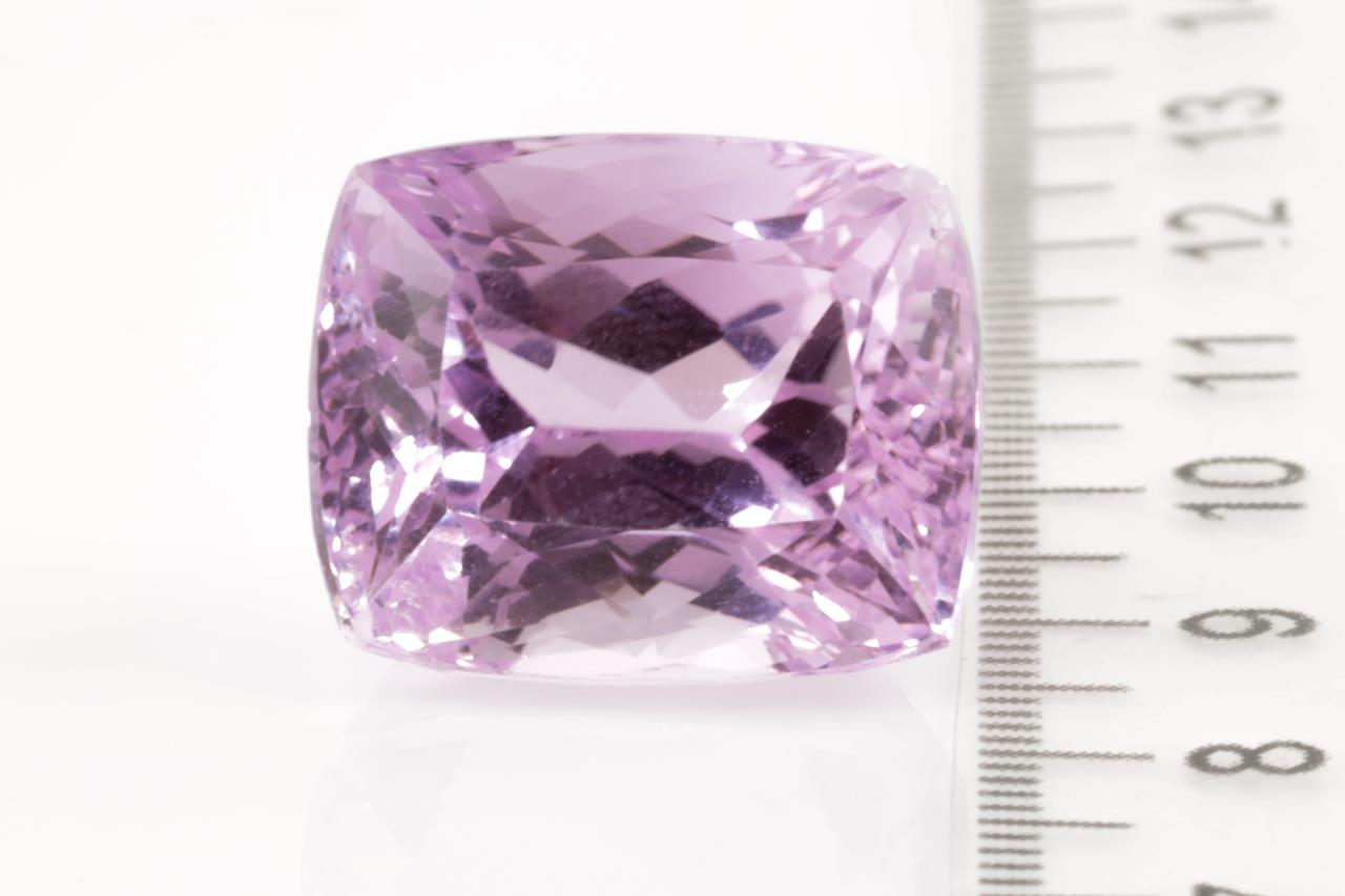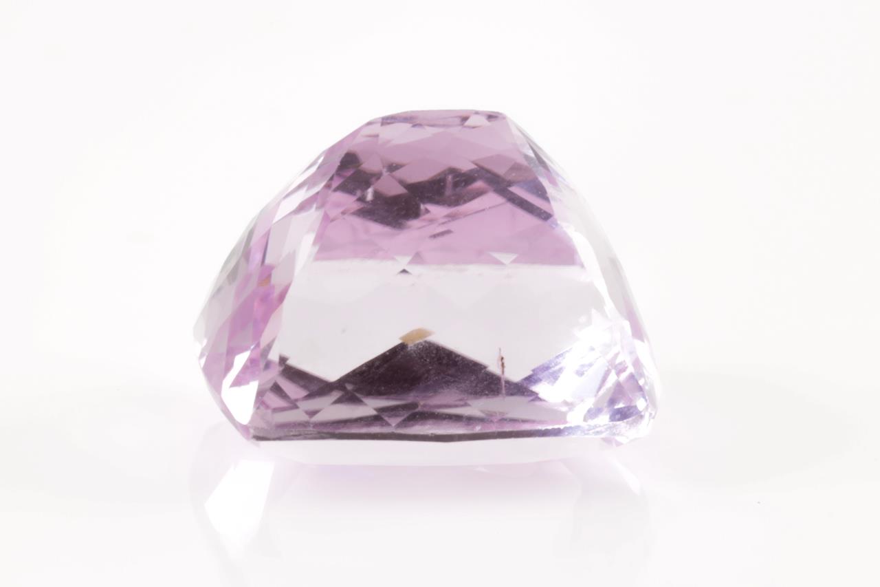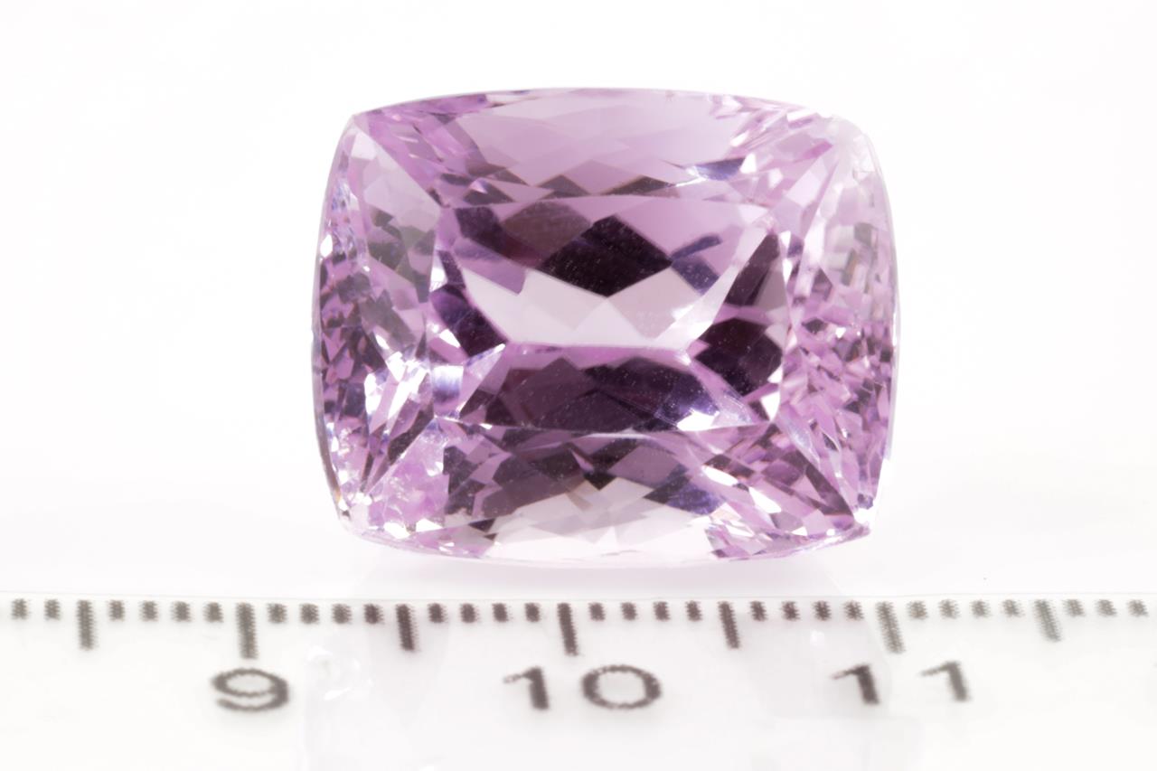 A loose cushion cut Kunzite of 31.30cts. Size 18.54 x 15.33 x 13.96mm. Note minor surface wear marks on girdle (Pre-owned)