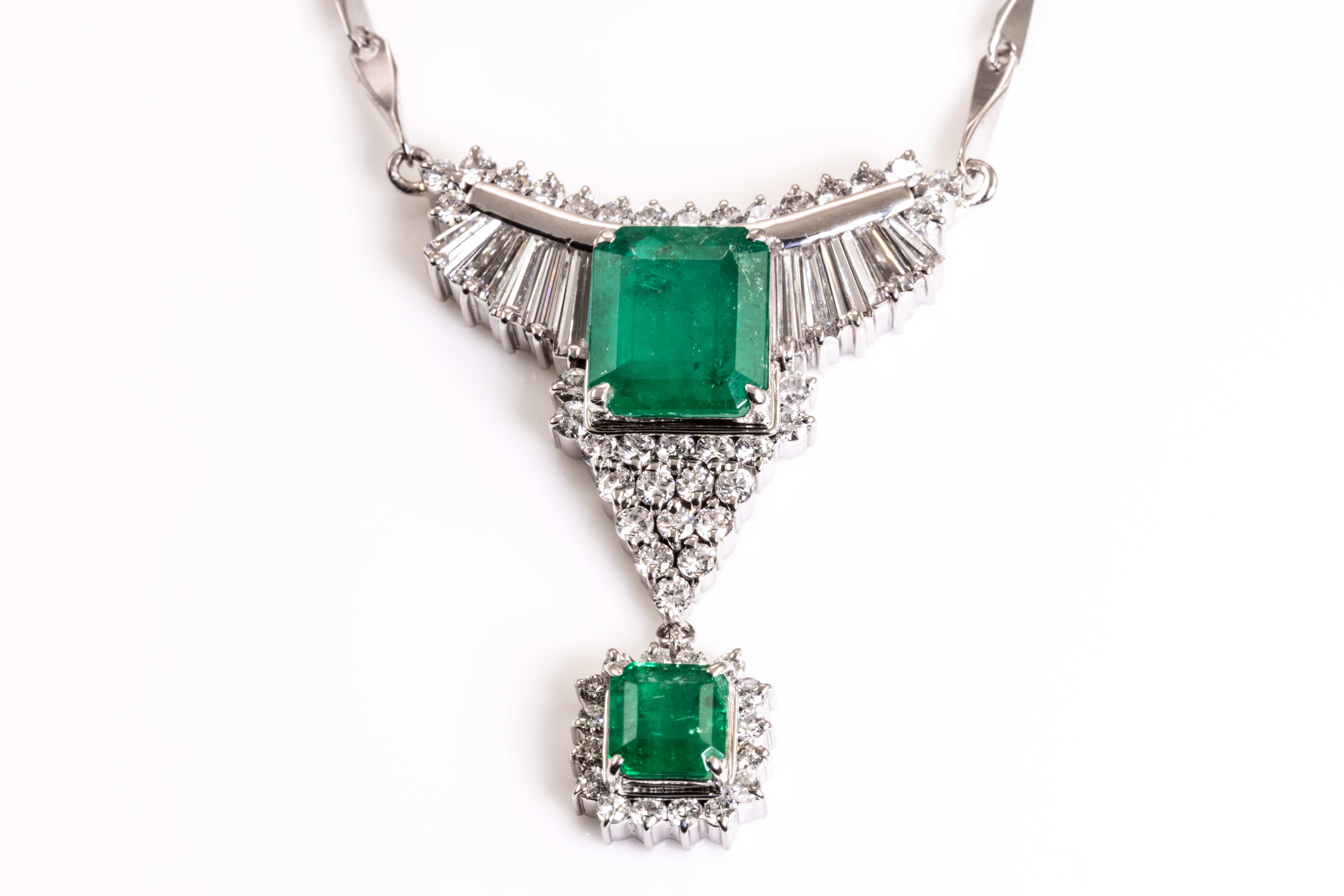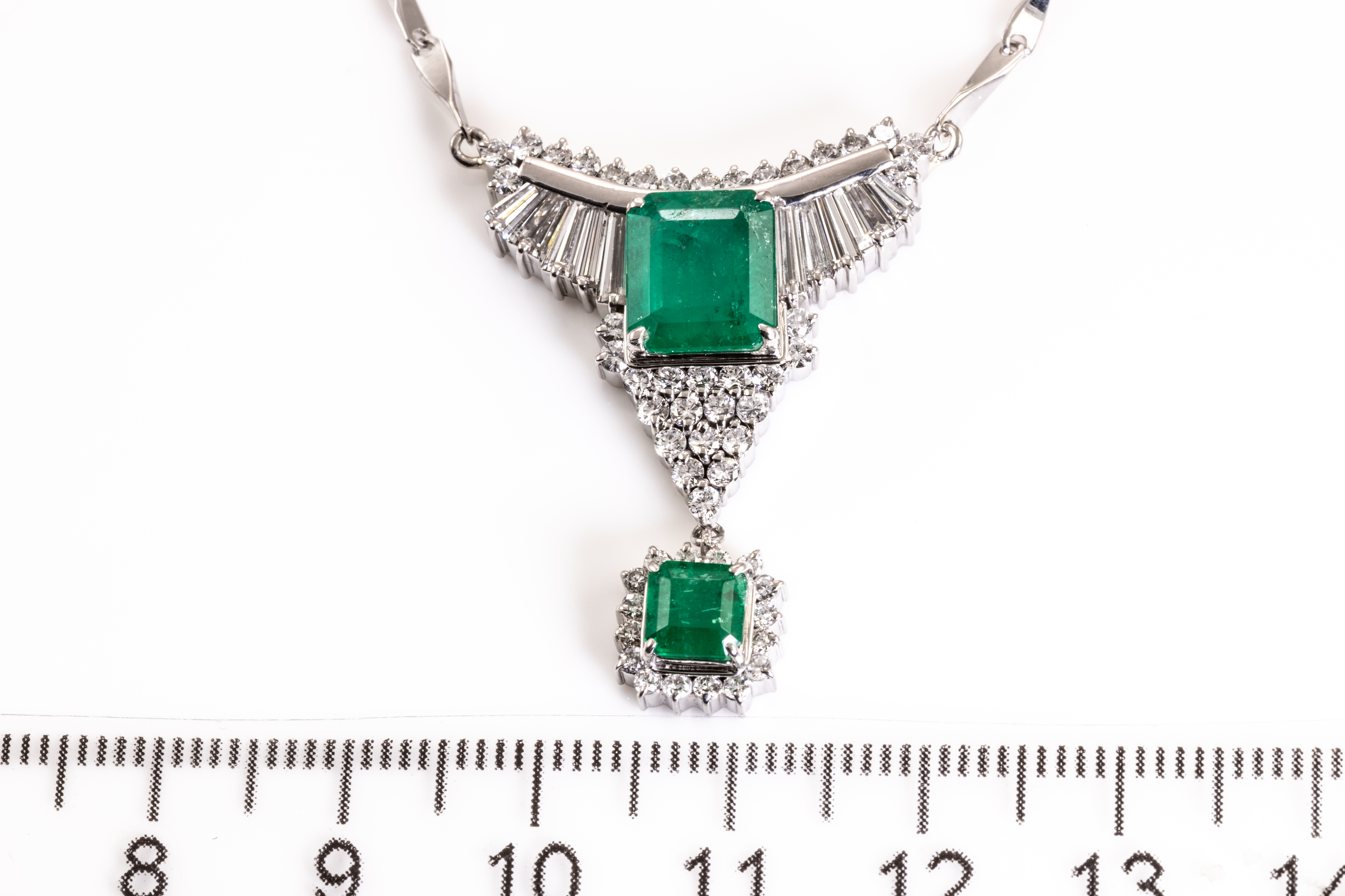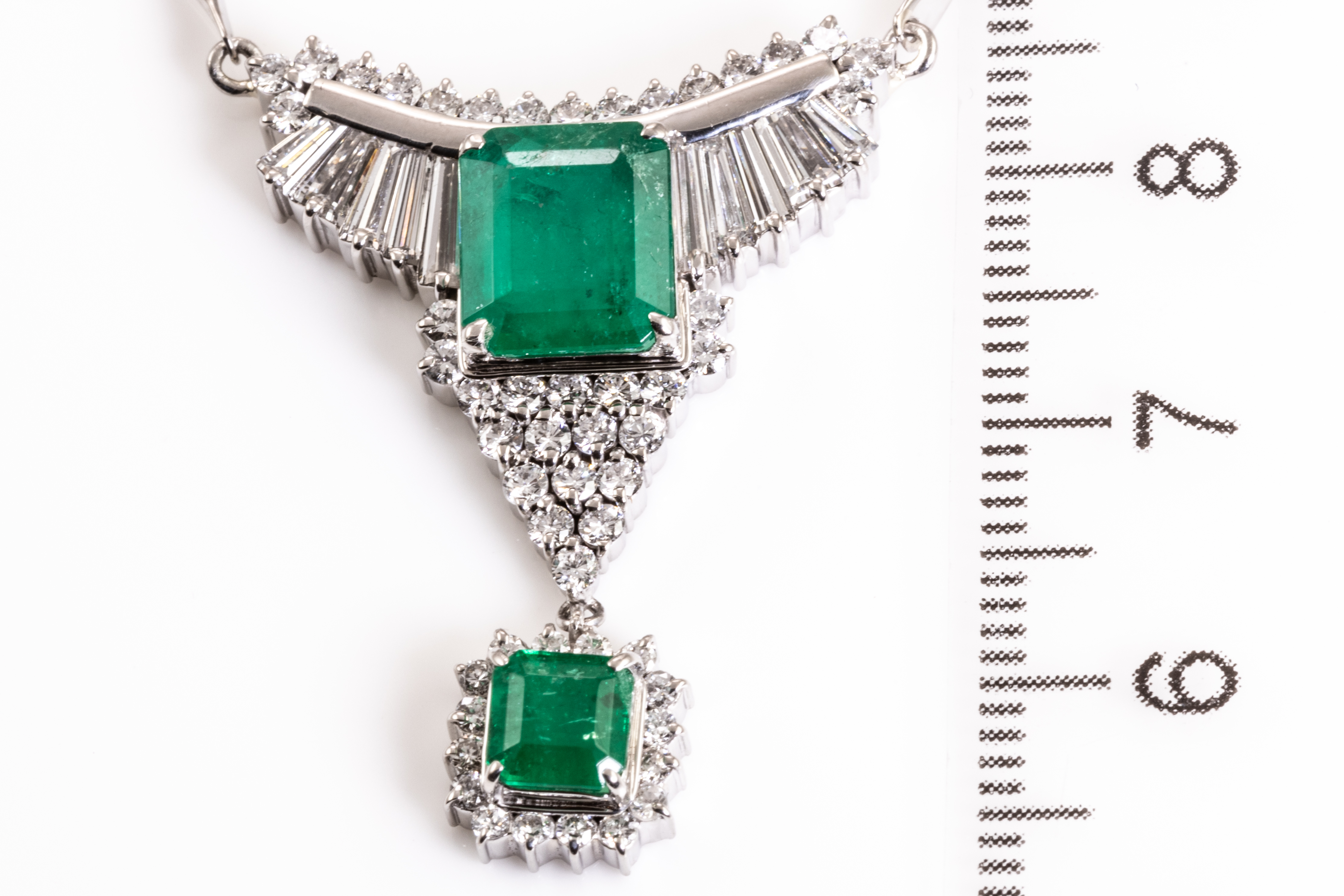 Emerald and Diamond necklace with emerald cut Emerald totalling 3.14ct and round & baguette cut Diamonds totalling 1.71cts (Estimated grading: G-H SI). Platinum. Length: 40cm. Weight: 15.6g. With certificate #415973. (Pre-owned)