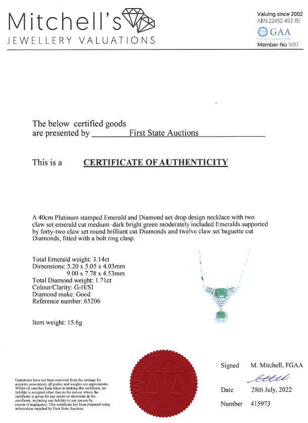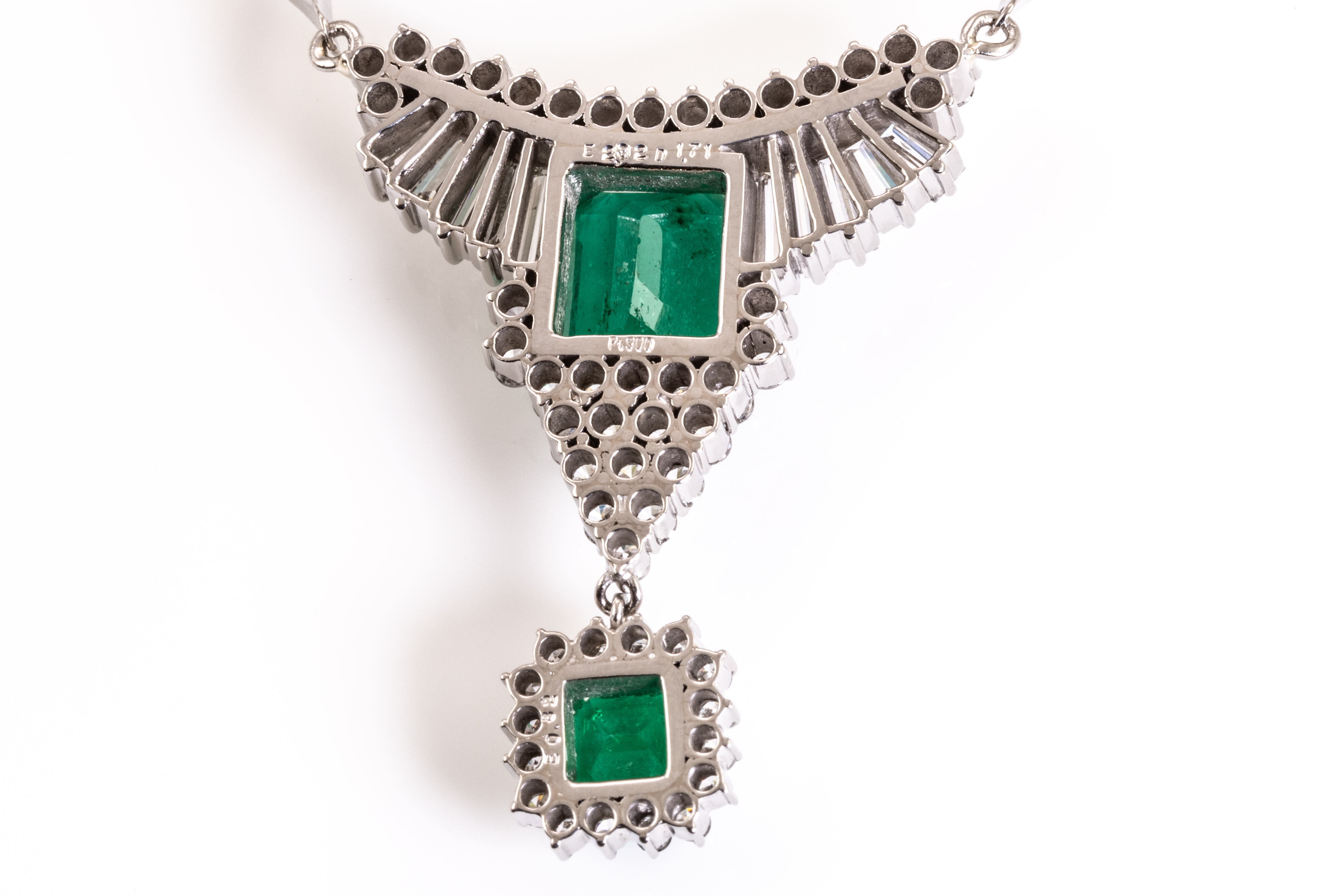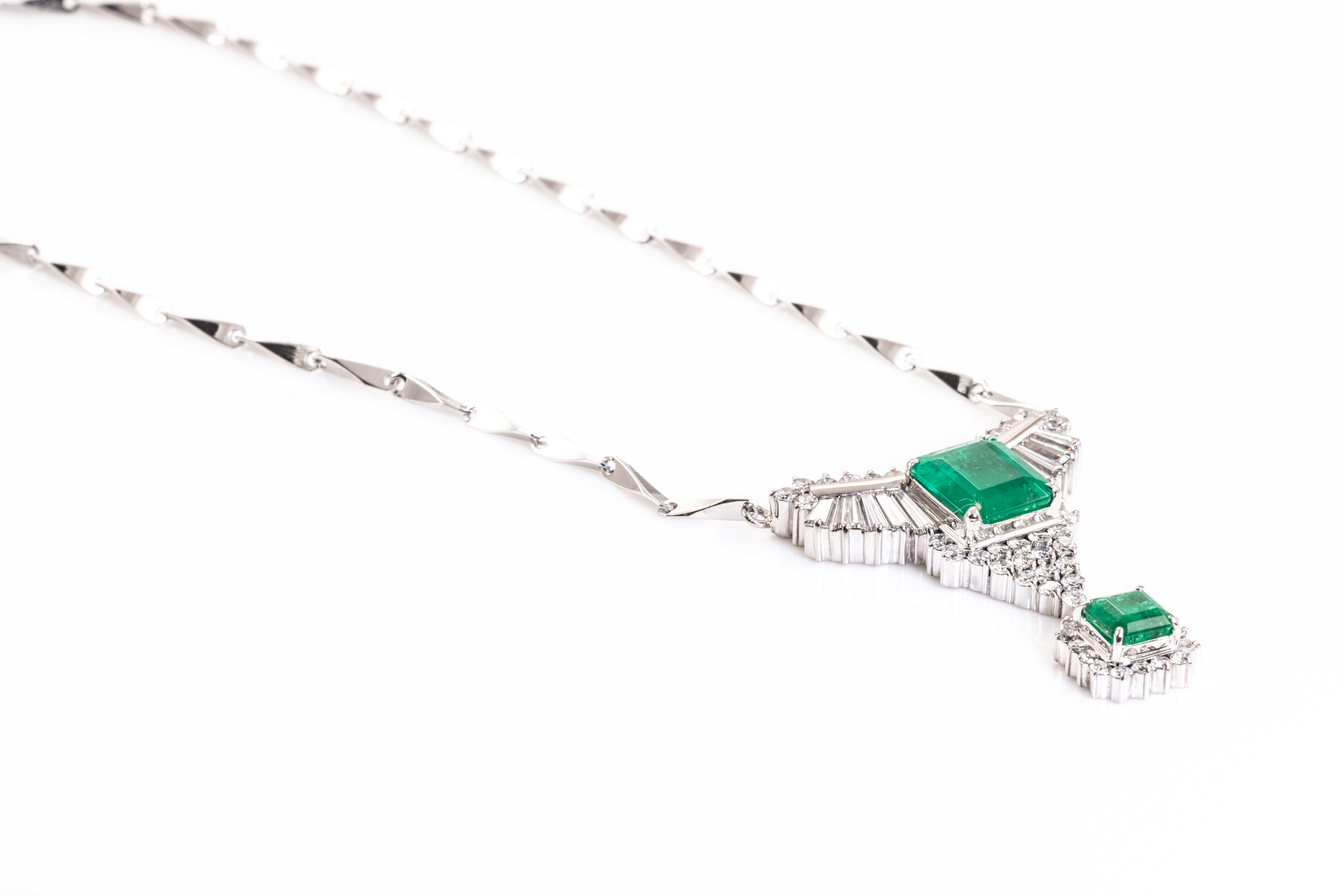 Emerald and Diamond necklace with emerald cut Emerald totalling 3.14ct and round & baguette cut Diamonds totalling 1.71cts (Estimated grading: G-H SI). Platinum. Length: 40cm. Weight: 15.6g. With certificate #415973. (Pre-owned)