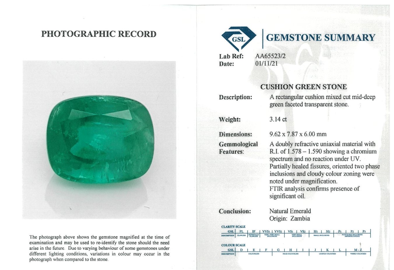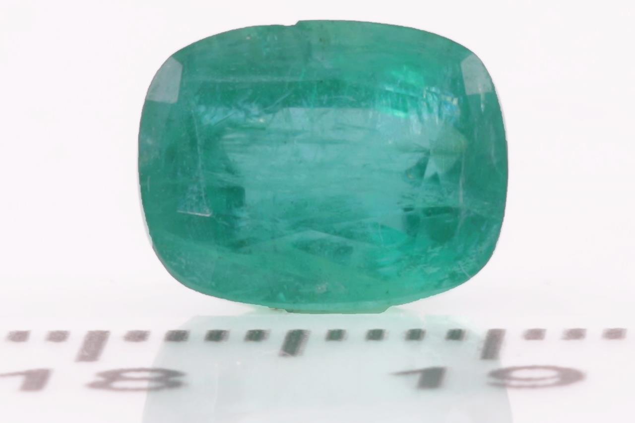 A loose Zambian cushion cut Emerald of 3.14ct (with GSL Gemstone summary report #AA65523/2). Dimensions: 9.62 x 7.87 x 6.00mm. (New)