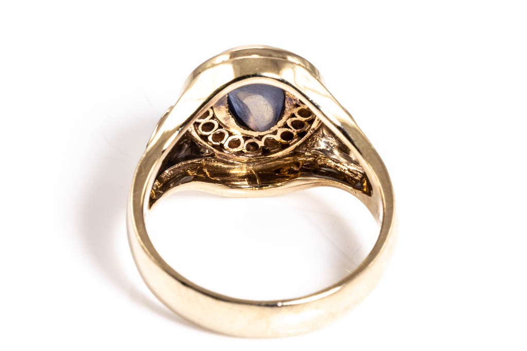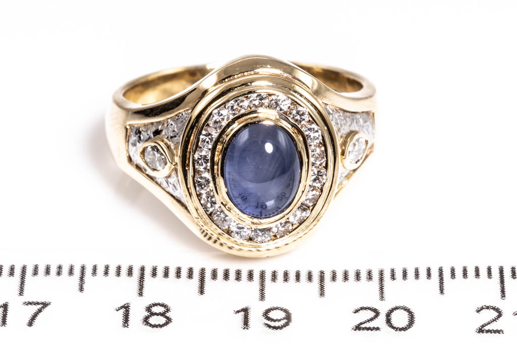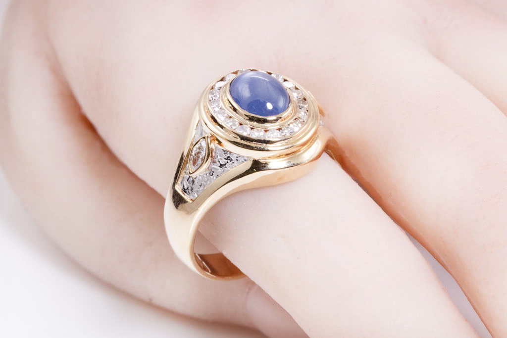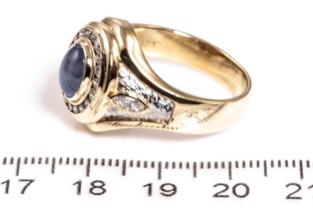 Sapphire and Diamond ring with cabochon cut blue Star Sapphire of 3.14ct and marquise cut & round Diamonds totalling 0.71ct (Estimated grading: H SI). 18ct yellow gold and platinum. Ring size U - ring resizing is not recommended. Weight: 12g. (Pre-owned)