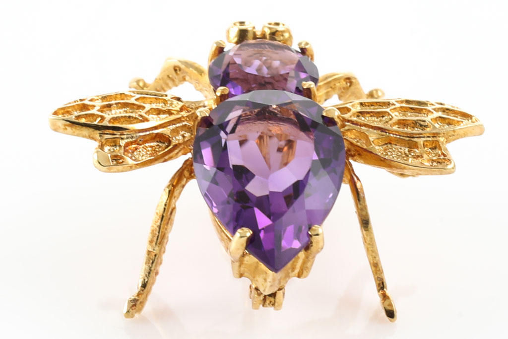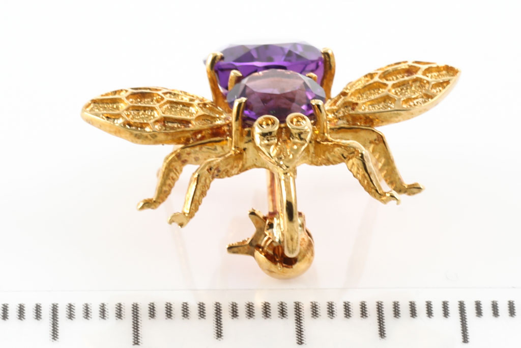Amethyst fly designed brooch/pendant with round & pear shape Amethyst of 3.16cts. 18ct yellow gold. Weight: 4.4g. (Pre-owned)