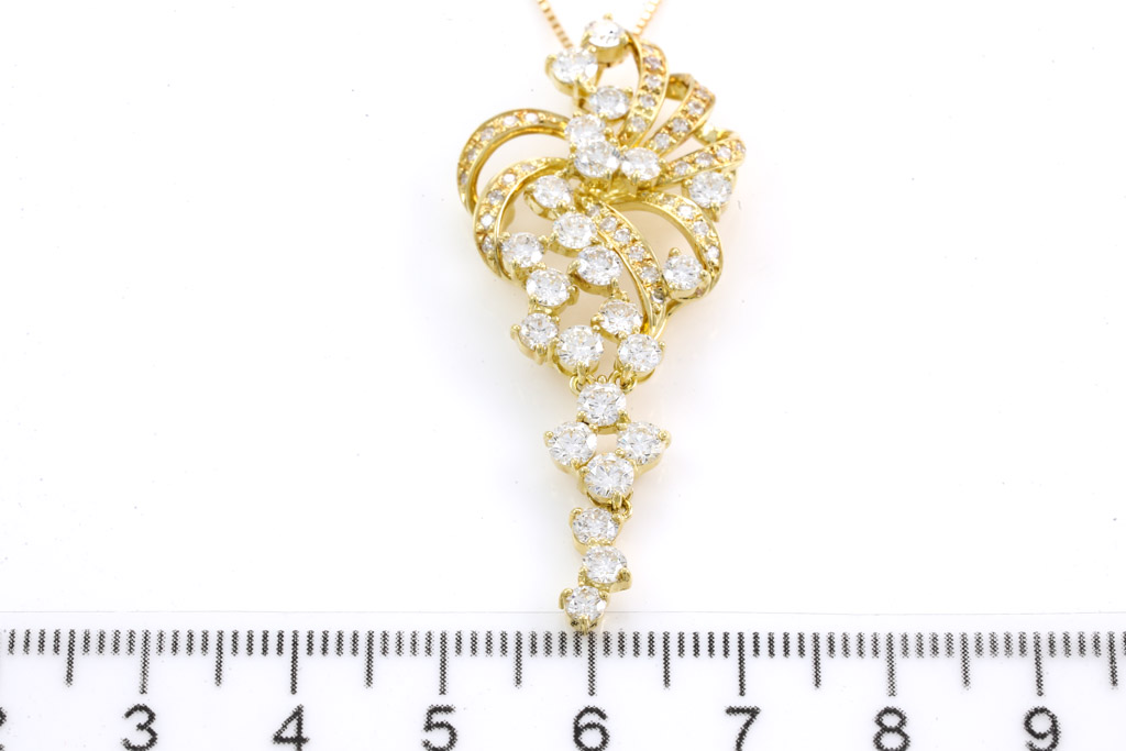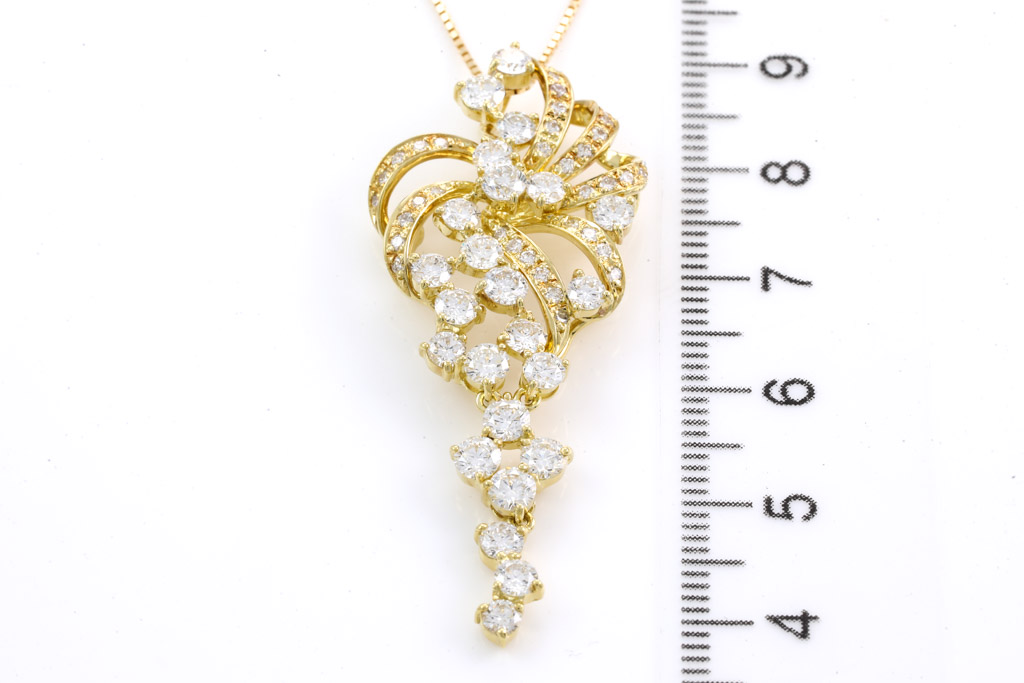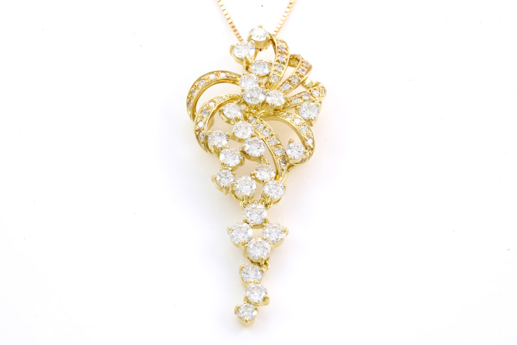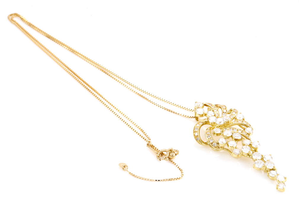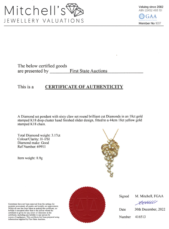 Diamond pendant with round Diamonds totalling 3.17cts (Estimated grading: H-I SI). 18ct yellow gold with 44cm adjustable chain. Weight: 8.9g. With Certificate #416513. (Pre-owned)