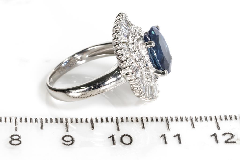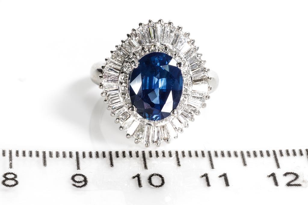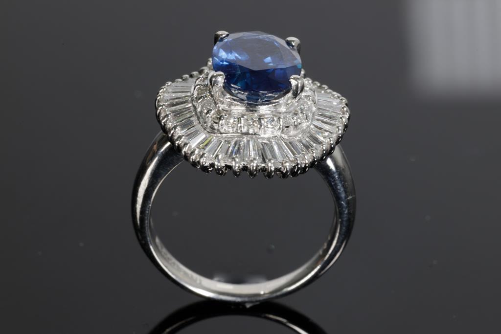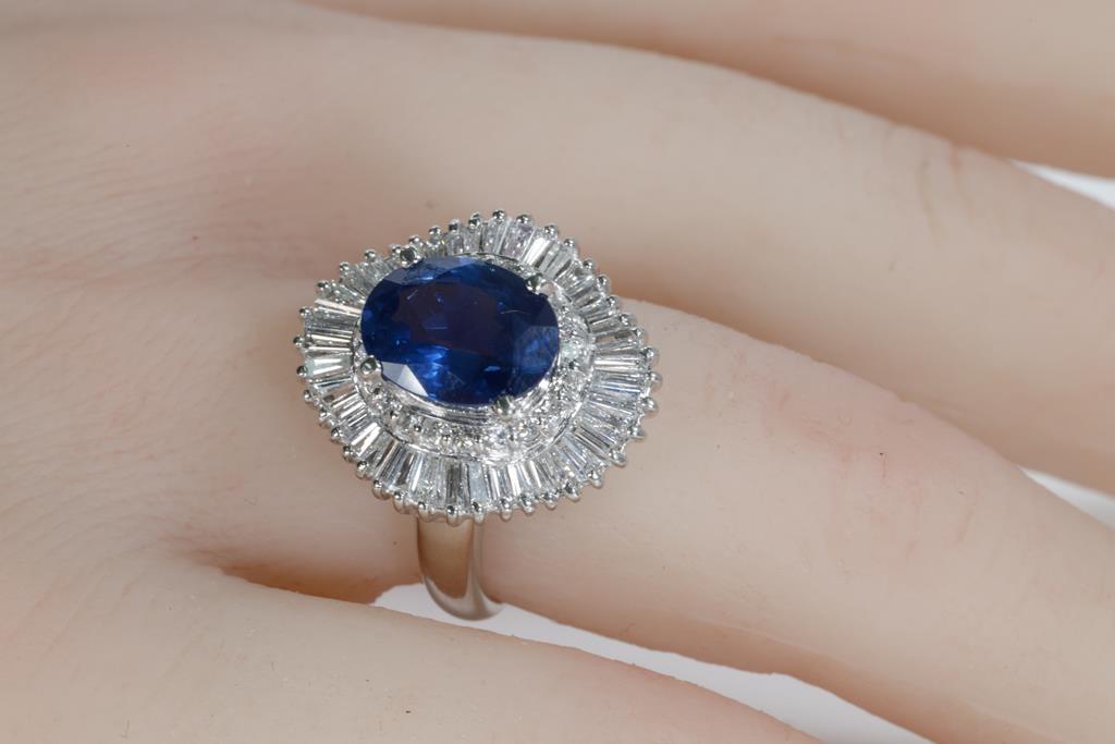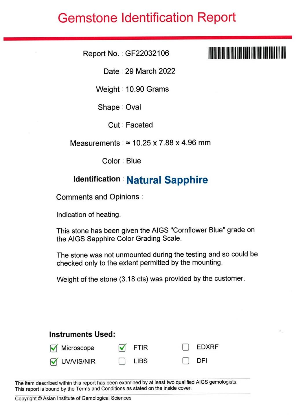 Sapphire and Diamond ring with oval shape Cornflower Blue Sapphire of 3.18ct and round and baguette cut Diamonds totalling 1.04ct (Estimated grading: G-H SI). Platinum. Ring size L. Weight: 10.9g. With AIGS certificate #GF22032106. (Pre-owned)