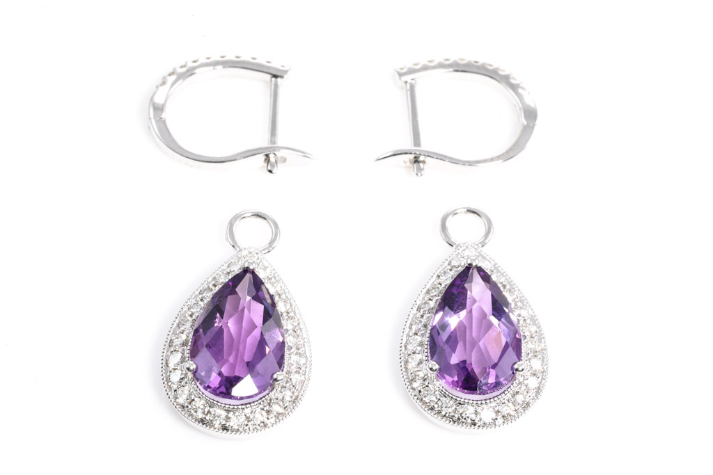 Amethyst and Diamond drop earrings (can be detached) with pear checkerboard cut Amethysts totalling 3.19cts and round Diamonds totalling 0.52cts (Estimated grading: I-J SI). 14ct white gold. Weight: 3.9g. (New).