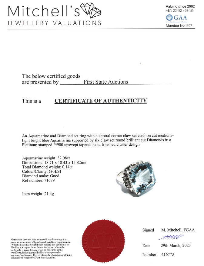 32.08ct Aquamarine and Diamond Ring | First State Auctions