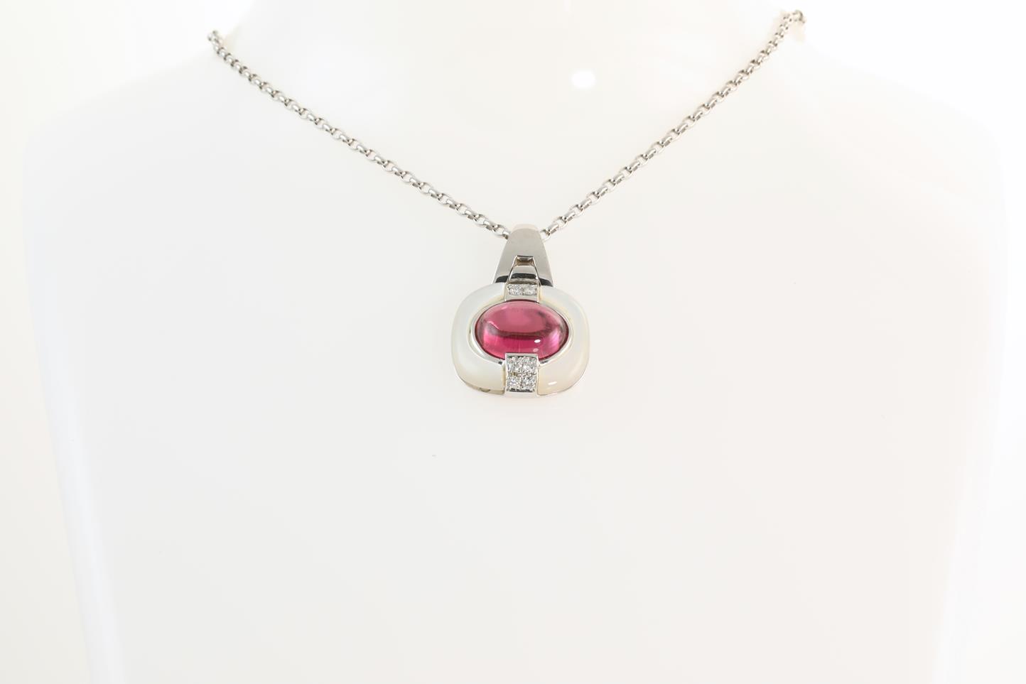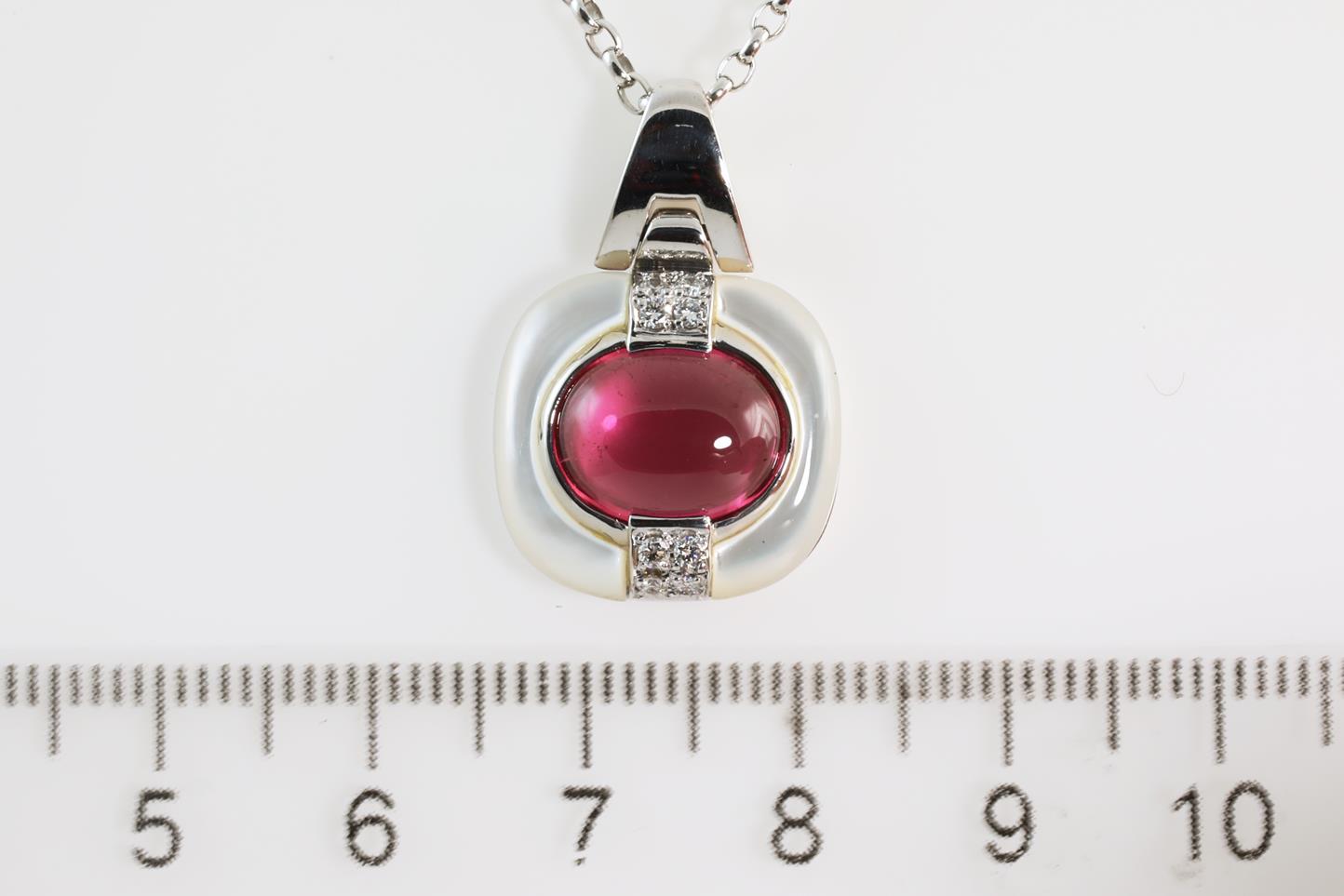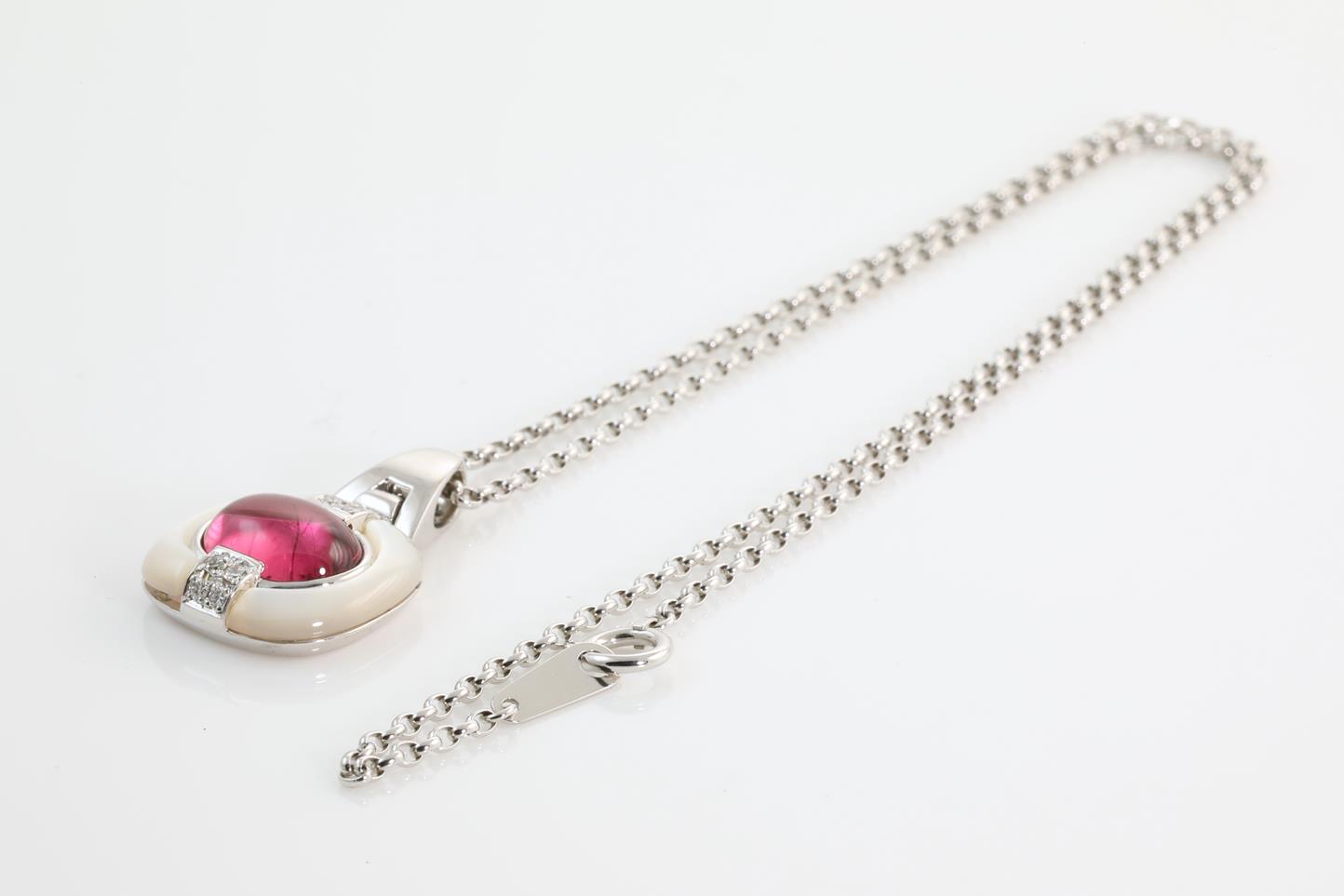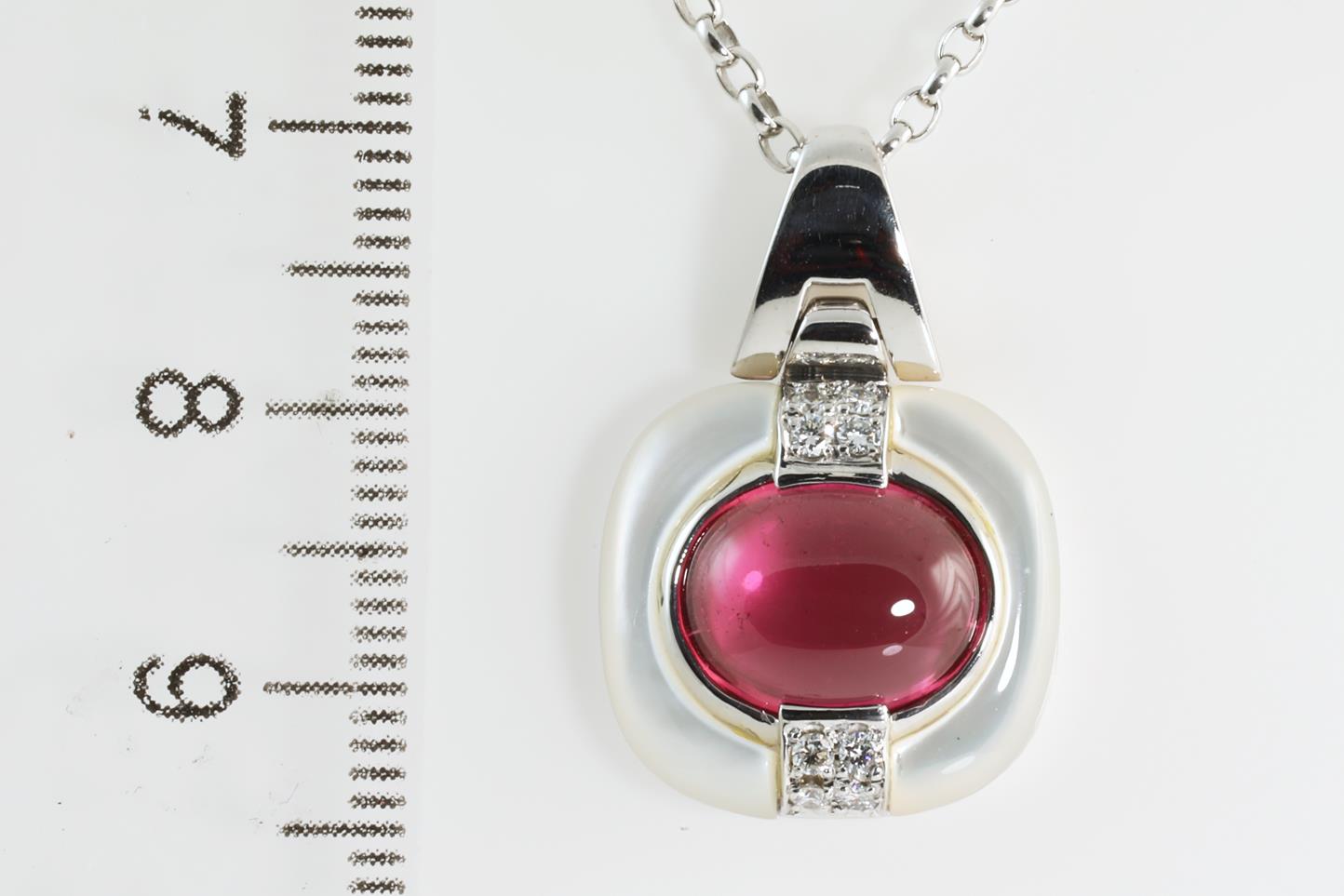 Tourmaline, Shell and Diamond pendant with Tourmaline of 3.21ct and Diamonds totalling 0.11cts. 18ct white gold with 18ct white gold 39cm chain. Weight: 9.1g (Pre-owned)