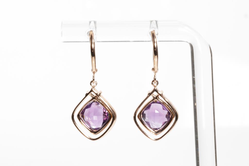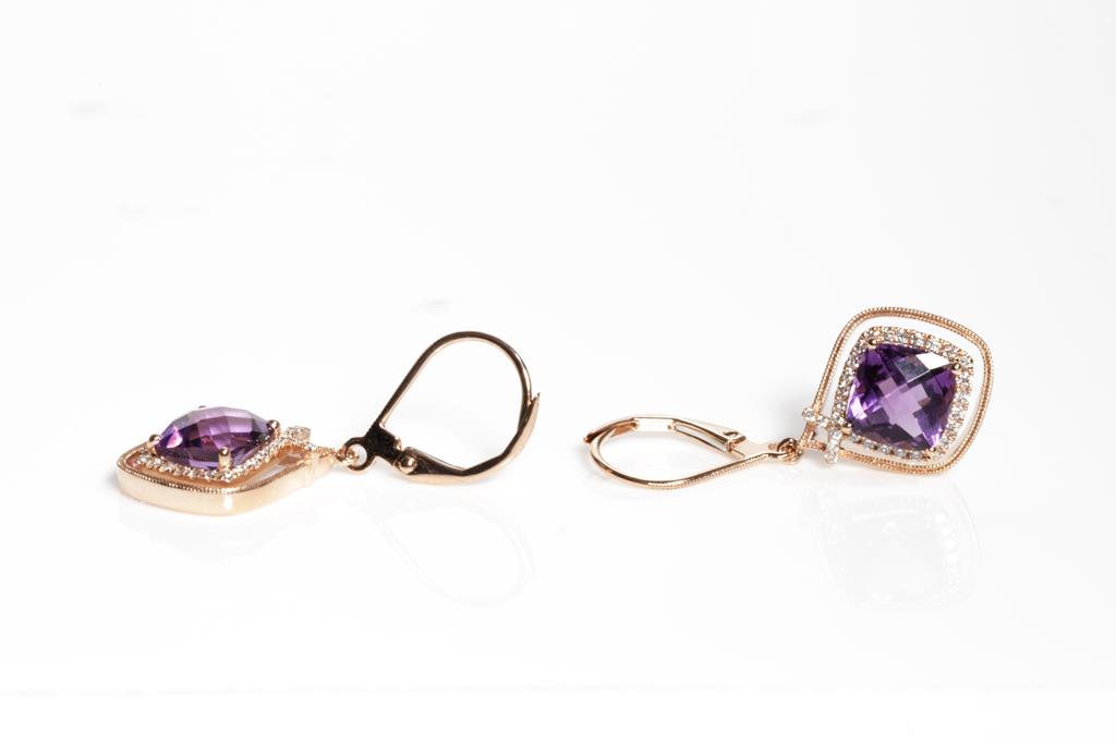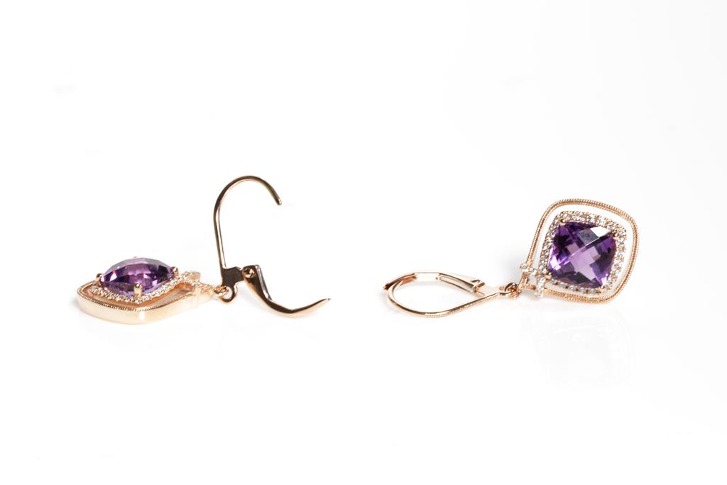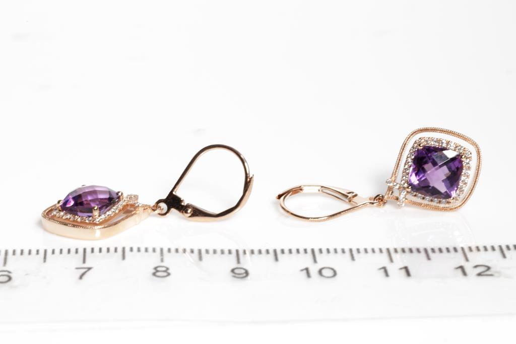 Amethyst and Diamond leverback earrings with cushion Amethyst totalling 3.22cts and round Diamonds totalling 0.22cts 14ct rose gold. Weight: 3.3g. (New)