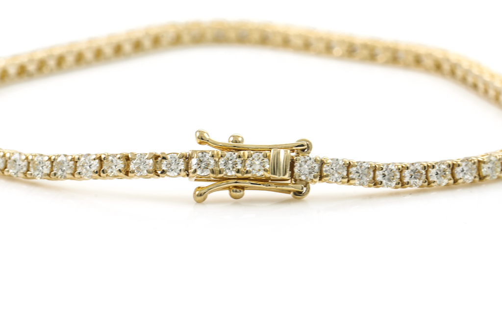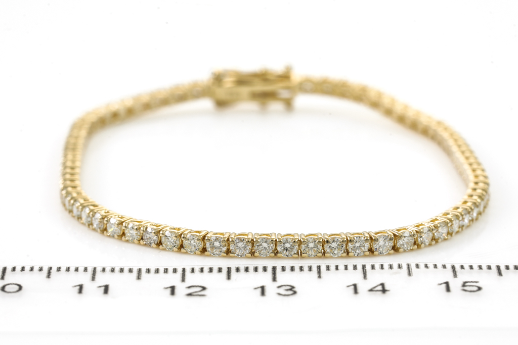 Diamond tennis bracelet with 69 round Diamonds totalling 3.22cts (Estimated grading: J-K SI). 18ct yellow gold. Length: 18cm. Weight: 8.4g. With Certificate #416279. (New)