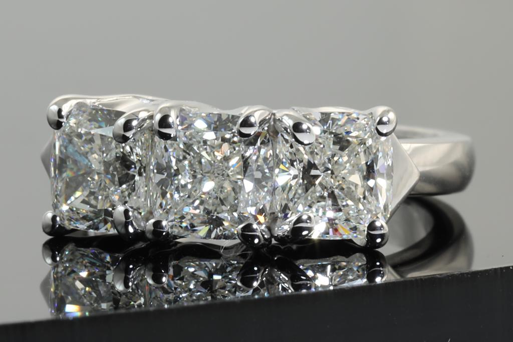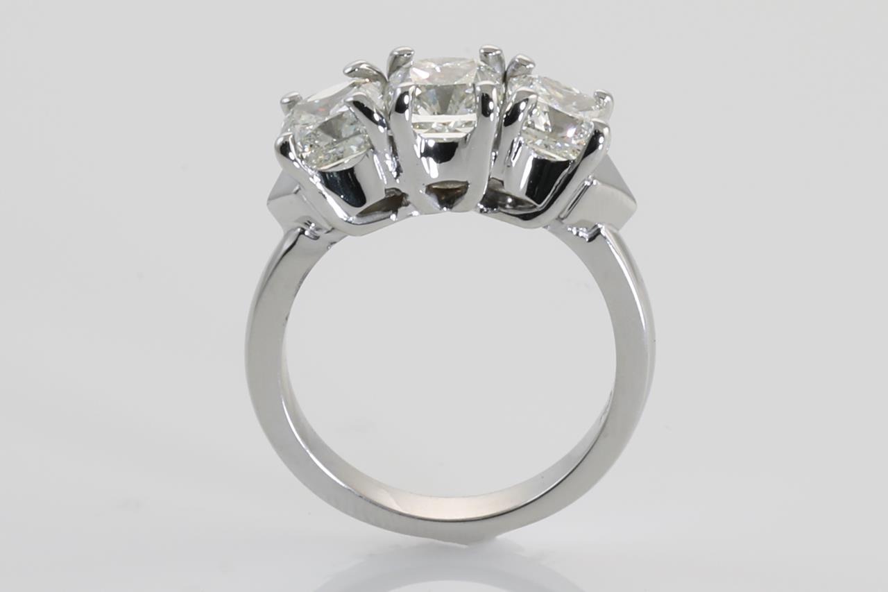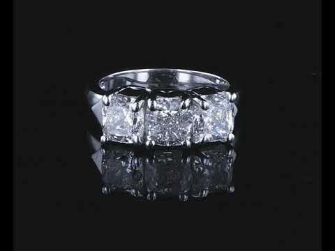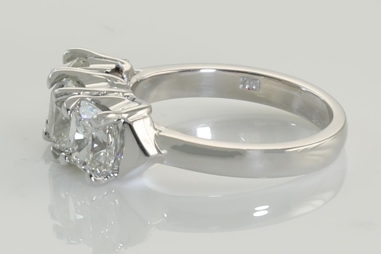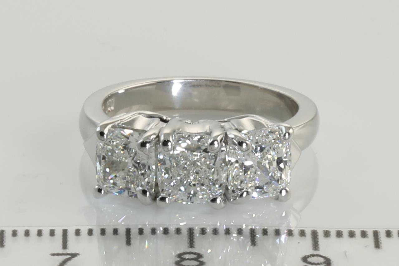 Diamond Trilogy ring with Cushion Cut Diamond of 1.21ct (with GIA report graded as H SI2 # 5212438465) and 2 shoulder Cushion Cut Diamonds totalling 2.02cts (both with GIA reports graded as I SI1 #5212438350, 2213350272). 18ct white gold. Ring size: K. Weight: 7.9g (New)