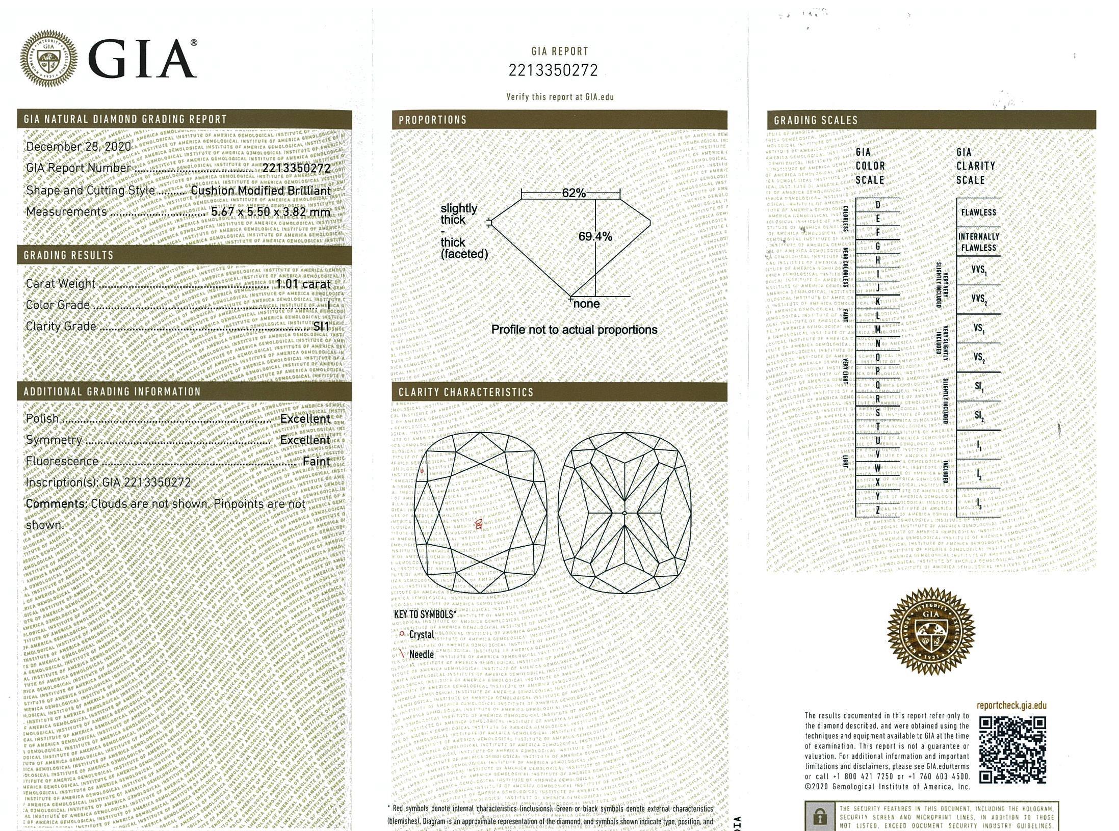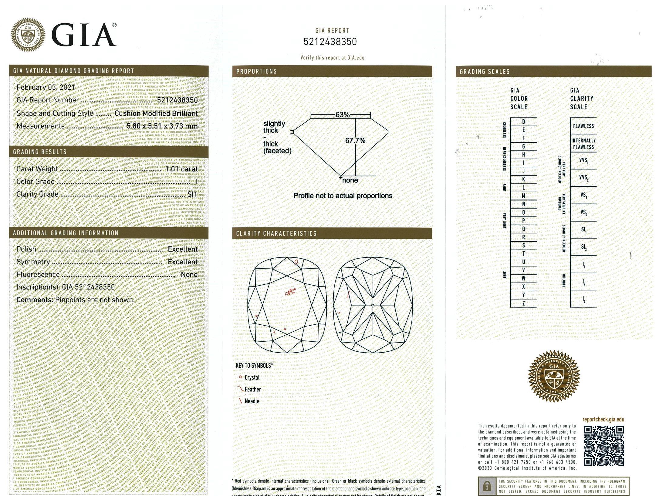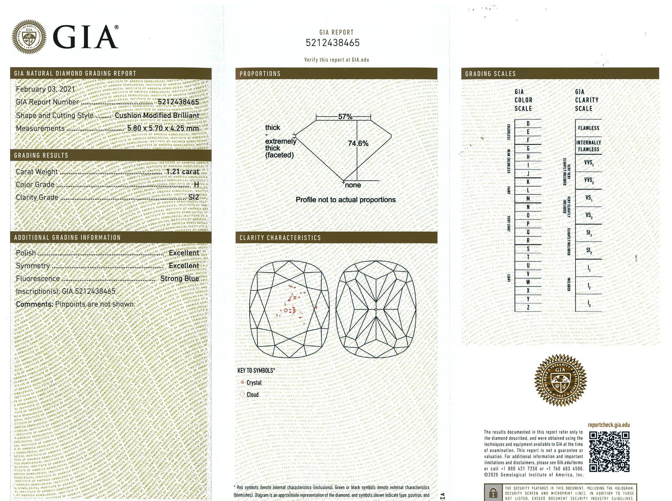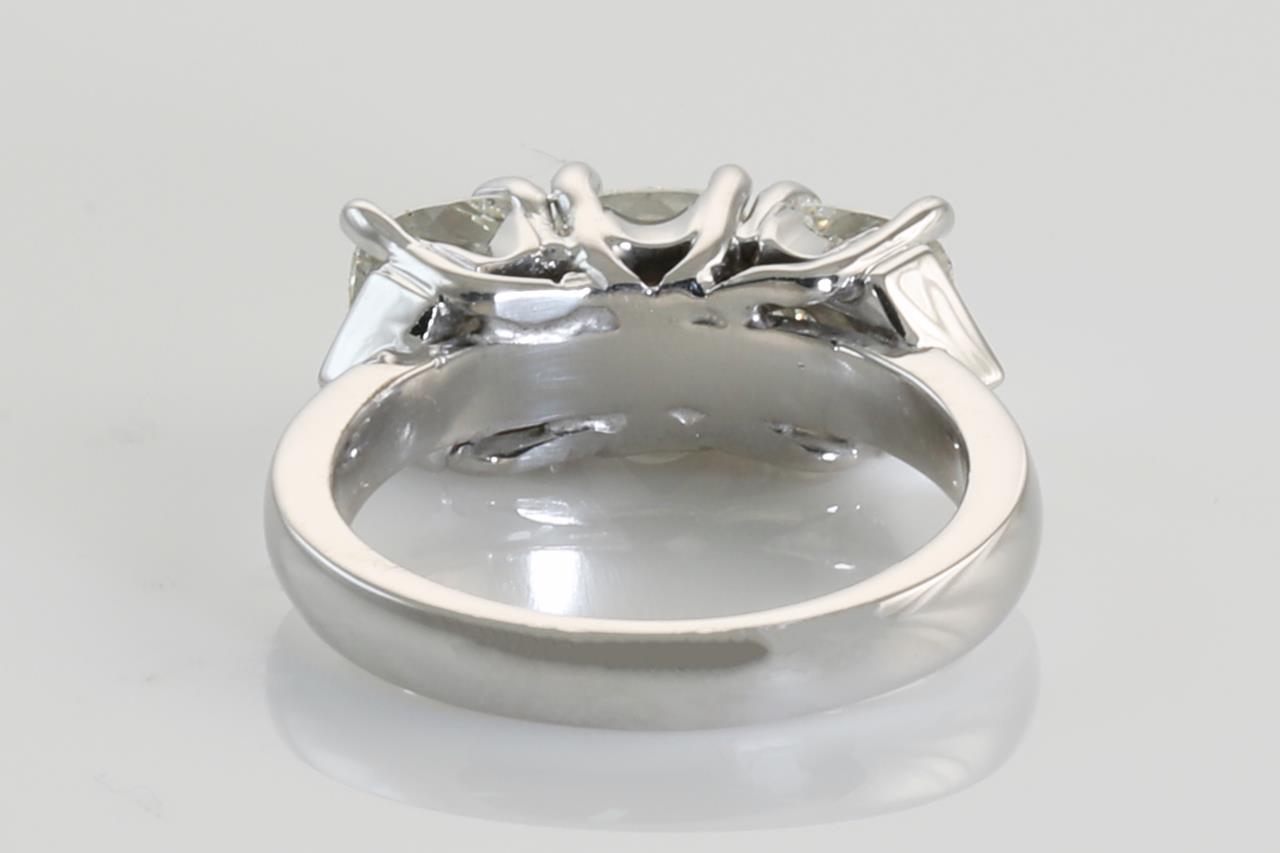 Diamond Trilogy ring with Cushion Cut Diamond of 1.21ct (with GIA report graded as H SI2 # 5212438465) and 2 shoulder Cushion Cut Diamonds totalling 2.02cts (both with GIA reports graded as I SI1 #5212438350, 2213350272). 18ct white gold. Ring size: K. Weight: 7.9g (New)