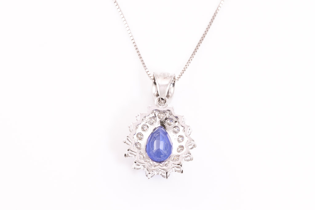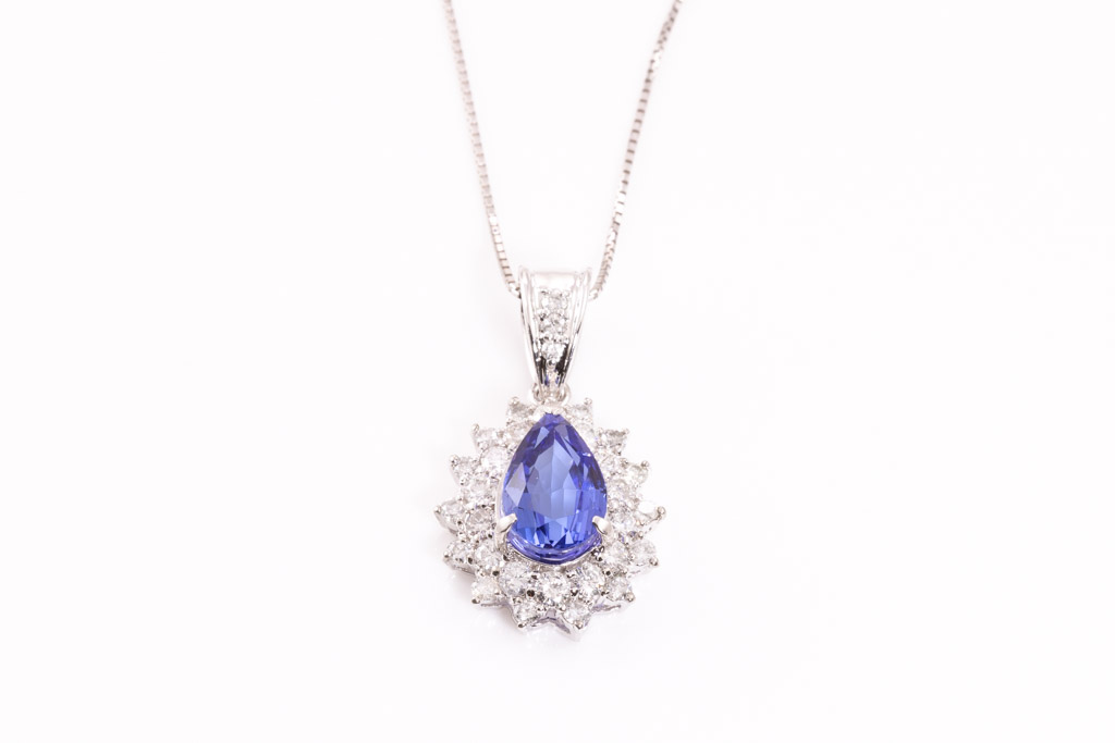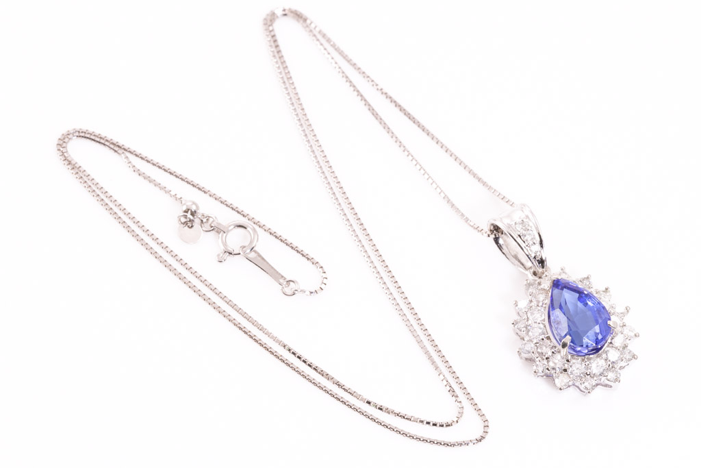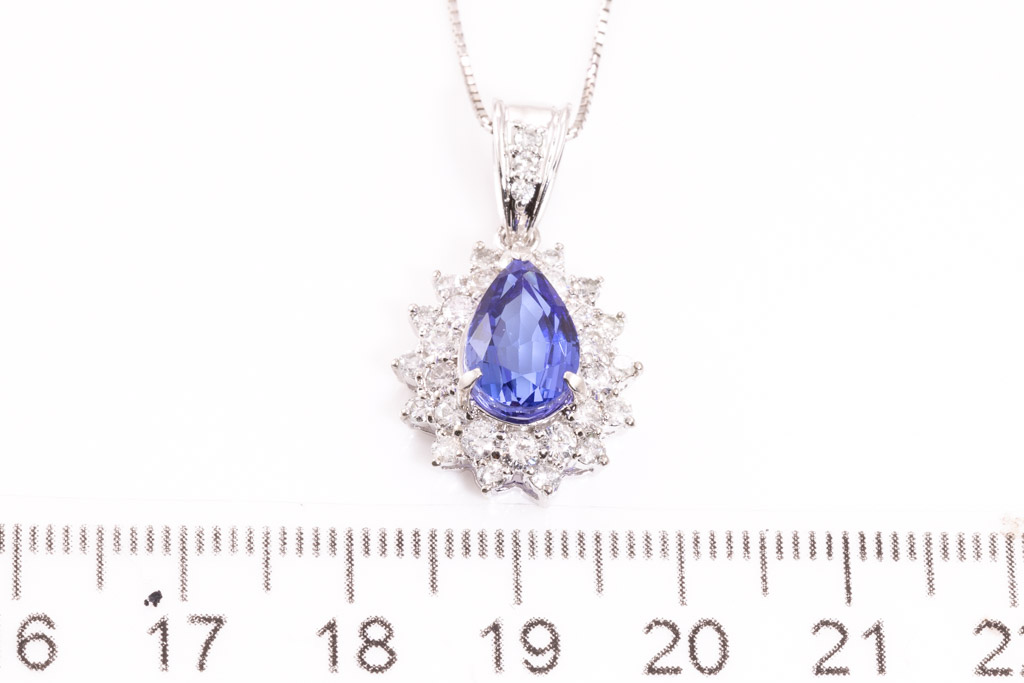 Tanzanite and Diamond pendant with pear shape Tanzanite of 3.23ct and round Diamonds totalling 0.97cts (Estimated grading: H-I SI). Platinum with 44cm 18ct white gold adjustable chain. Weight: 7.0g. (Pre-owned)