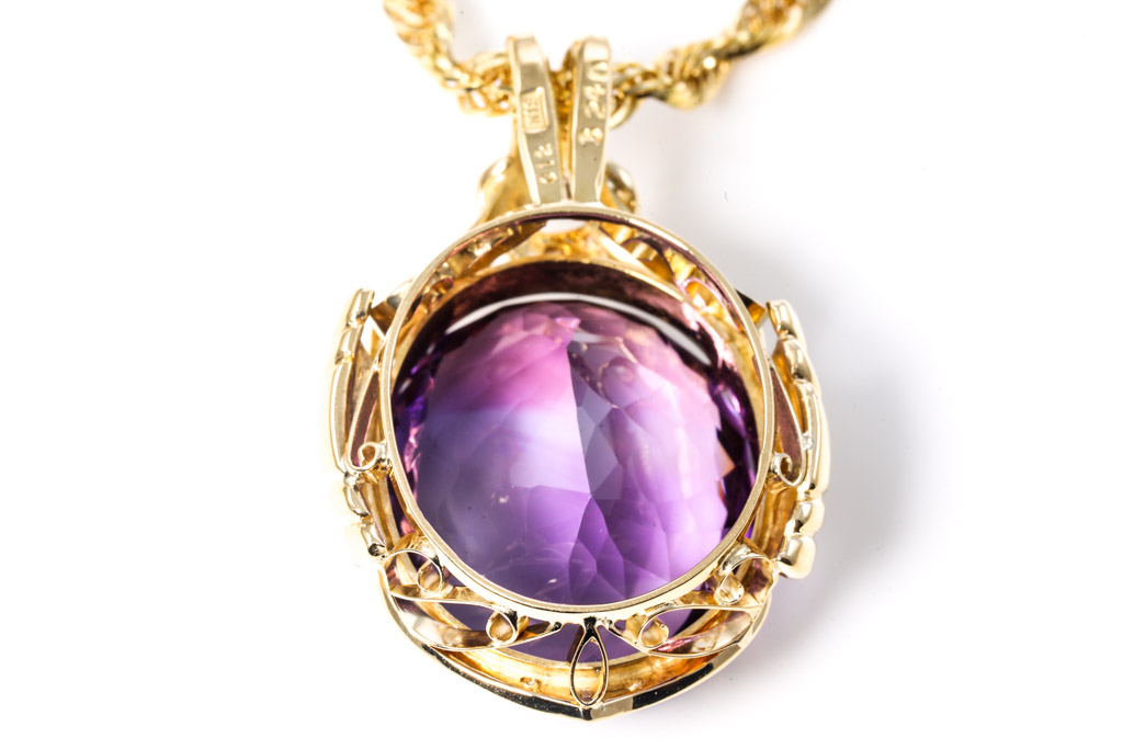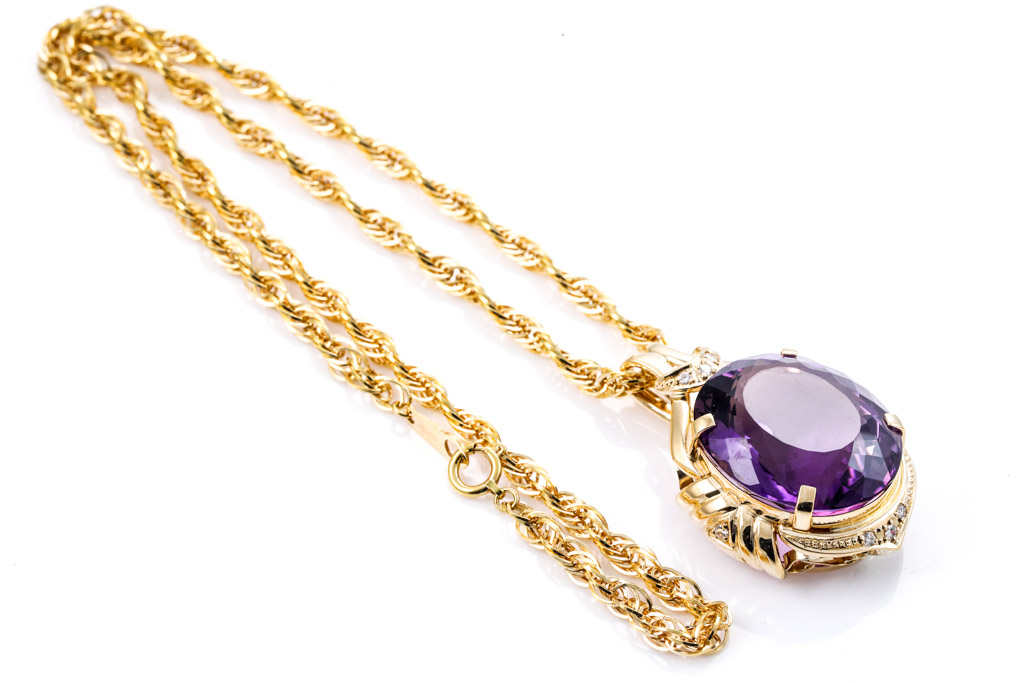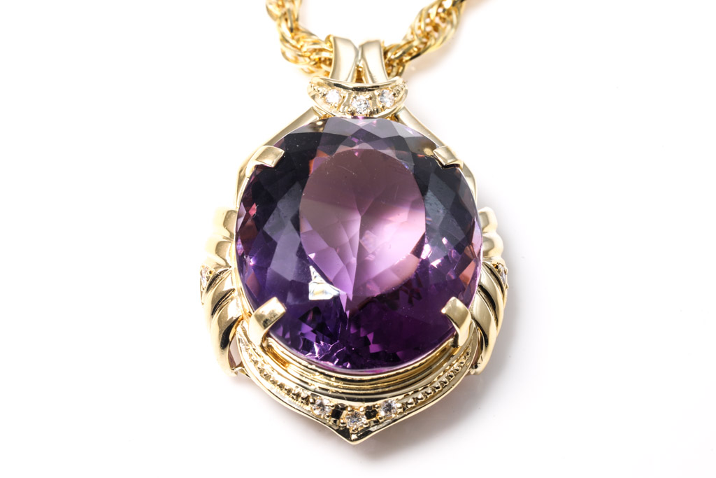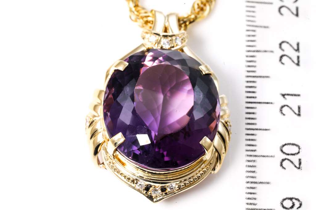 Amethyst and Diamond pendant with oval shape Amethyst of 32.40ct and Diamonds totalling 0.12cts. 18ct yellow gold with 18ct yellow gold 42cm chain. Weight: 26.6g. (Pre-owned)