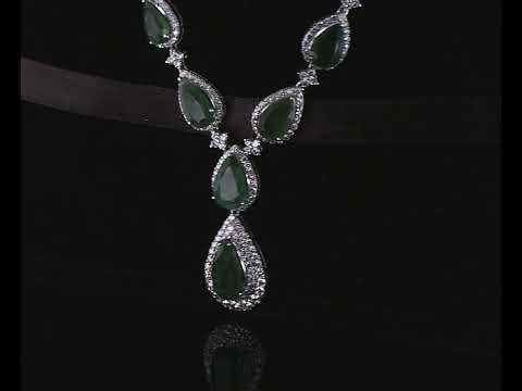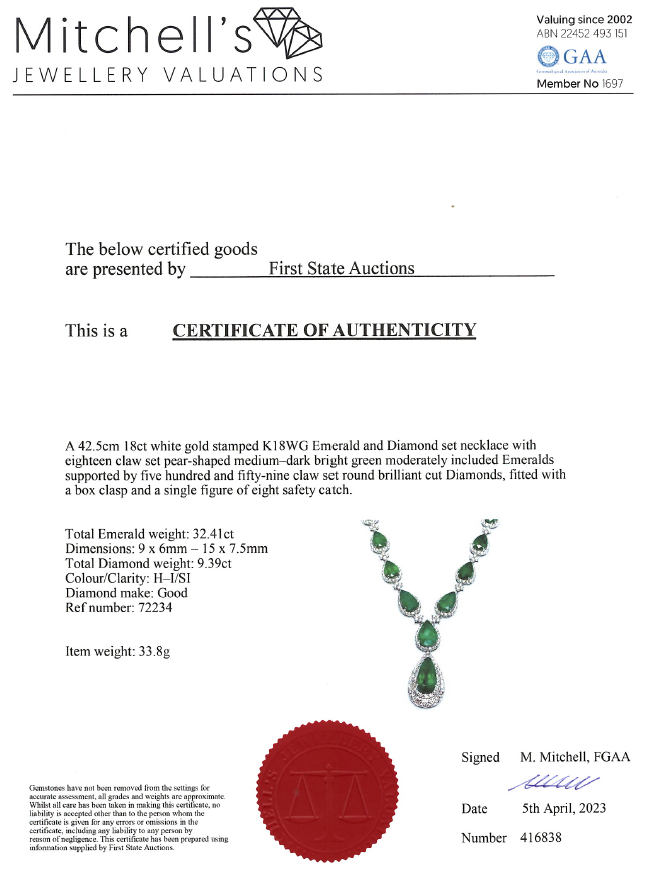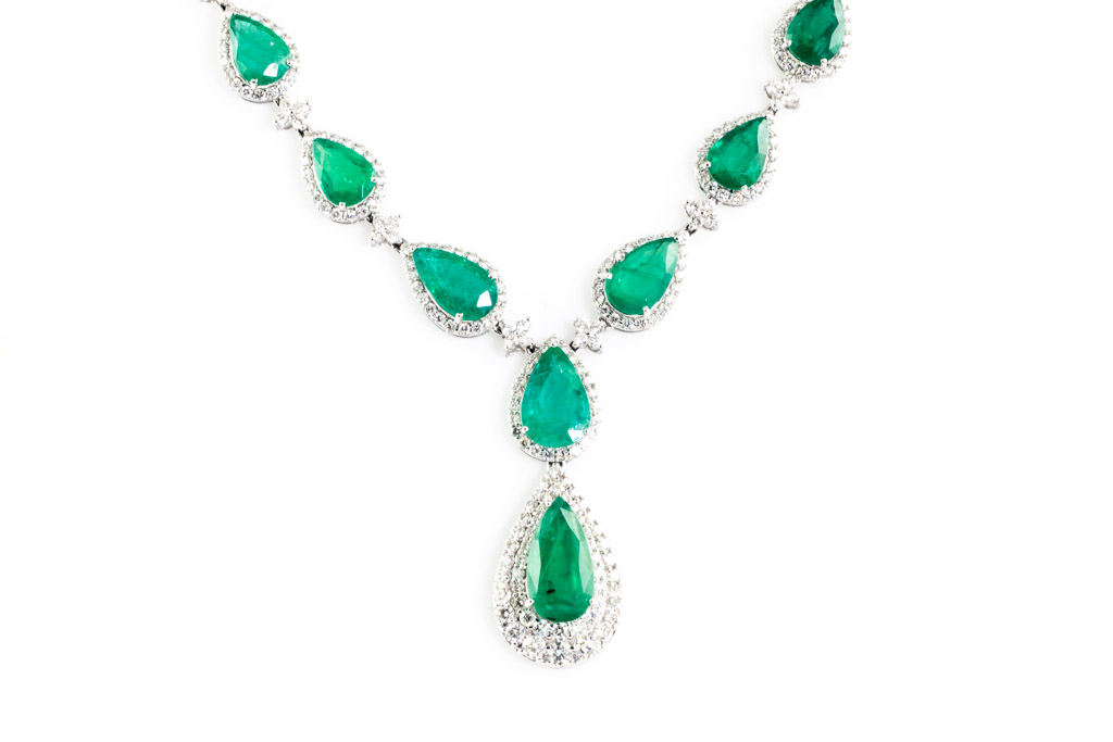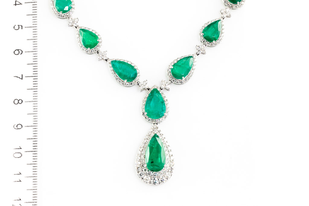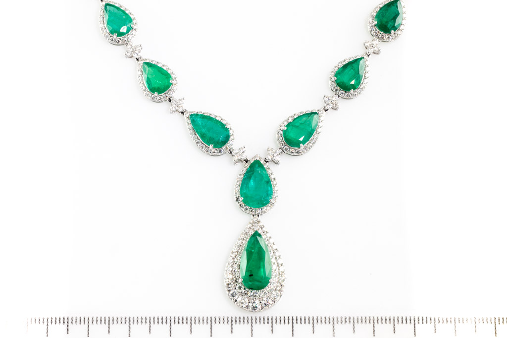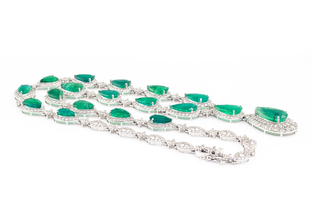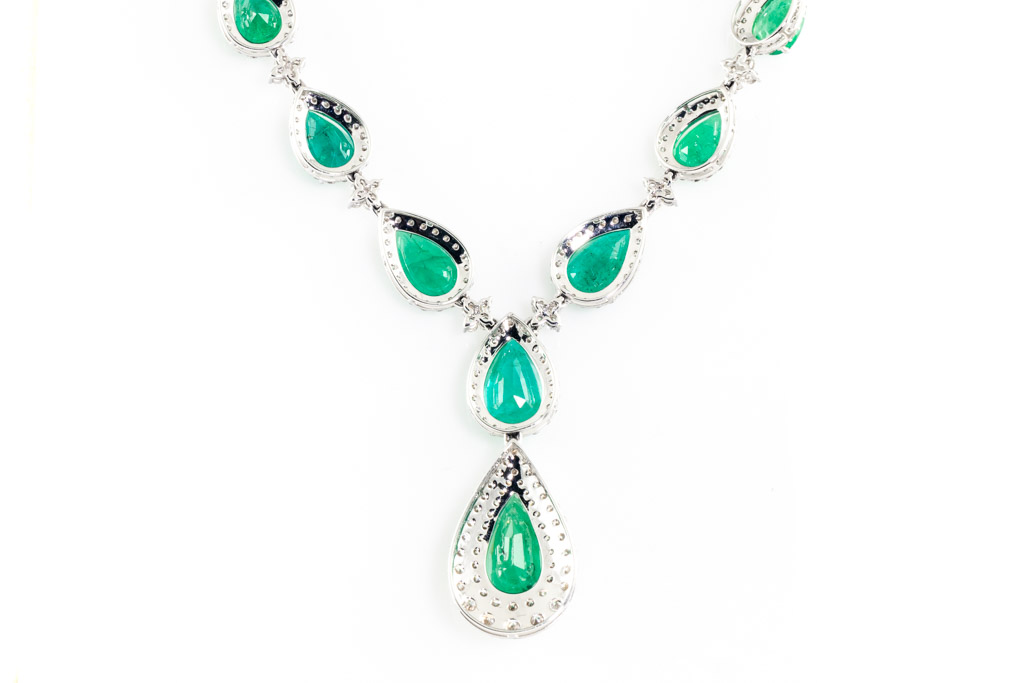 Emerald and Diamond necklace with pear shape Emeralds totalling 32.41cts and round Diamonds totalling 9.39cts (Estimated grading: H-I SI). 18ct white gold. Length: 42.5cm. Weight: 33.8g. With certificate #416838. (Pre-owned)