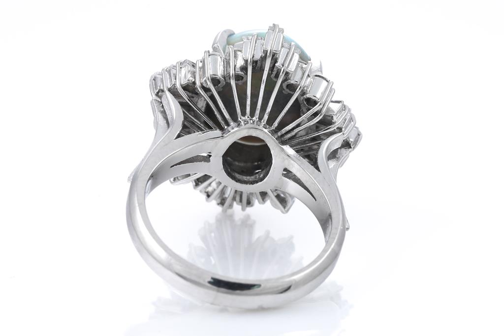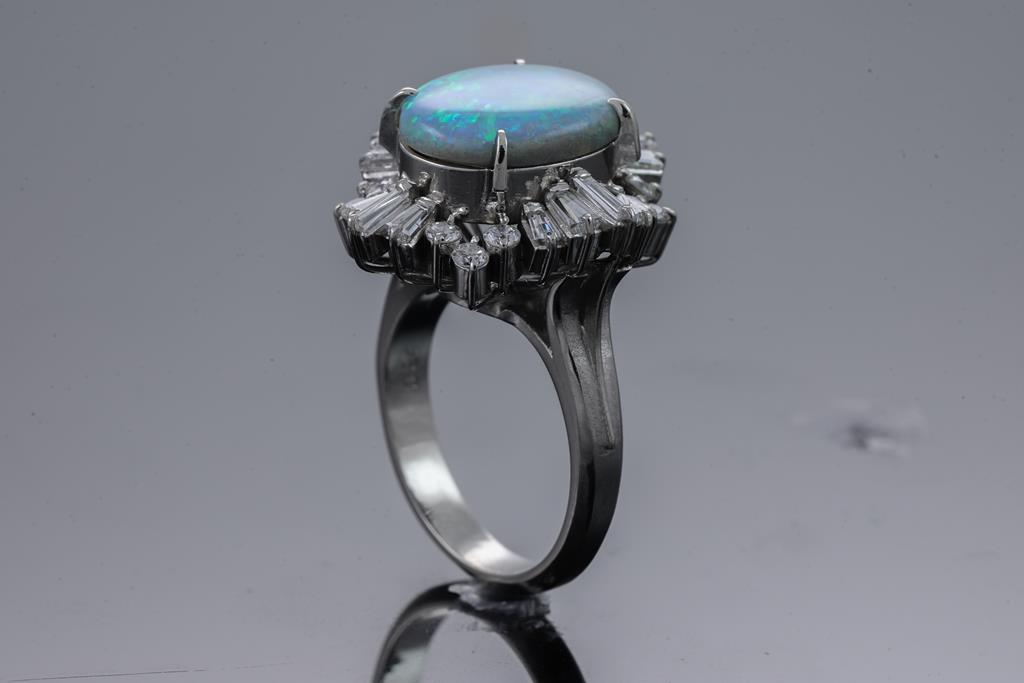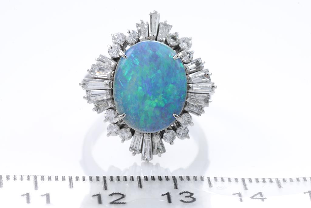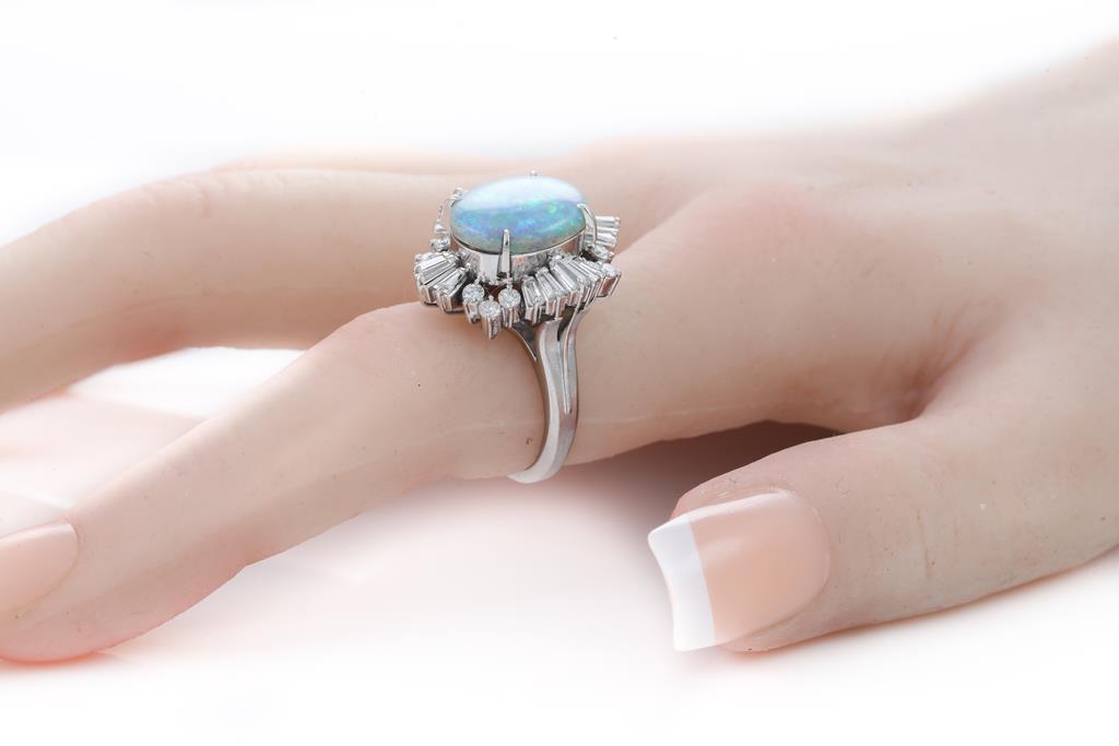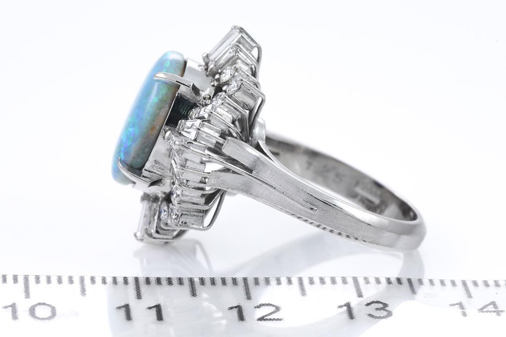 Opal and Diamond ring with an oval shape semi black Opal of 3.24ct and round & baguette cut Diamonds totalling 1.25ct (Estimated grading: G-H SI-P1). Platinum. Ring size K1/2. Weight: 12.3g. (Pre-owned)