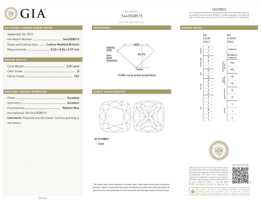A loose cushion cut Diamond of 3.25ct (with GIA report graded as D VS2 #5443508515). (New)<br><br><STRONG>*Shipping:</STRONG> <BR>This item will be dispatched 7 working days after full payment is received <BR><BR><STRONG>*Viewing:</STRONG> <BR>Pre-auction viewing is unavailable for this item