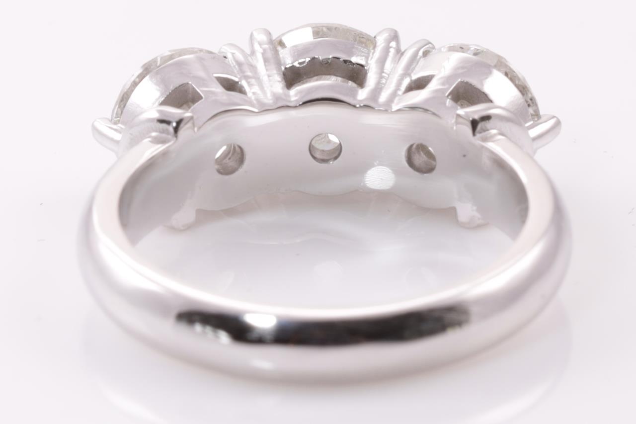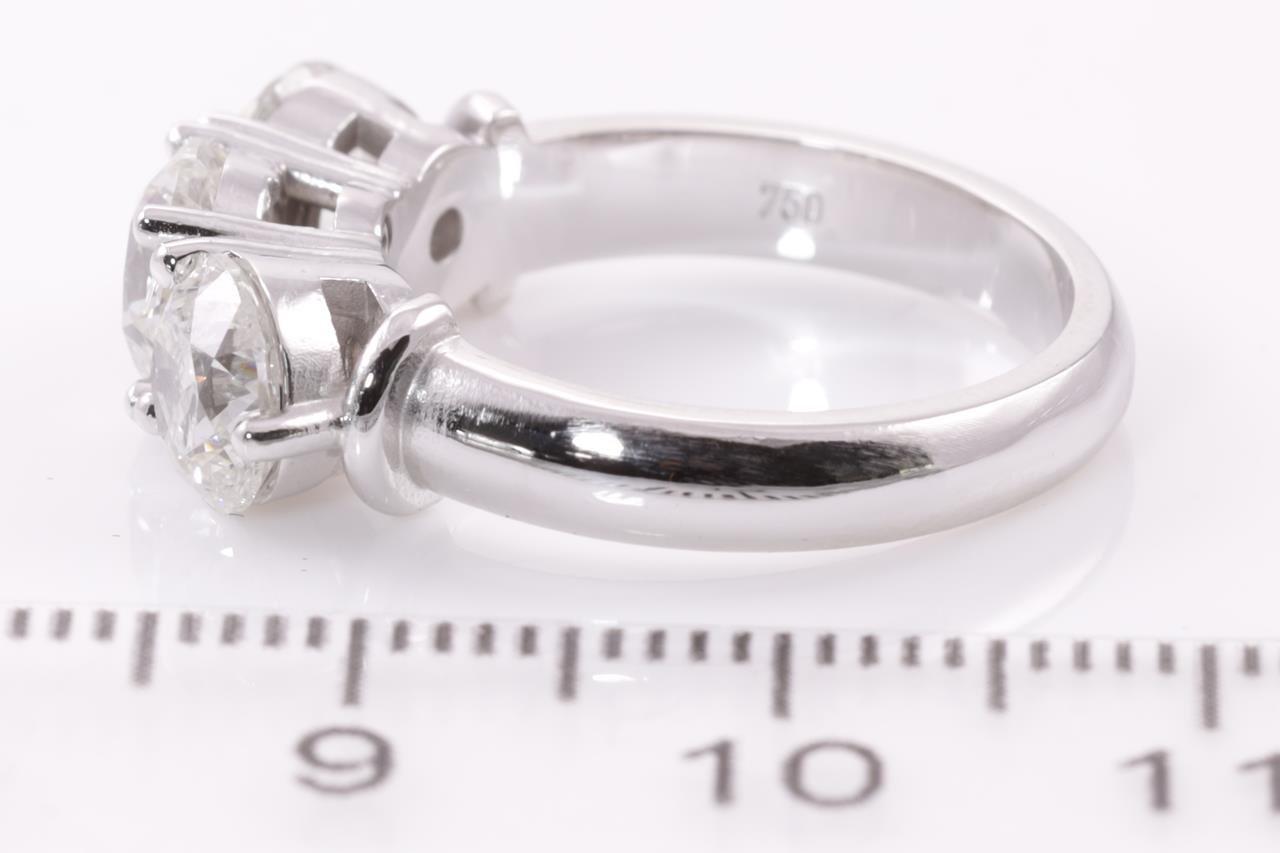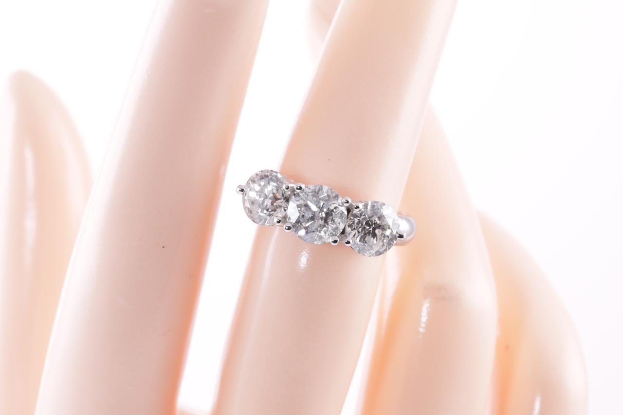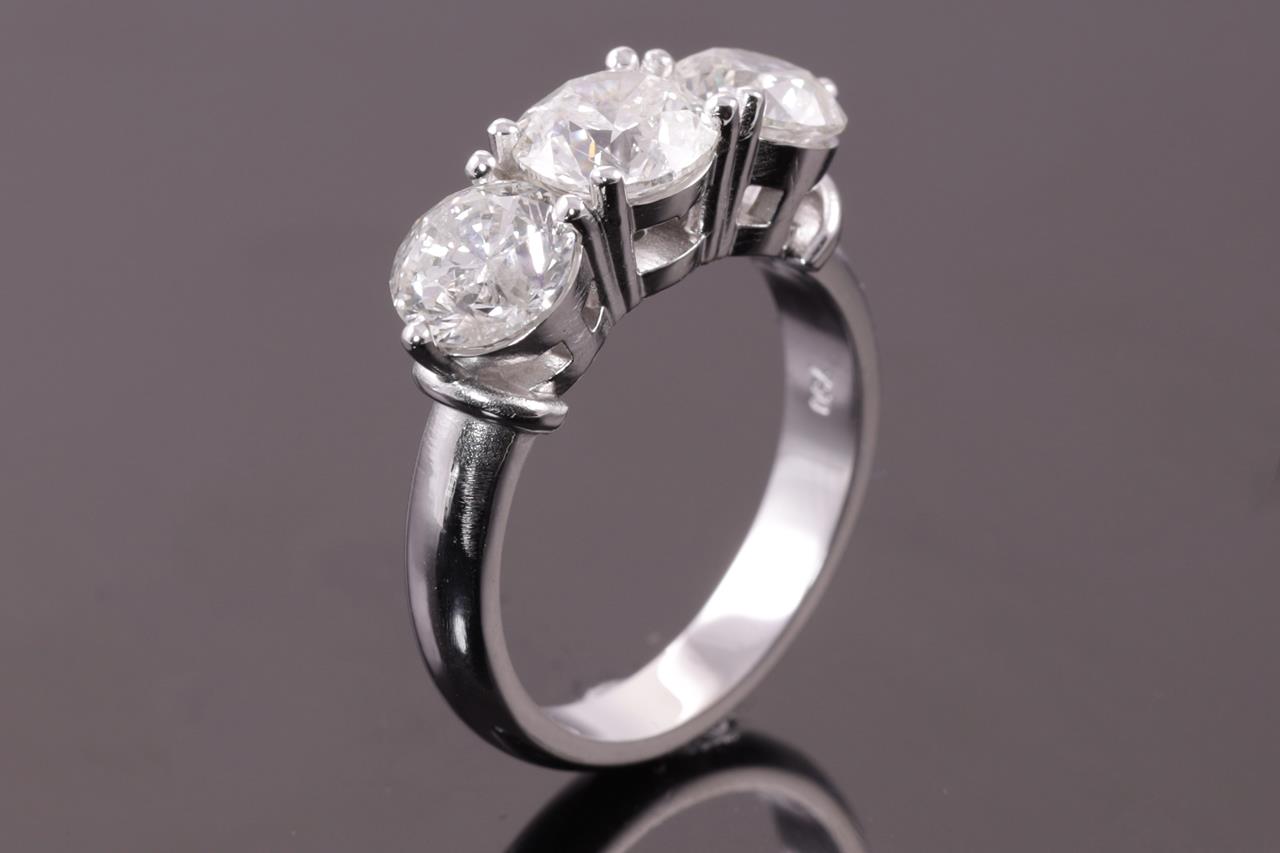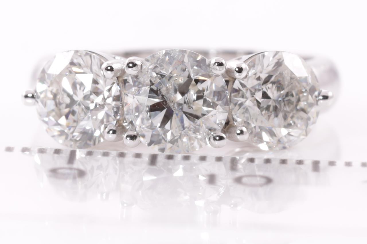 Diamond Trilogy ring with 3 round brilliant diamonds totalling 3.26cts (with GSL Memos graded as I P2 GSL031221-10, I P2 GSL031221-11, J P2 GSL031221-12). 18ct white gold. Ring size M. Weight: 7.5g. (New)