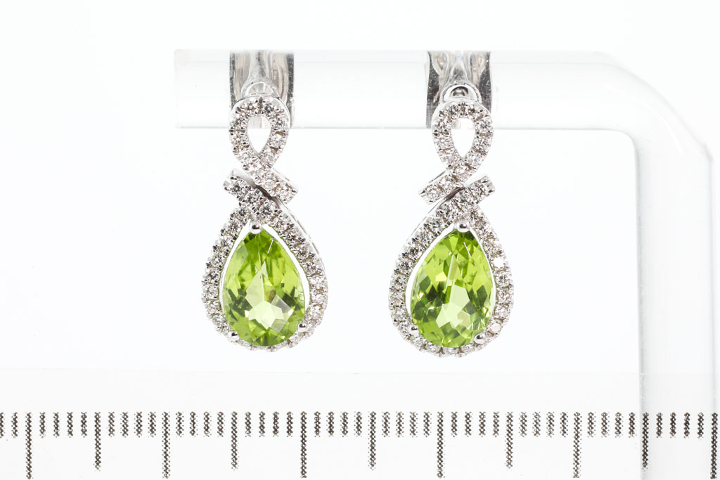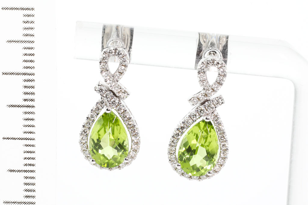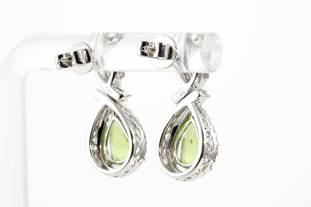 Peridot and Diamond earrings with pear shape checkerboard cut Peridot totalling 3.26ctcts and Diamonds totalling 0.42cts (Estimated grading: H SI). 14ct white gold with 14ct white gold backs. Weight: 4.6g. (New)