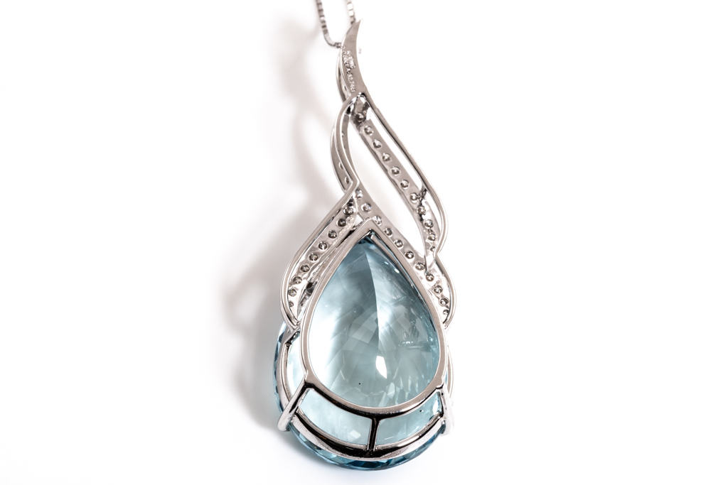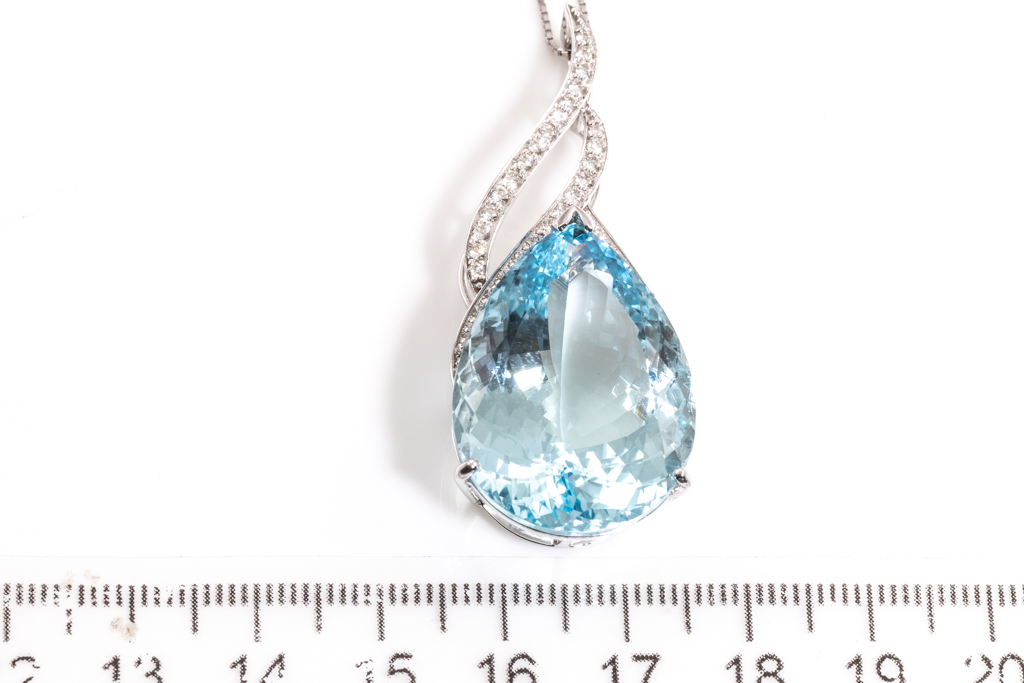 Aquamarine and Diamond pendant with pear shape Aquamarine of 32.74ct and round Diamonds totalling 0.68cts (Estimated grading: H-I SI). 18ct white gold with 45cm 18ct white gold adjustable chain. Weight: 13.9g. With certificate #416264. (Pre-owned)