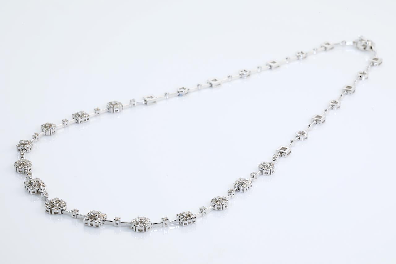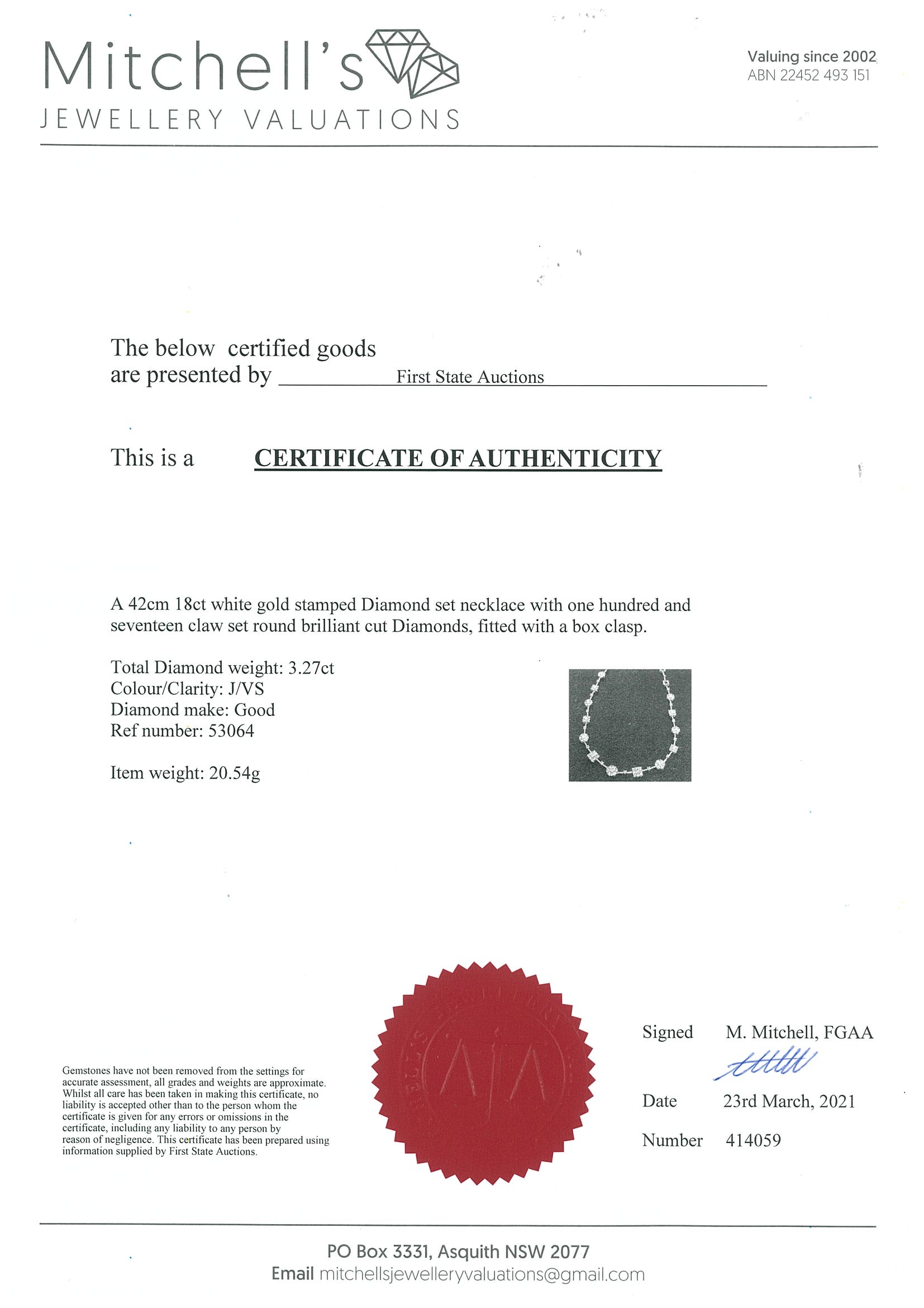 Diamond necklace with Diamonds totalling 3.27cts (Estimated grading: J VS). 18ct white gold. Length: 42cm. Weight: 20.5g. With certificate #414059. (Pre-owned)