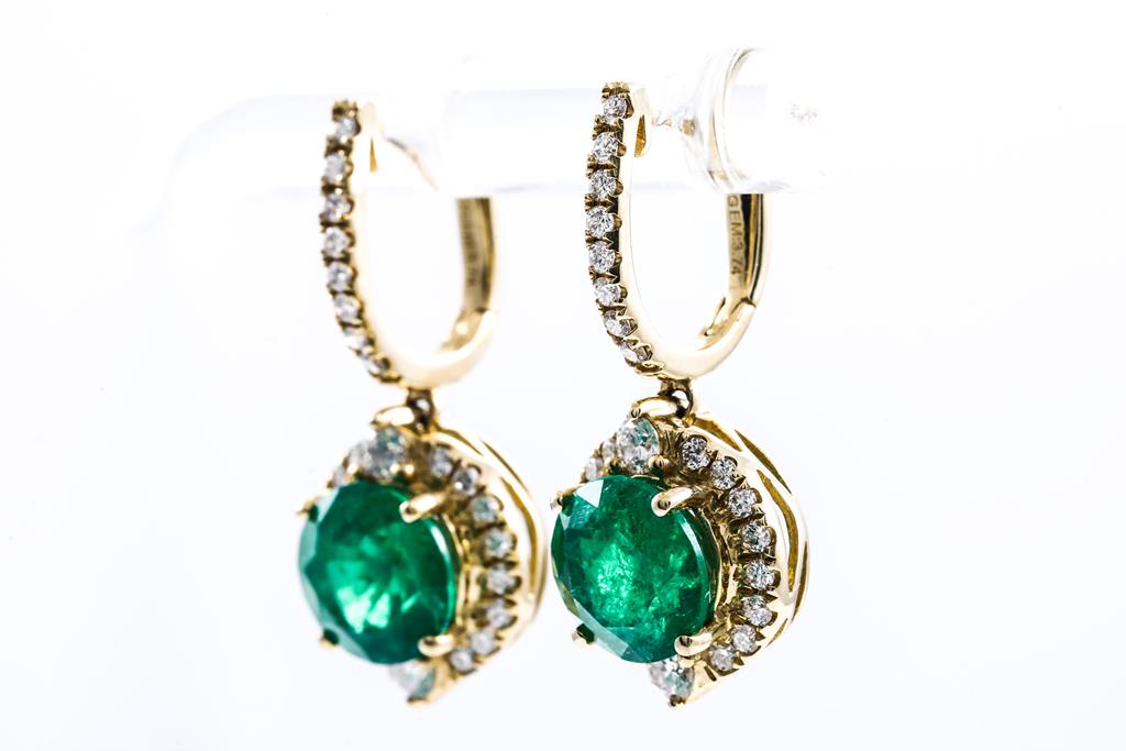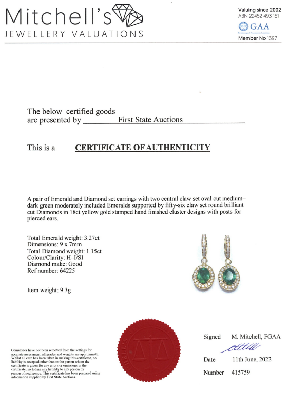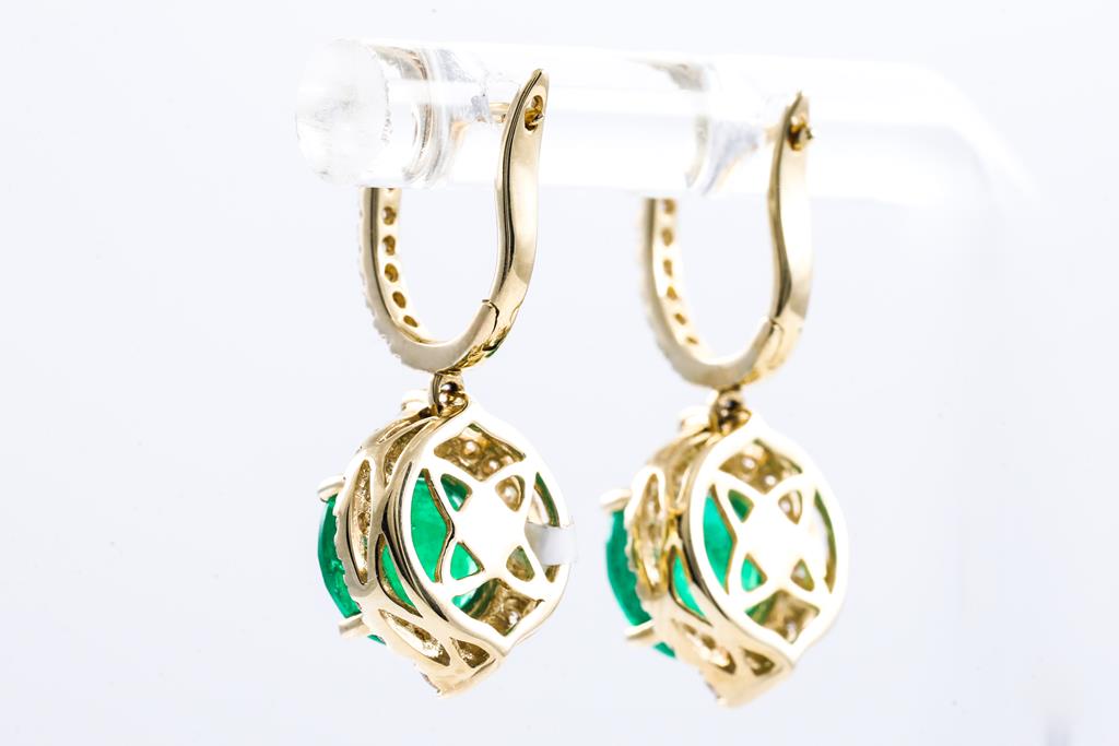 Emerald and Diamond hingeback earrings with oval Emeralds totalling 3.27cts and round Diamonds totalling 1.15cts (Estimated grading: H-I SI). 18ct yellow gold. Weight: 9.3g. With Certificate #415759. (Pre-owned)