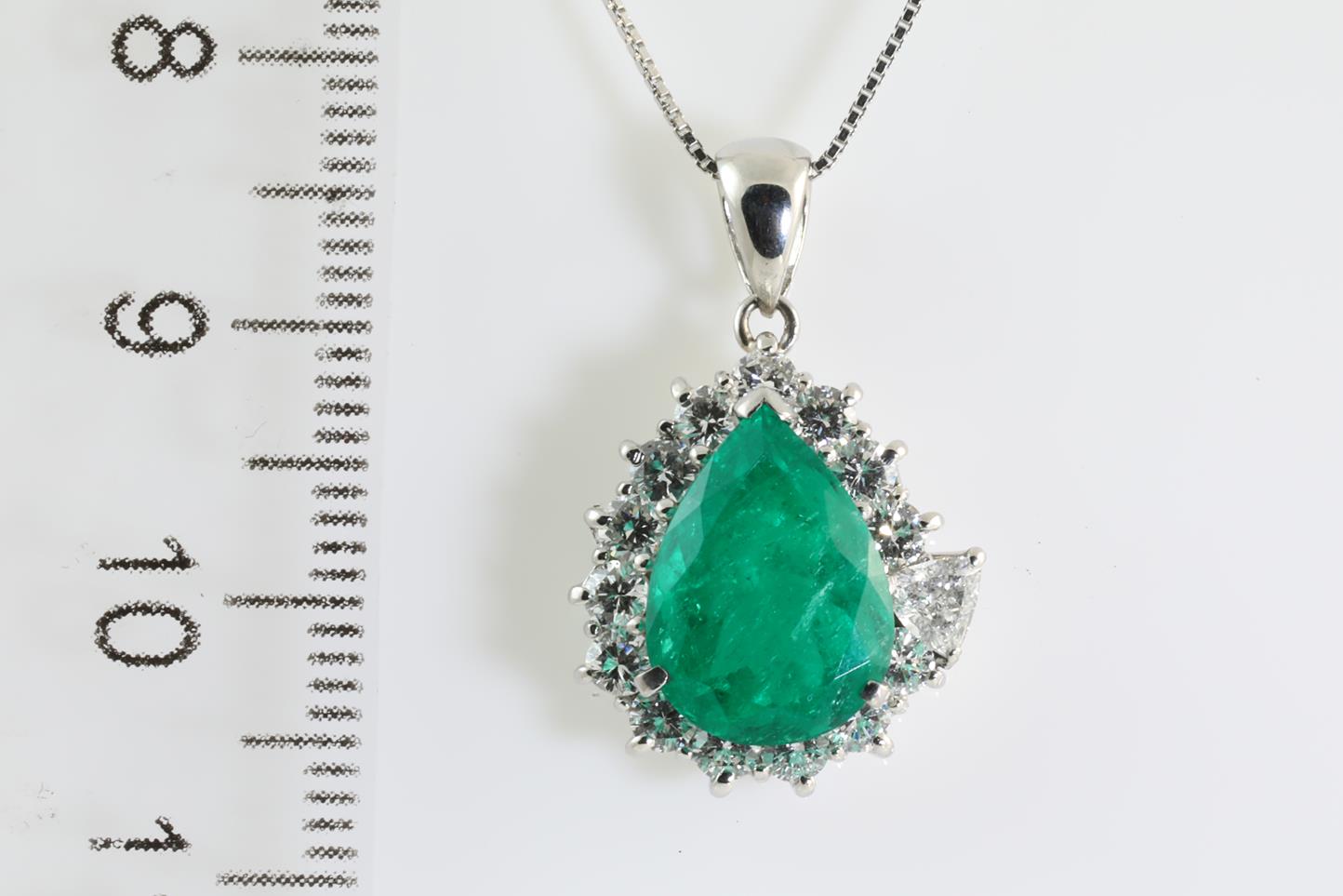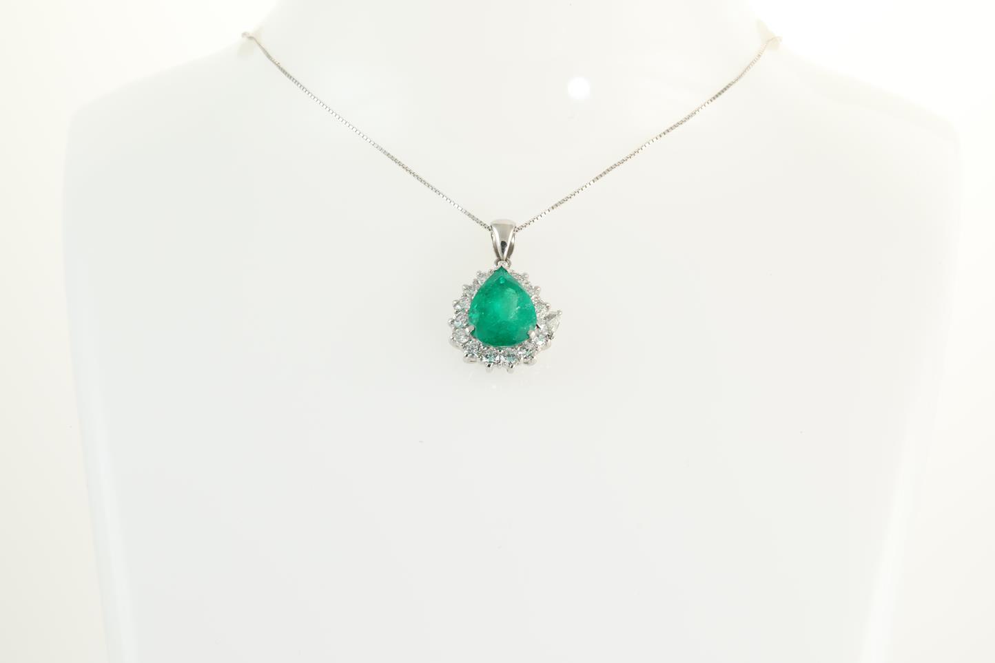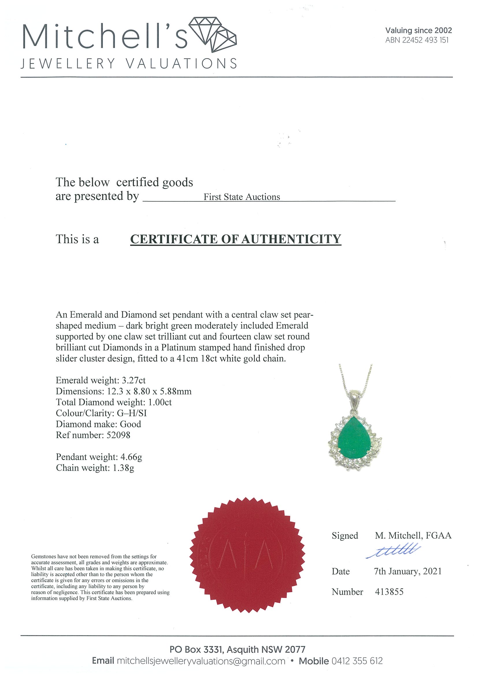 Emerald and Diamond pendant with a pear shape Emerald of 3.27ct and round Diamonds totalling 1.00cts (Estimated Grading: G-H SI). Platinum with 18ct white gold 41cm chain. Weight: 6.0g. With certificate #413855. (Pre-owned)