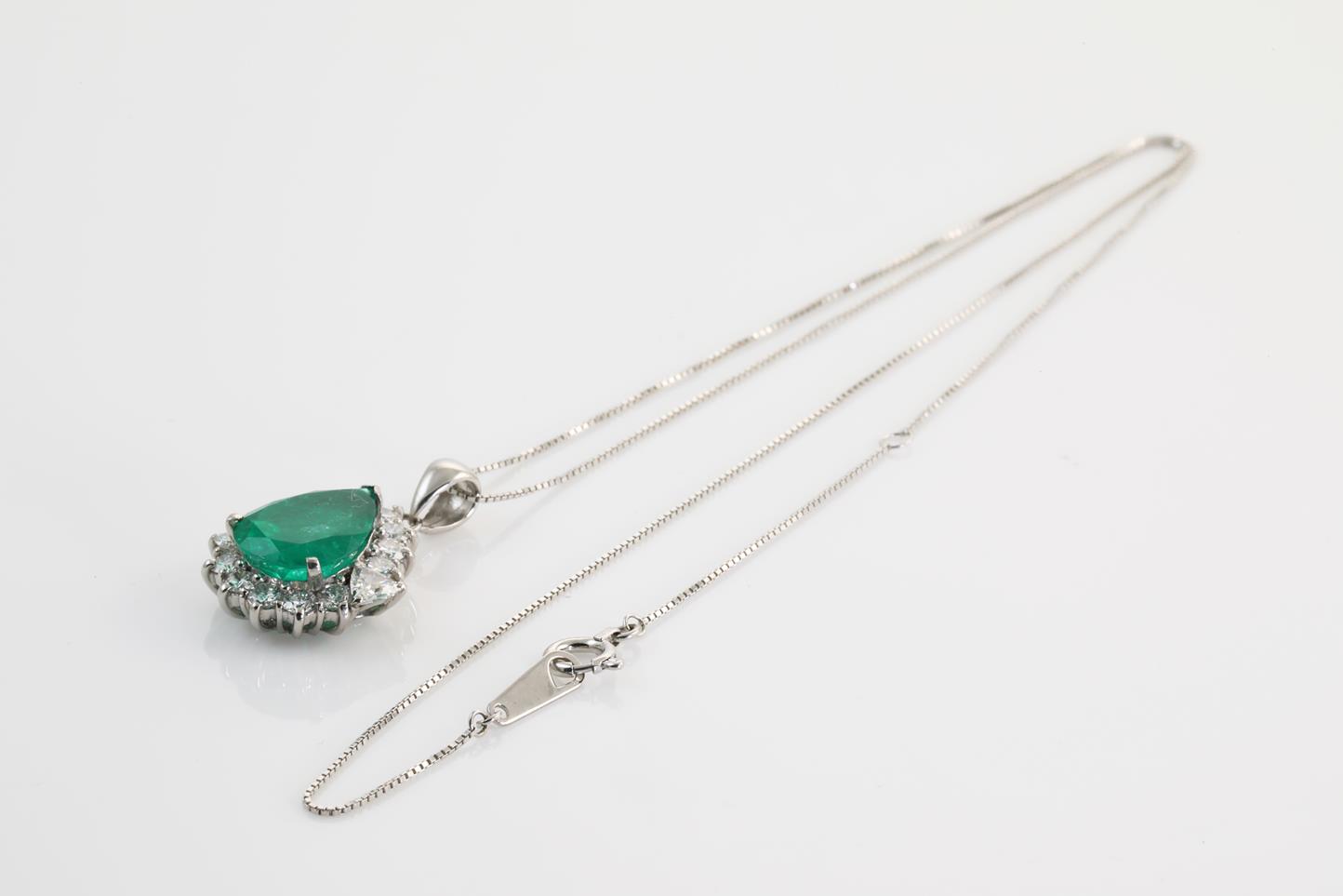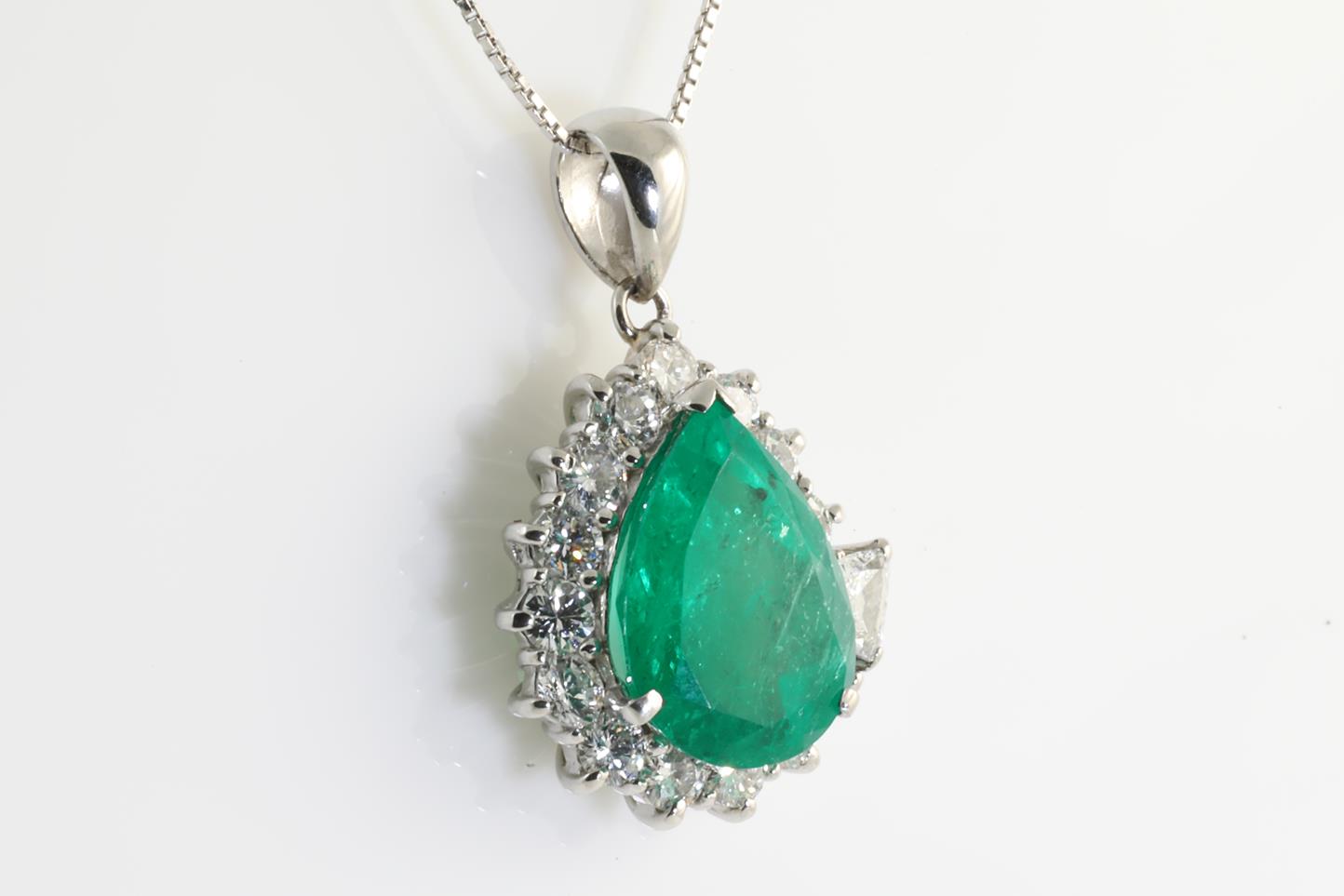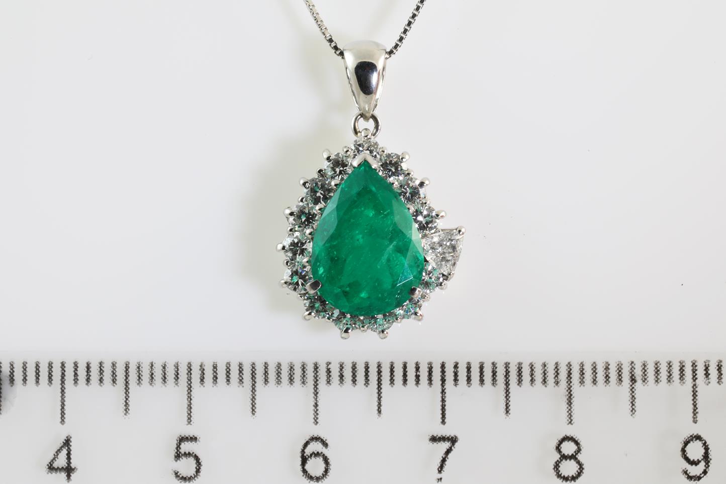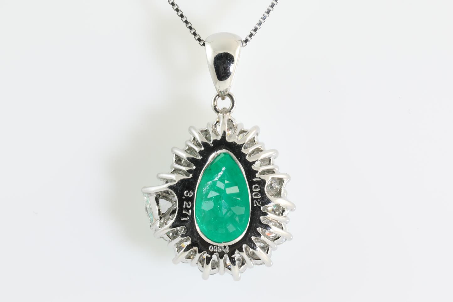 Emerald and Diamond pendant with a pear shape Emerald of 3.27ct and round Diamonds totalling 1.00cts (Estimated Grading: G-H SI). Platinum with 18ct white gold 41cm chain. Weight: 6.0g. With certificate #413855. (Pre-owned)