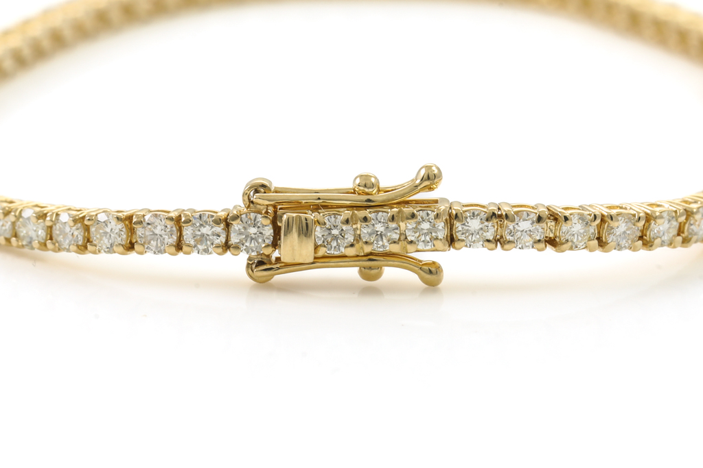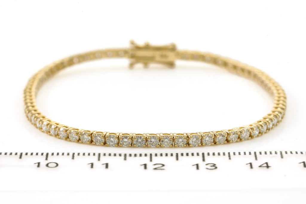 Diamond tennis bracelet with 69 Round Diamonds totalling 3.28cts (Estimated grading: I-J SI). 18ct yellow gold. Length: 18cm. Weight: 8.6g. With Certificate #416286. (New)