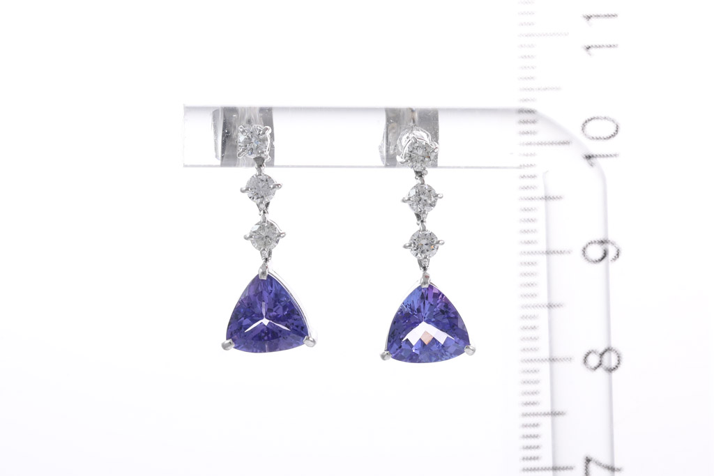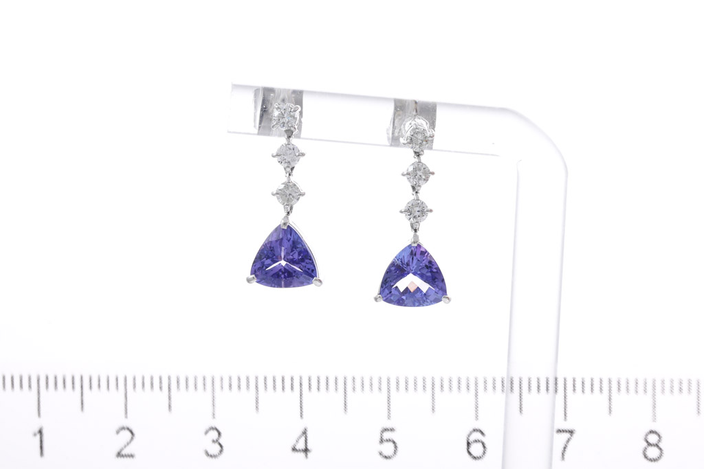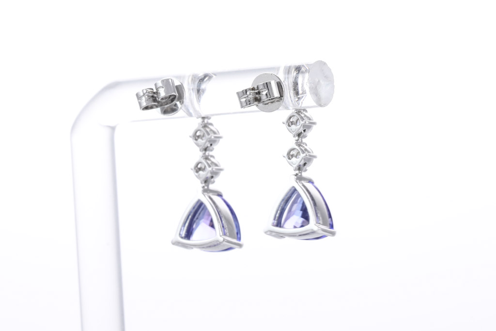 Tanzanite and Diamond drop earrings with trilliant cut Tanzanites totalling 3.28cts and round Diamonds totalling 0.50cts (Estimated grading: I P1-P2). 18ct white gold and platinum with 18ct white gold backs. Weight: 4.4g. (Pre-owned)