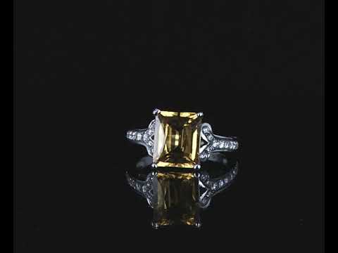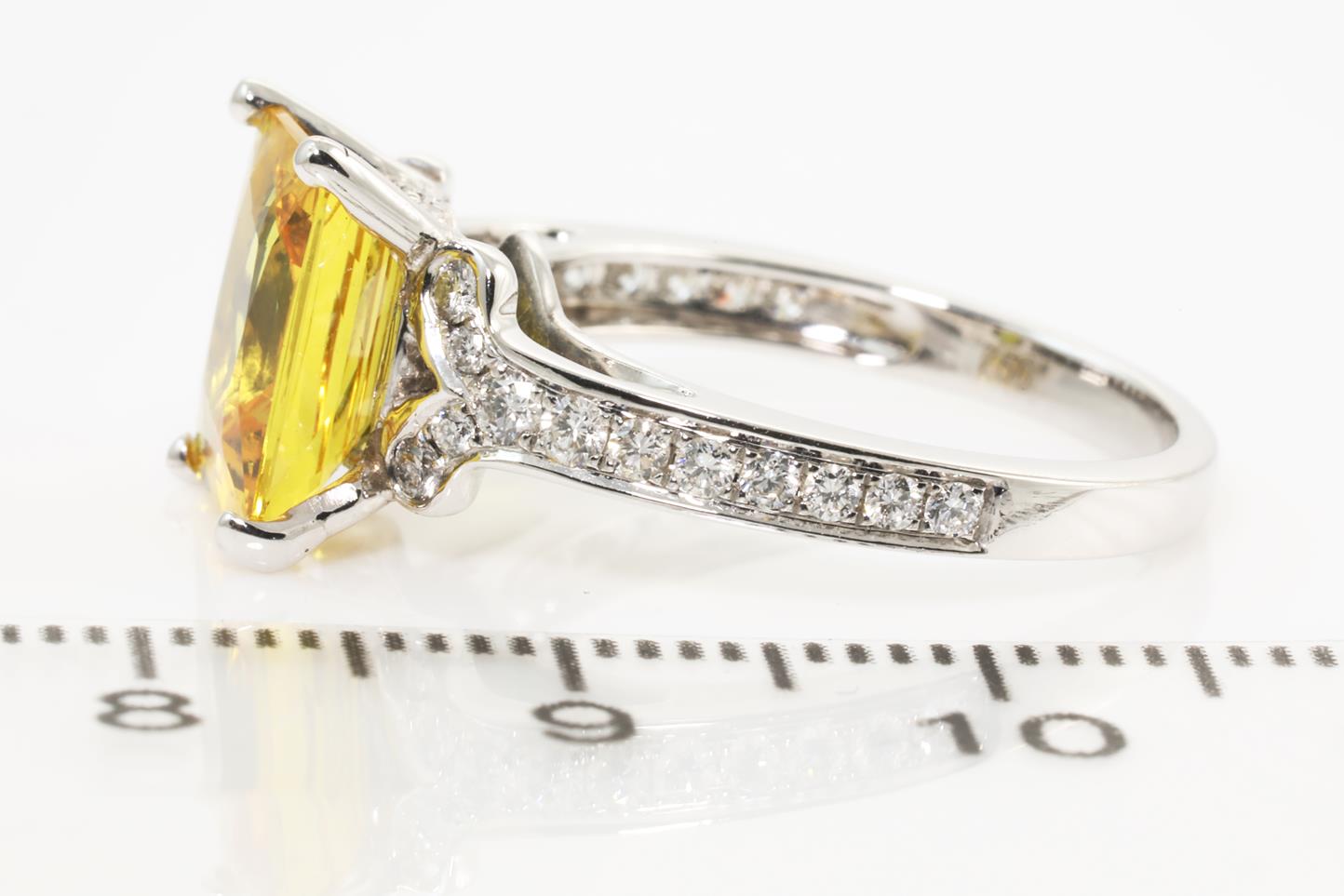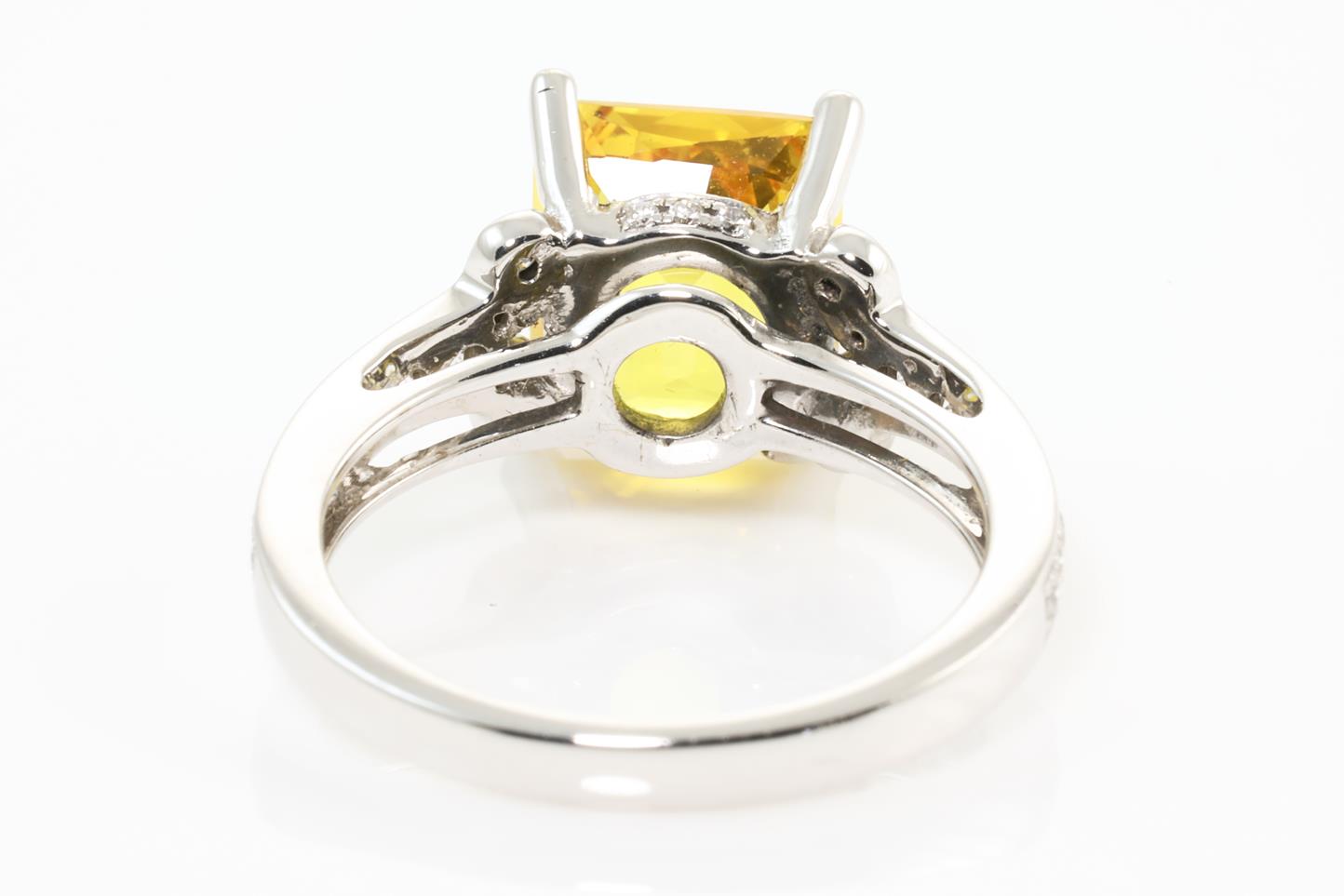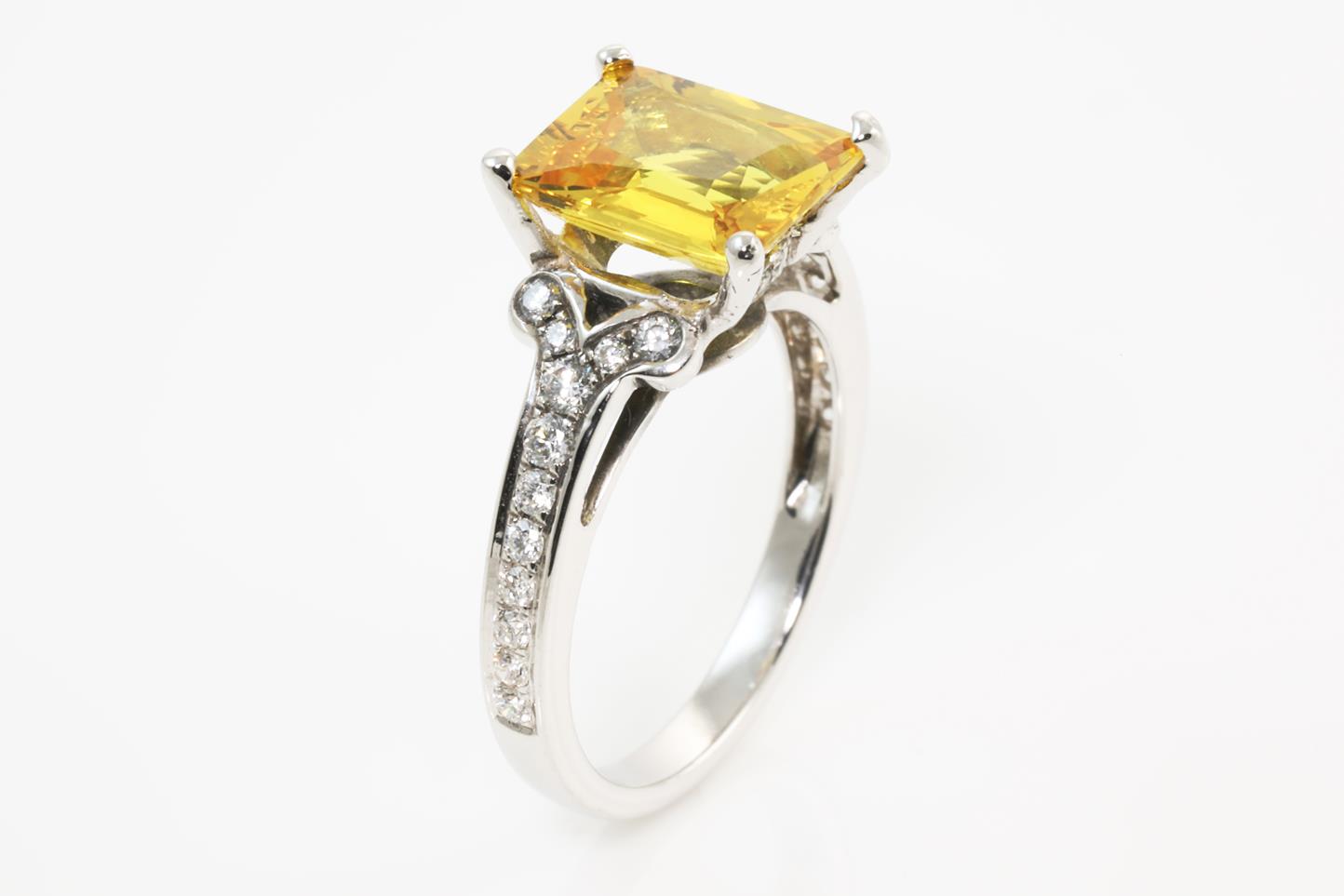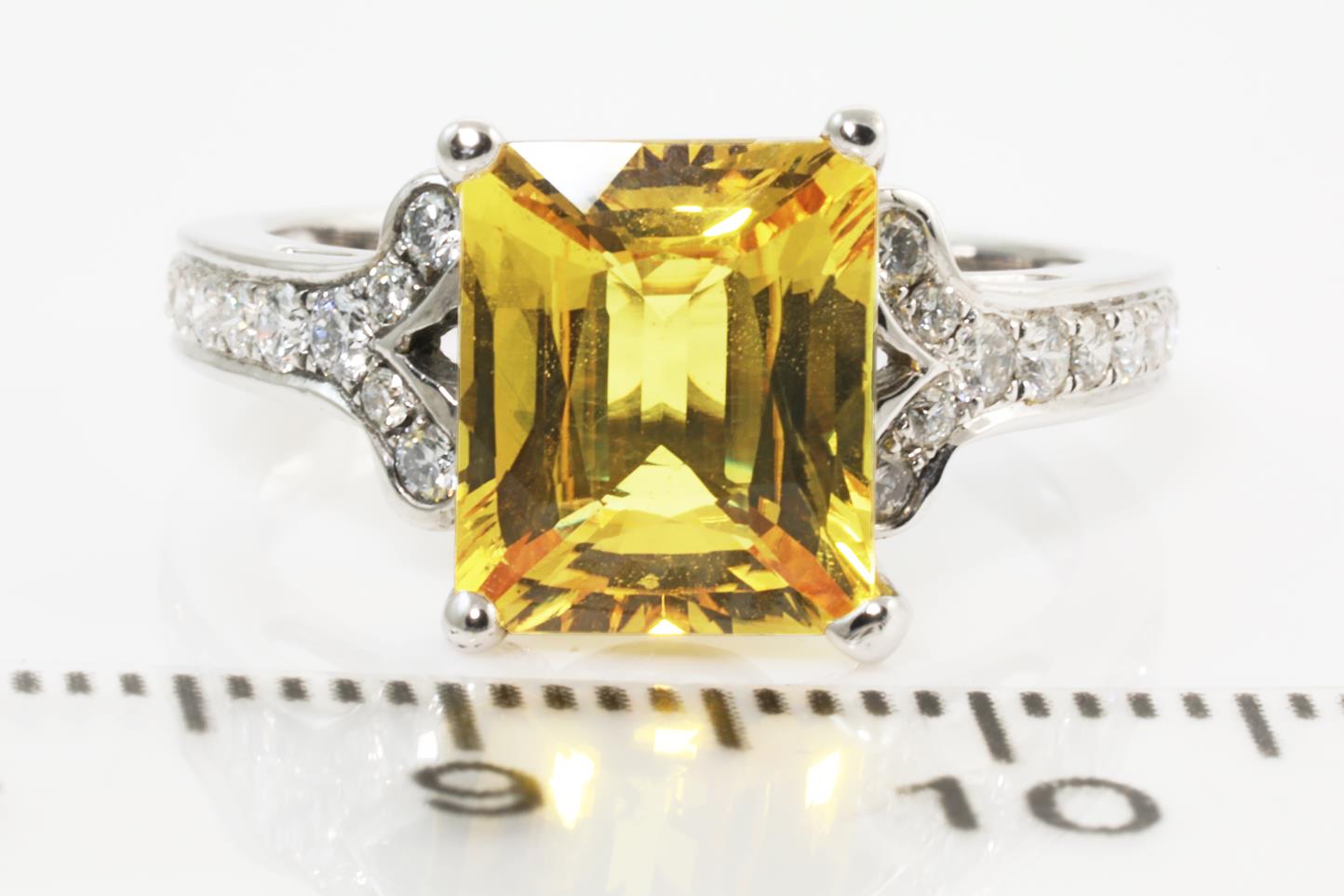 Sapphire and Diamond ring with emerald cut Yellow Sapphire of approximately 3.28ct and round Diamonds totalling approximately 0.40cts (Estimated grading: H SI). Ring size K1/2. 18ct white gold. Weight: 4.2g (Pre-owned)