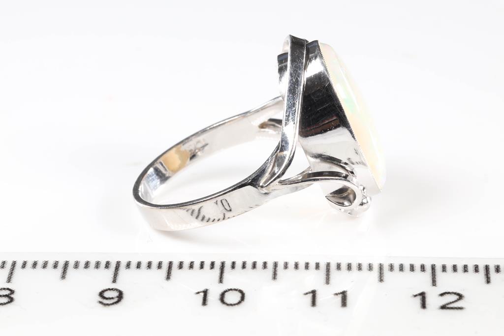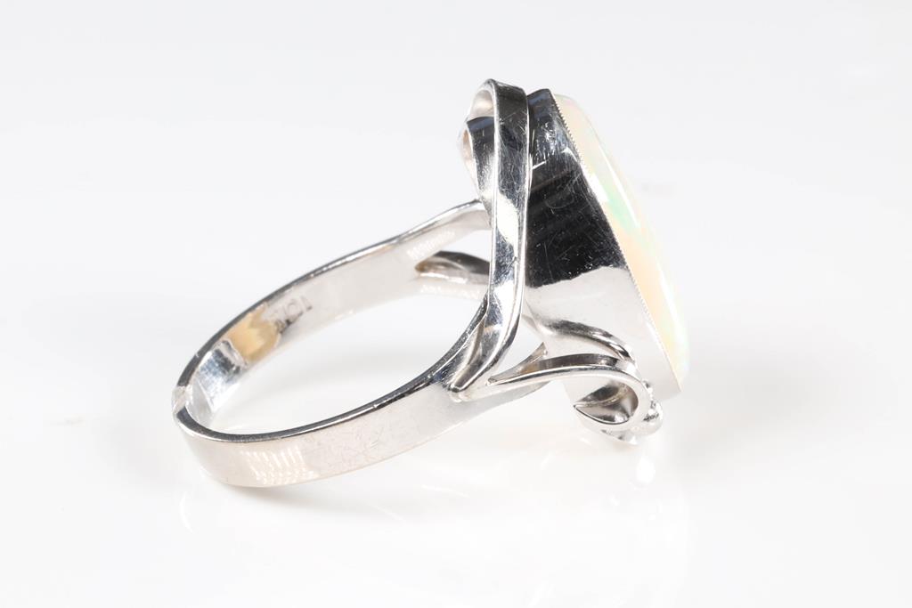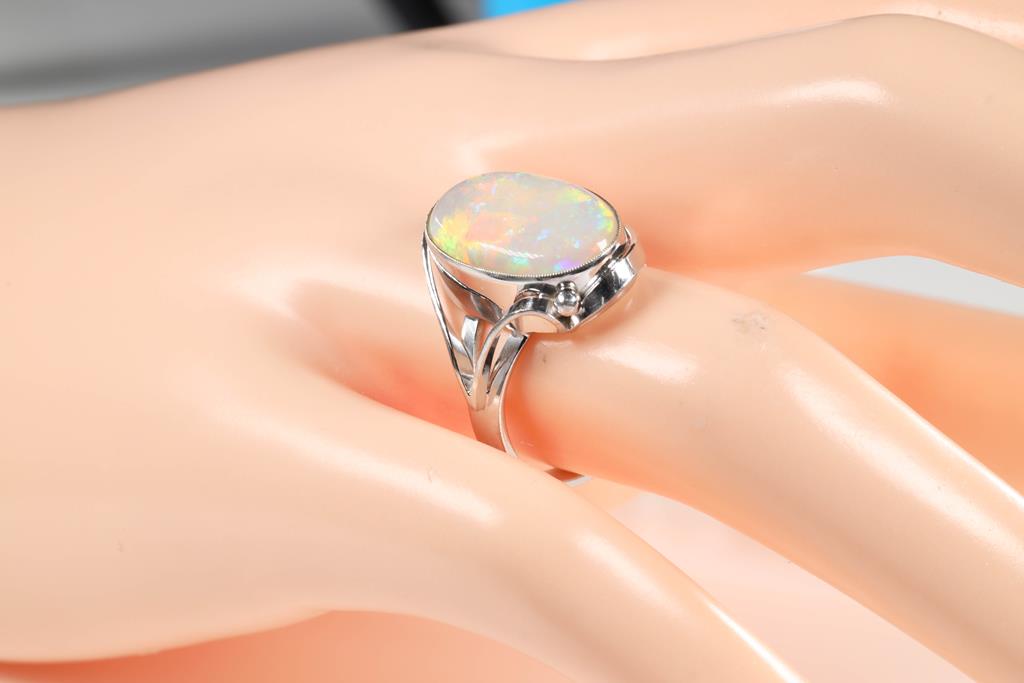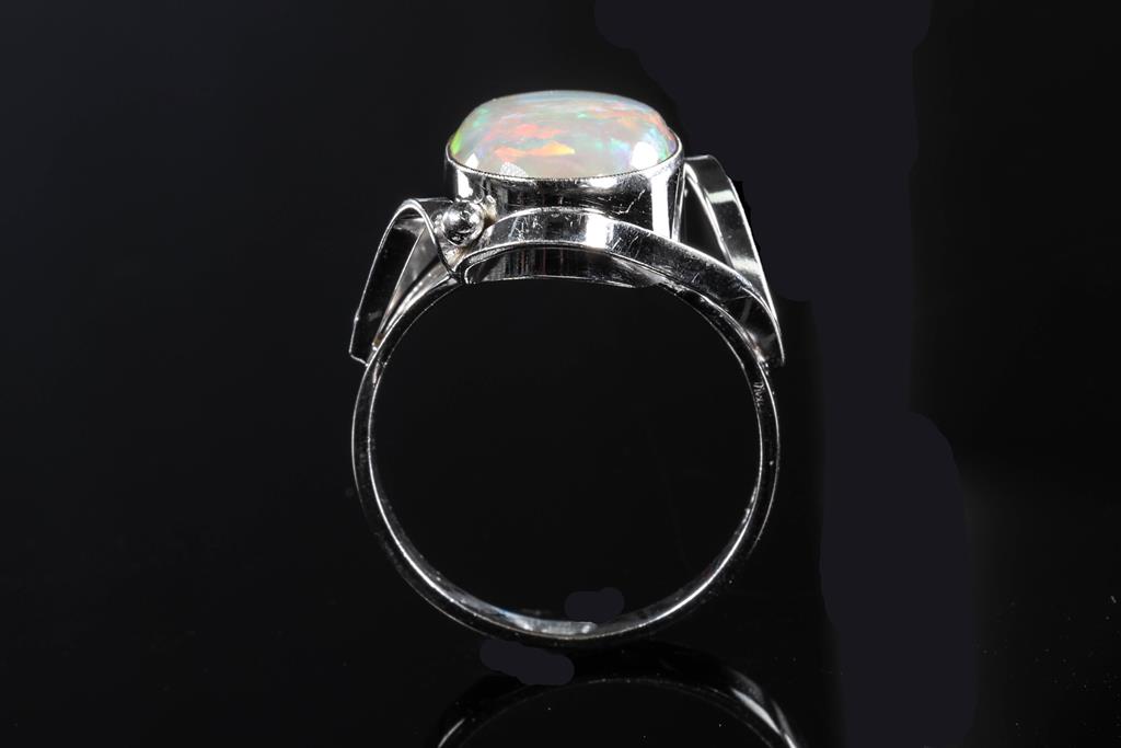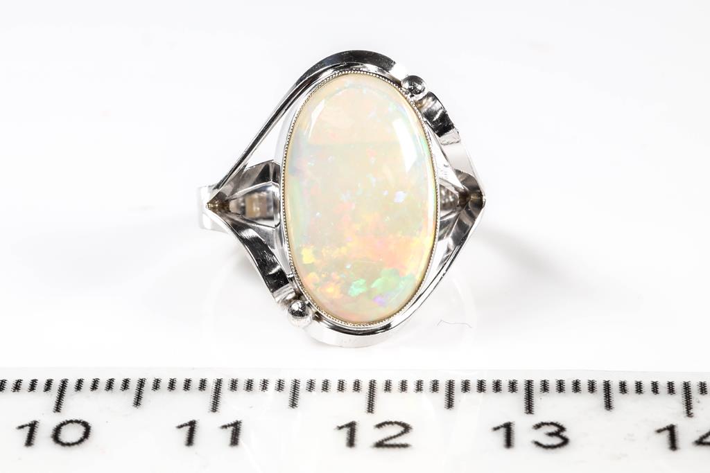 Opal ring with oval cabochon white Opal of approximately 3.29ct (approximative 16.2 x 10.2 x 3.5mm). 10ct white gold. Ring size N. Weight 4.6g. (Pre-owned)