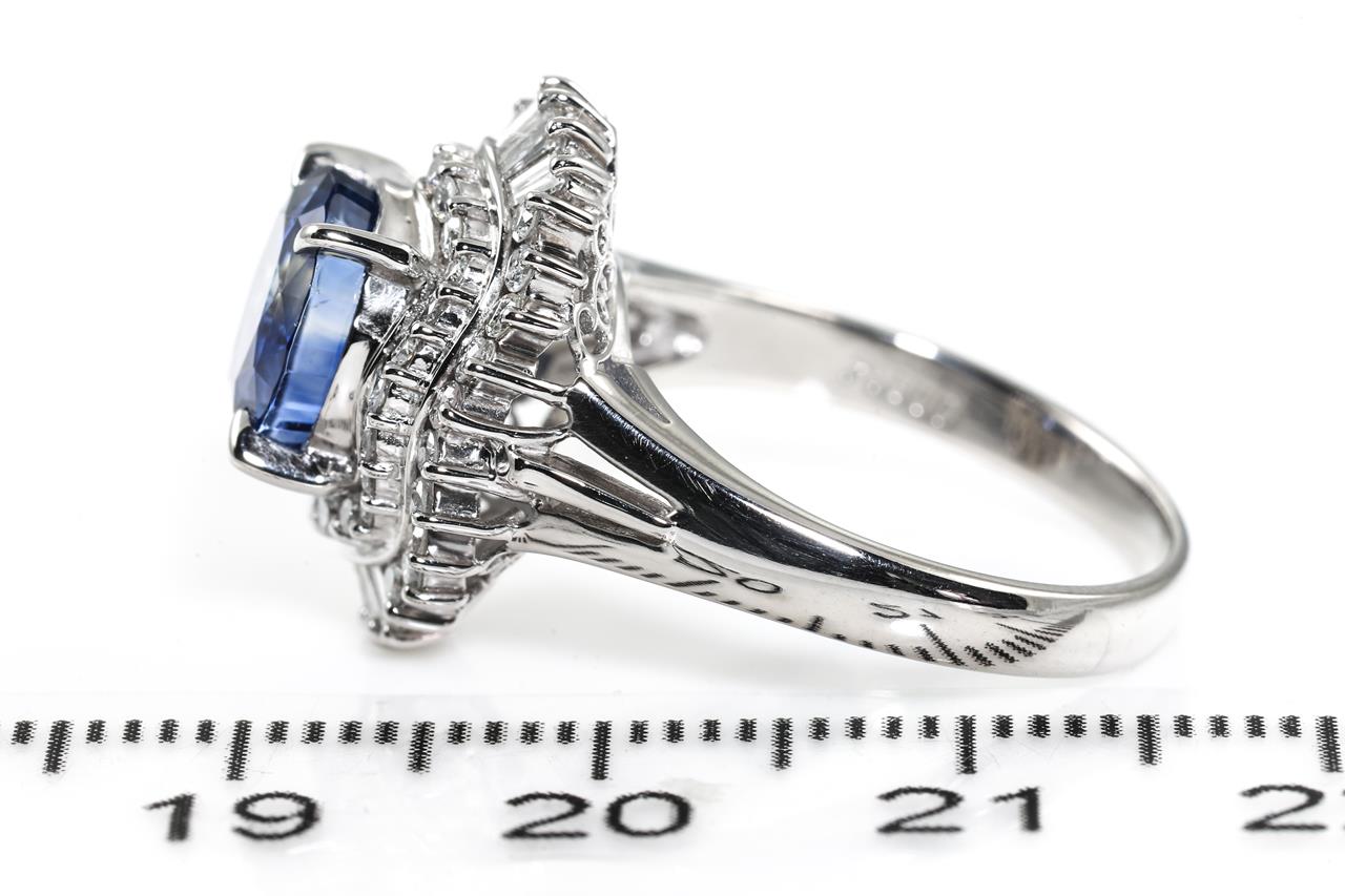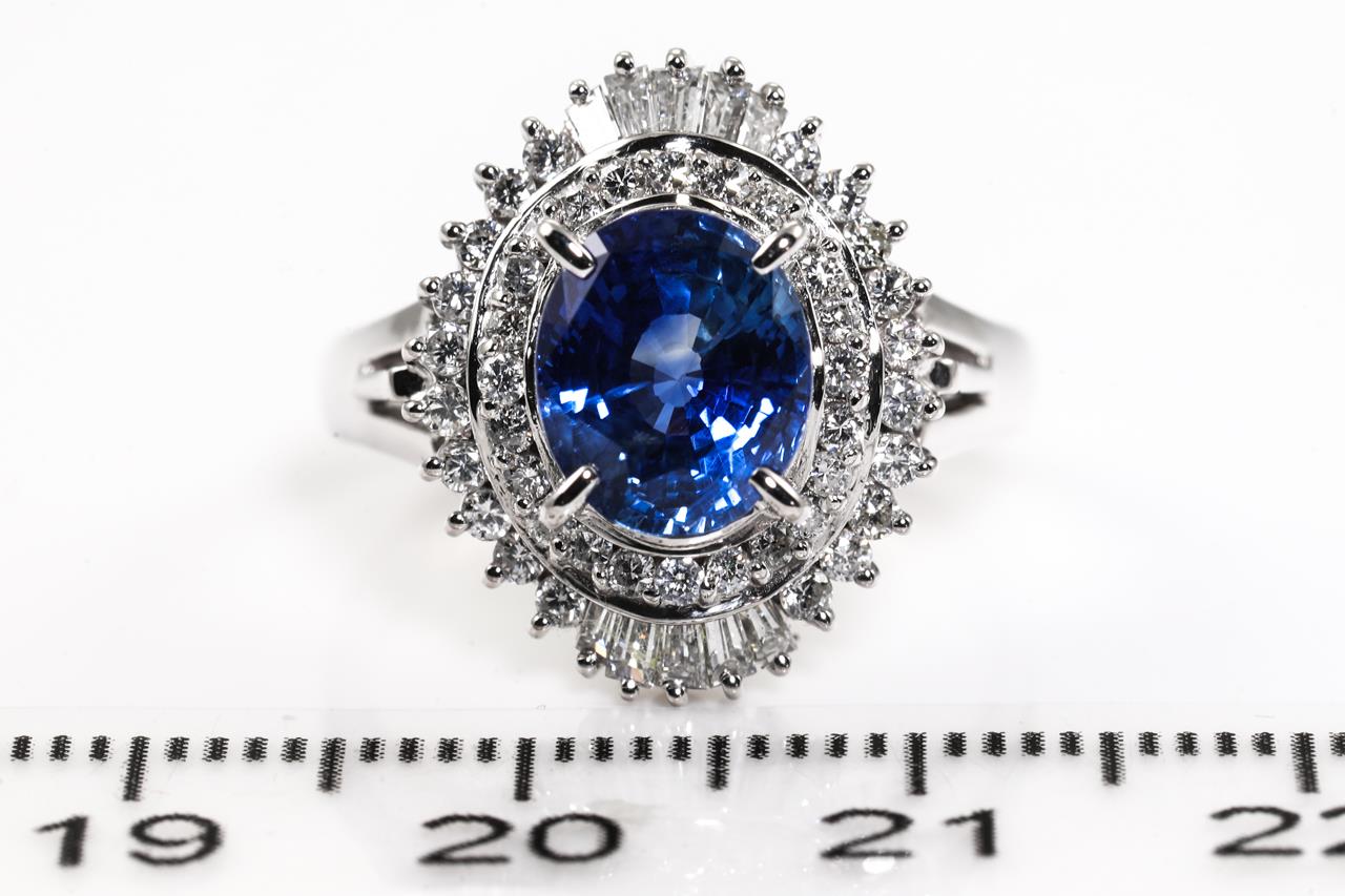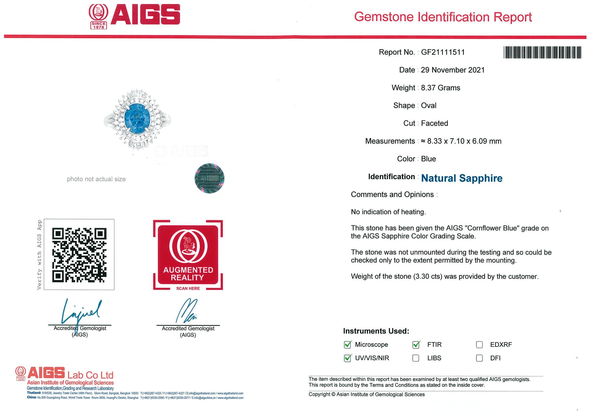 Sapphire and Diamond ring with oval shape unheated cornflower blue Sapphire of 3.30ct and surrounding round & baguette cut Diamonds totalling 0.70cts (Estimated grading: G SI). Platinum. Ring size: M. Weight: 8.4g. With AIGS report #GF21111511. (Pre-owned)