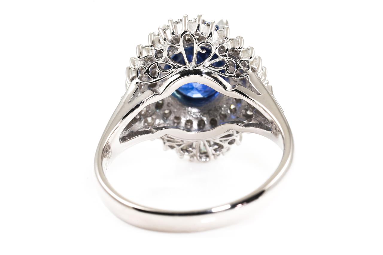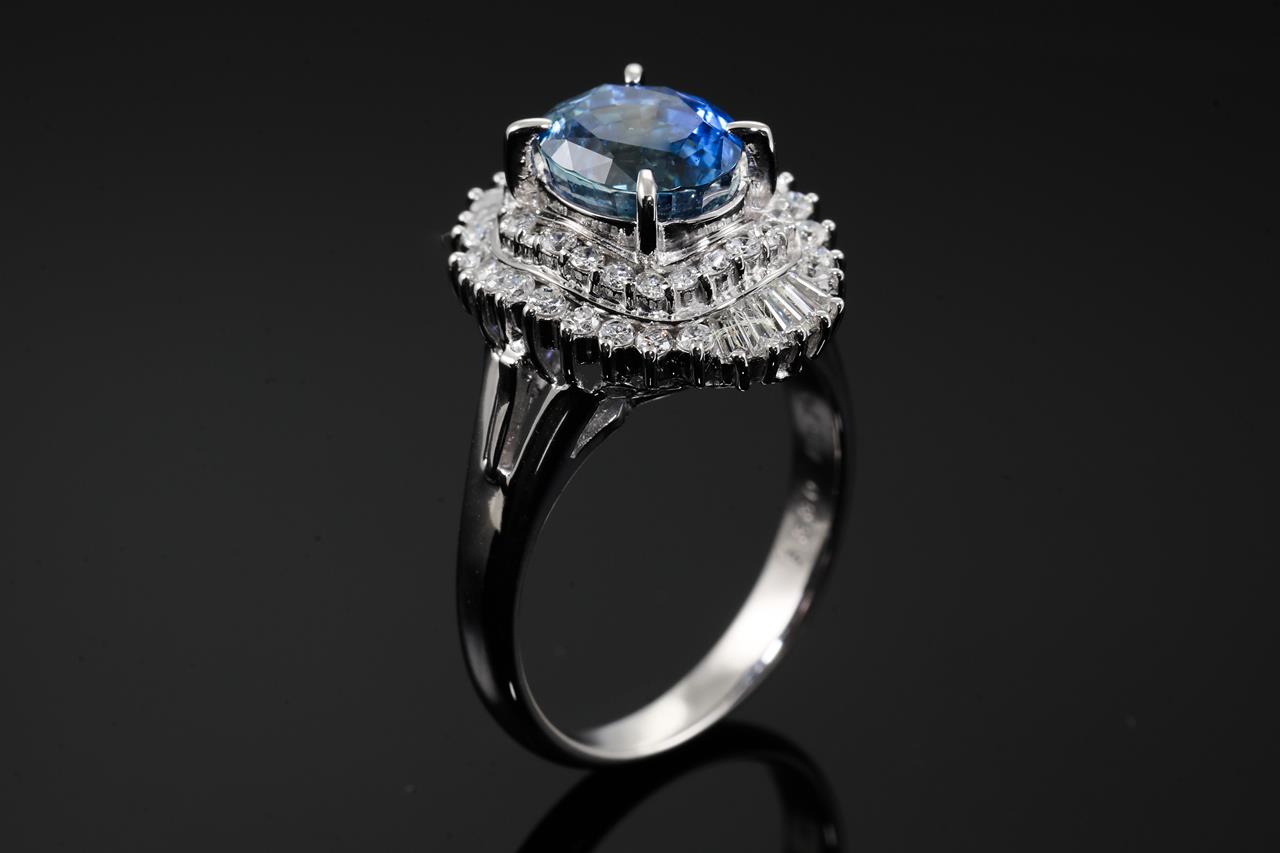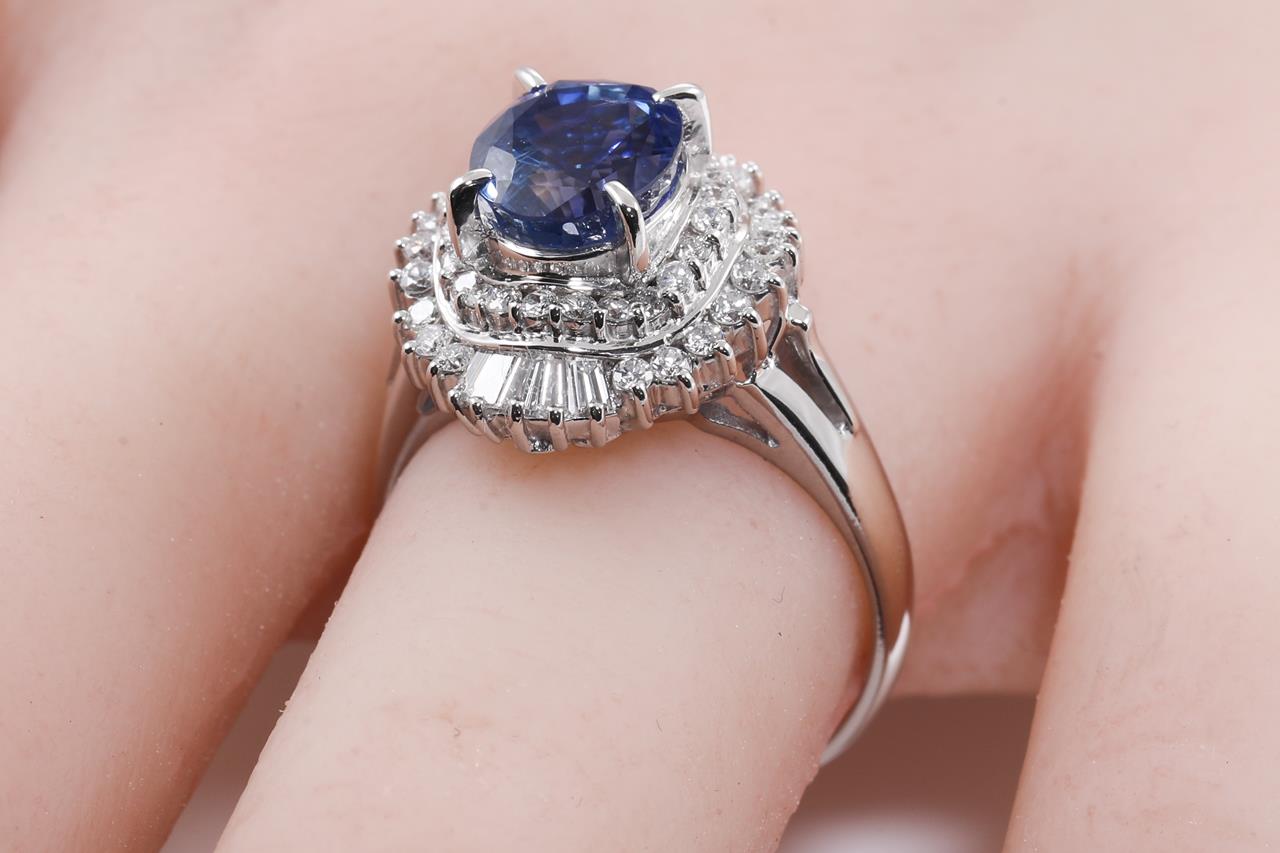 Sapphire and Diamond ring with oval shape unheated cornflower blue Sapphire of 3.30ct and surrounding round & baguette cut Diamonds totalling 0.70cts (Estimated grading: G SI). Platinum. Ring size: M. Weight: 8.4g. With AIGS report #GF21111511. (Pre-owned)