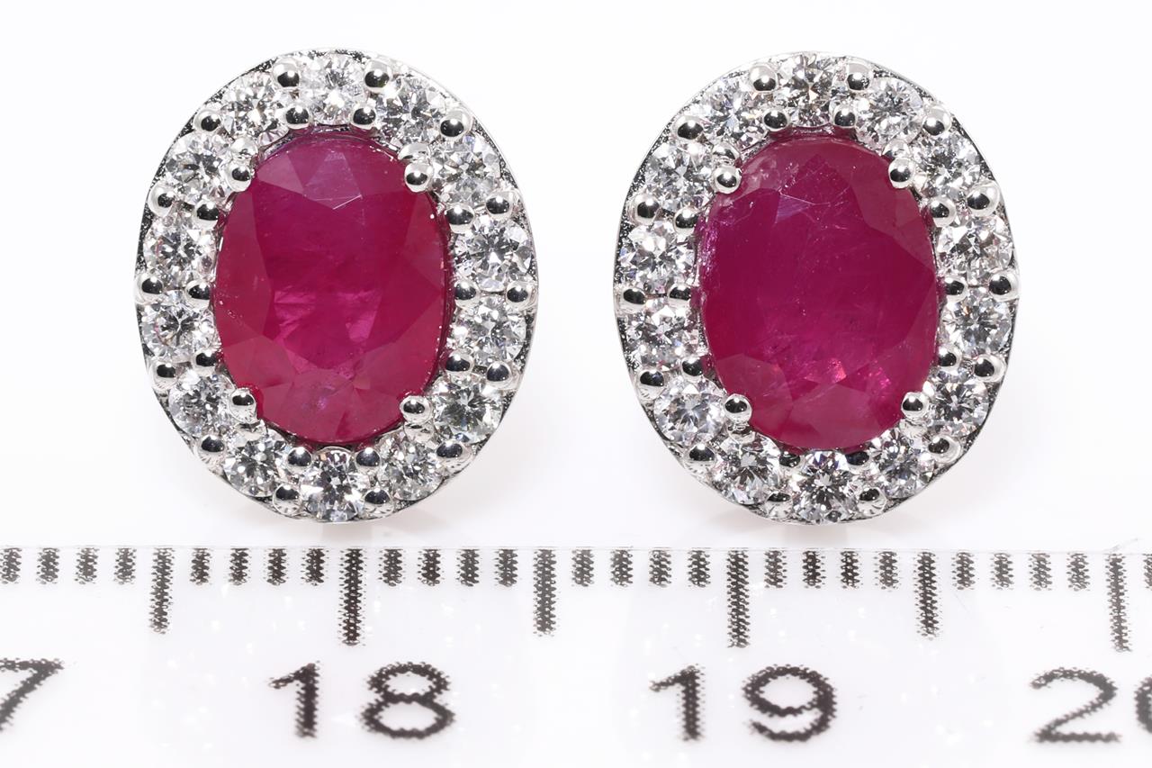 Ruby and Diamond earrings with oval rubies totalling 3.31cts and Diamonds totalling 0.77cts (Estimated grading: G-H SI). 14ct white gold. Weight: 4g. (As new)