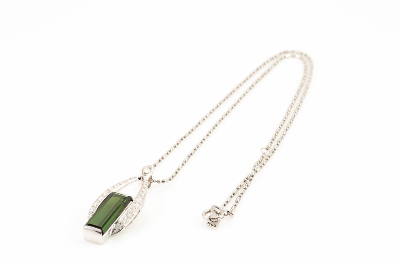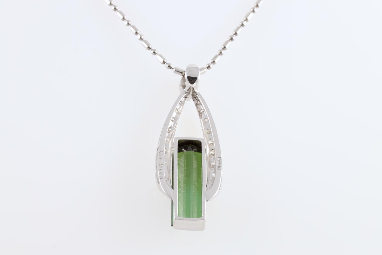 Tourmaline and Diamond pendant with green Tourmaline of 3.31ct and Diamonds totalling 0.46cts (Estimated grading: H SI-P1). Platinum with 40cm chain. Weight: 7.8g (Pre-owned)