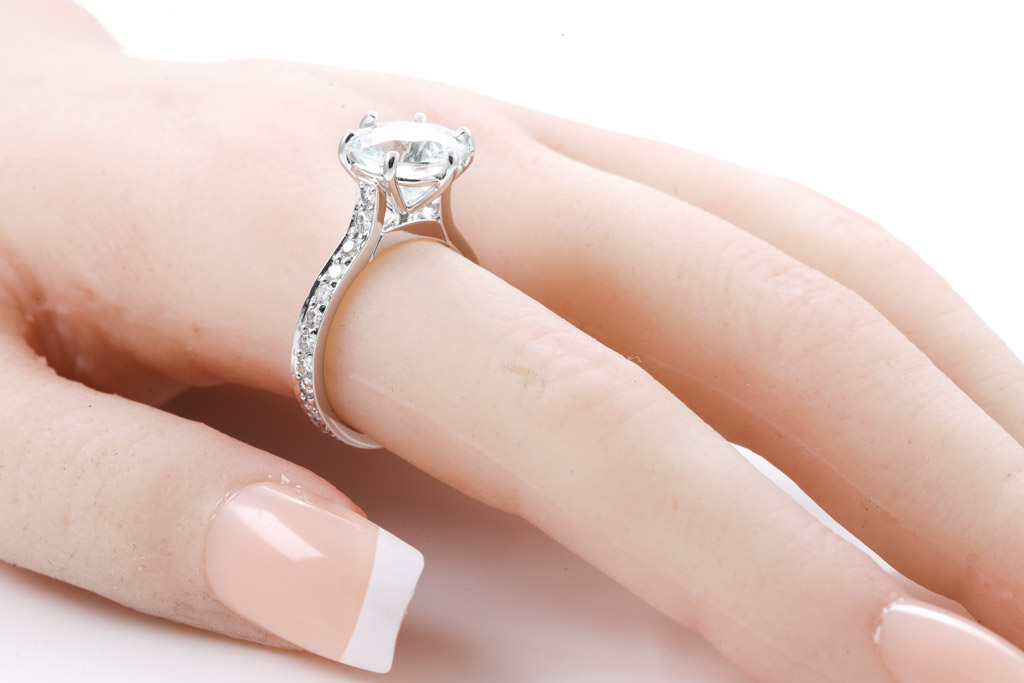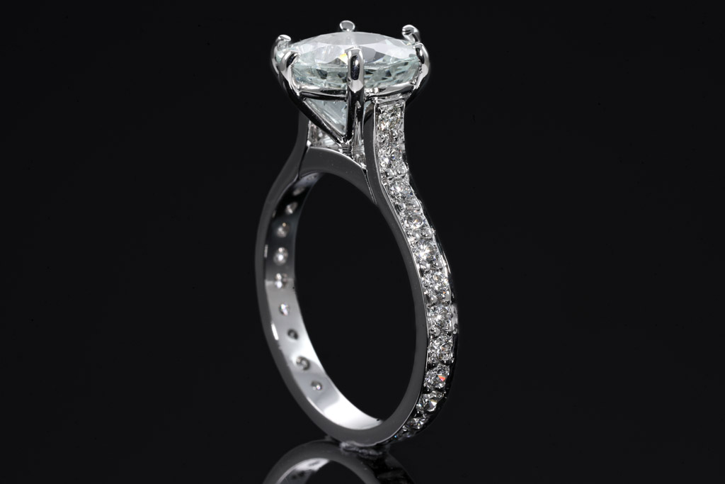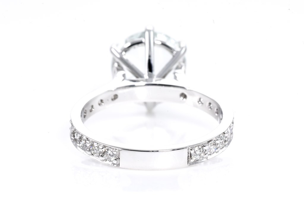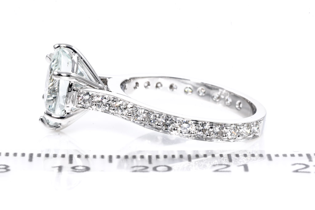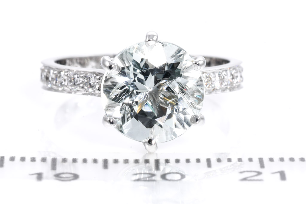 Aquamarine and Diamond ring with centre round Aquamarine of 3.32cts and round Diamonds totalling approximately 0.72cts (Estimated grading: G VS-SI). 18ct white gold. Ring size O1/2 - can be resized up by a maximum of 3 sizes, down with ring clip. Weight: 5.3g. (Pre-owned)