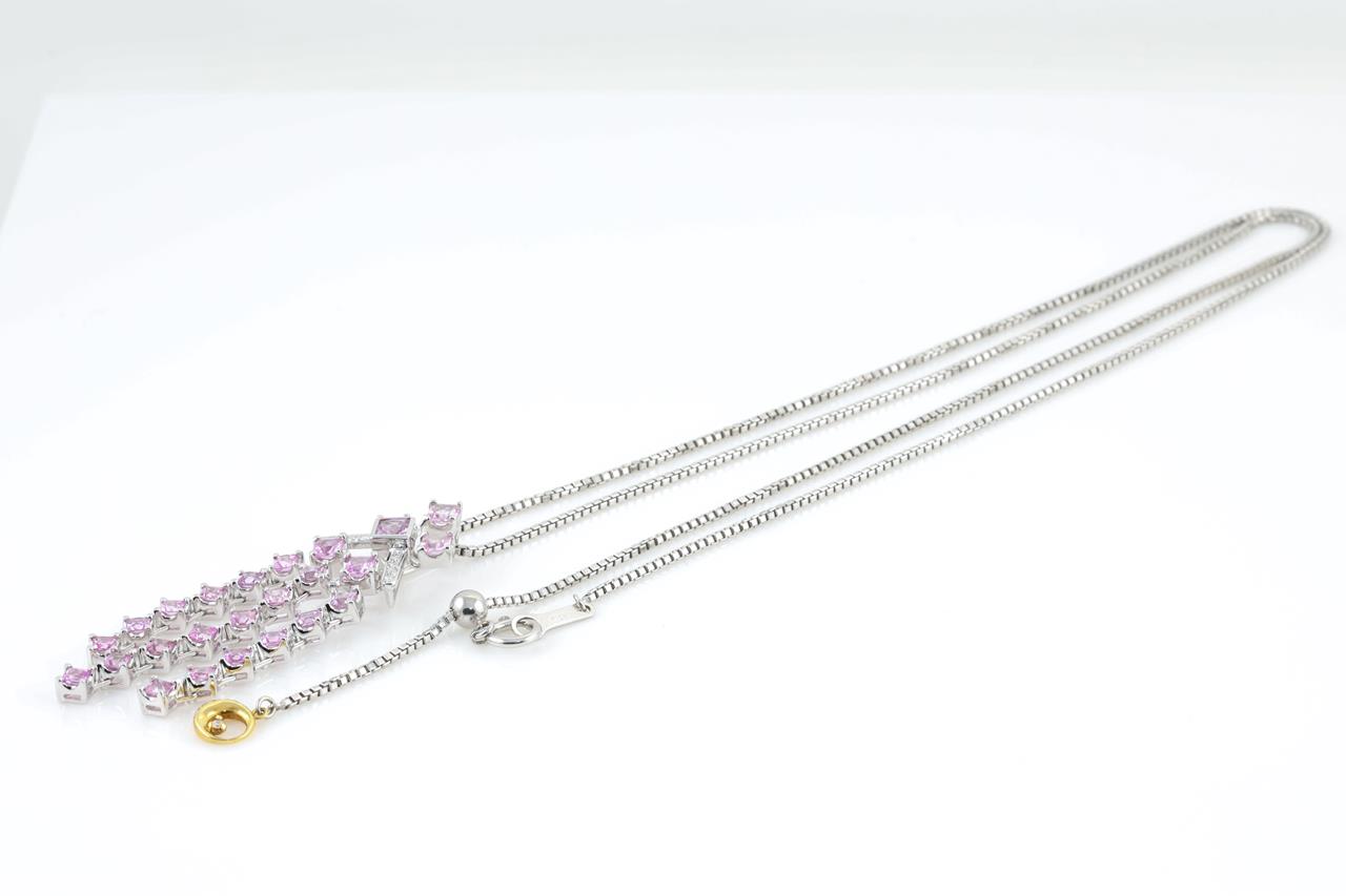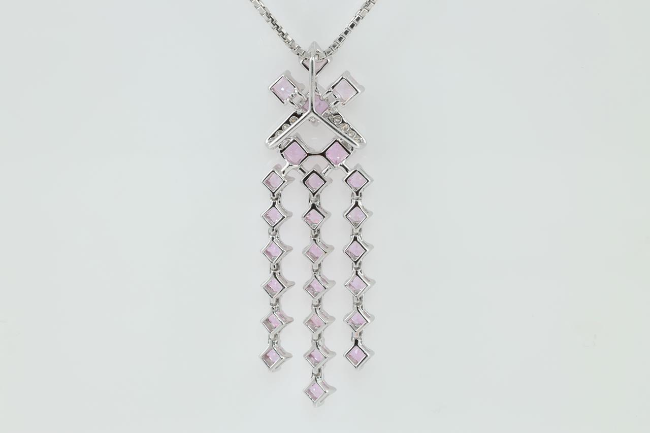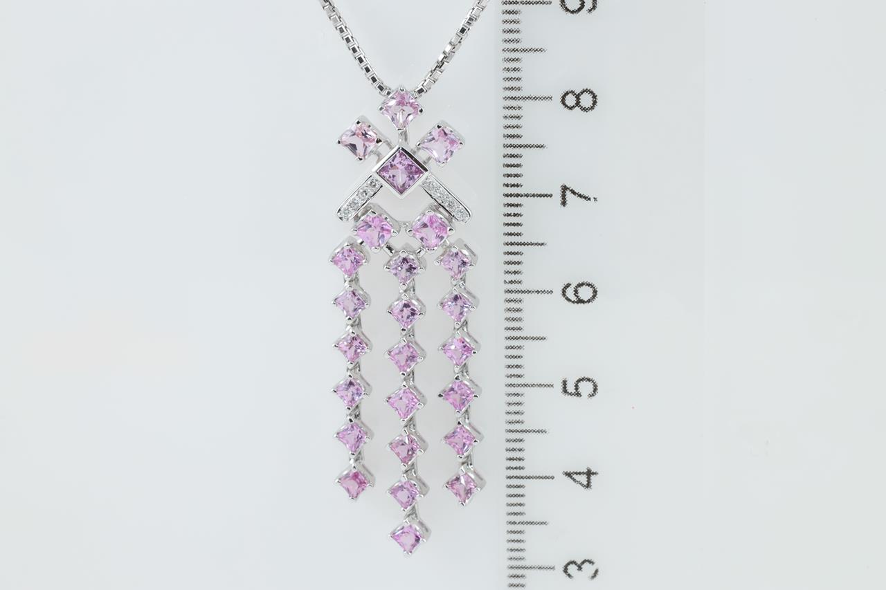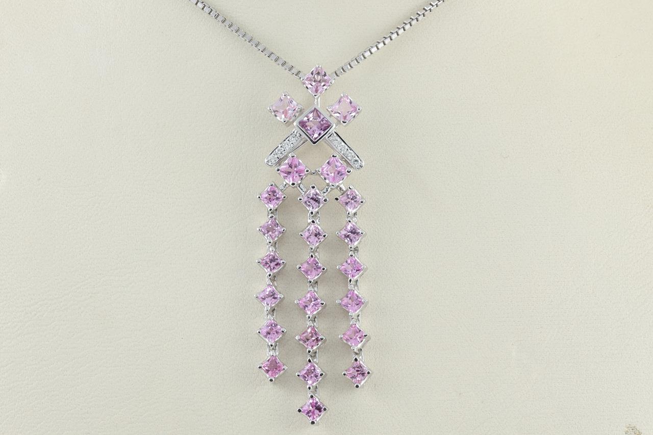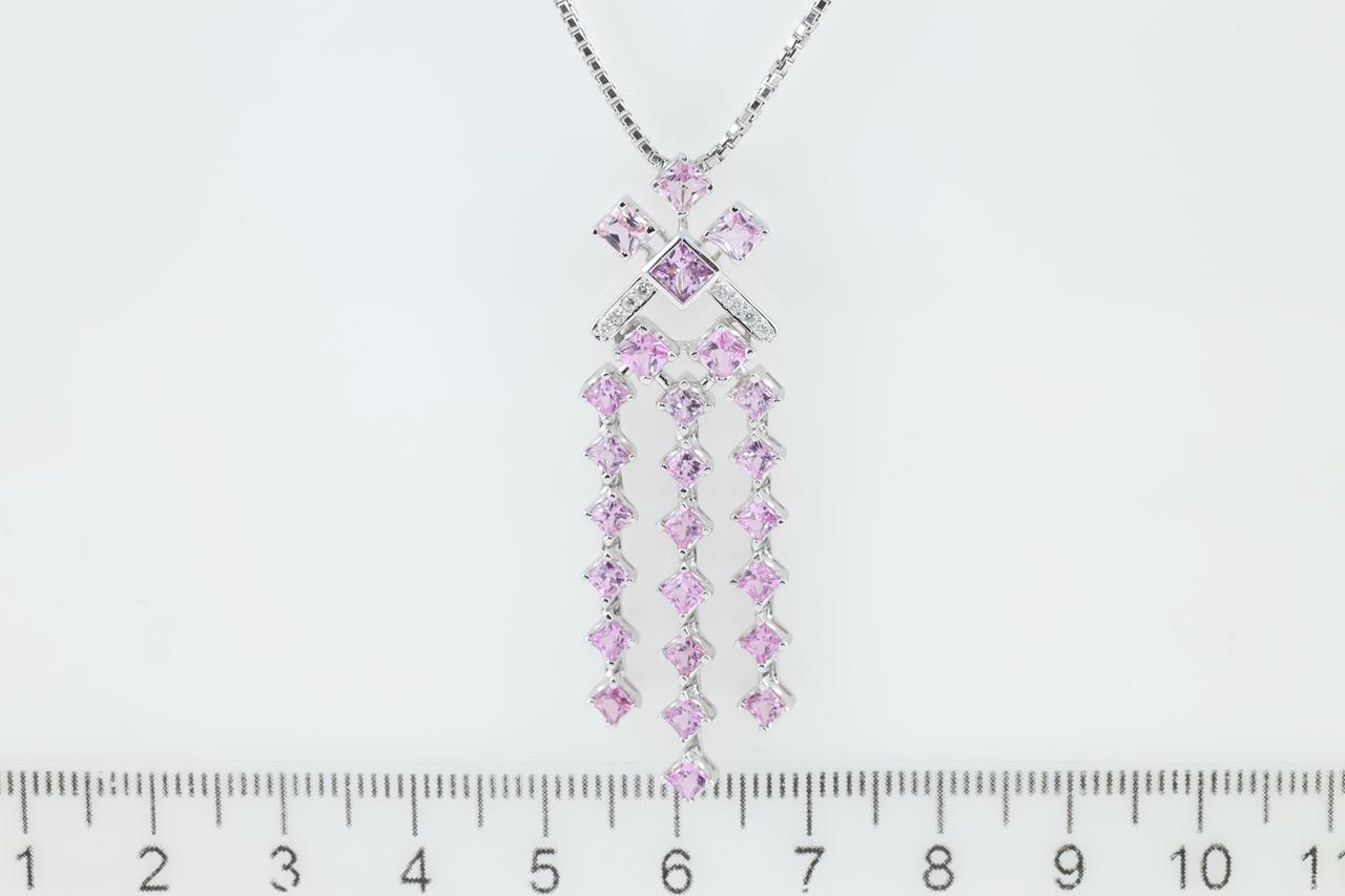 Sapphire and Diamond pendant with princess cut Pink Sapphires totalling 3.32cts and Diamonds totalling 0.07cts. 18ct white and yellow gold with 18ct white gold adjustable 58cm chain. Weight: 13.1g (Pre-owned)