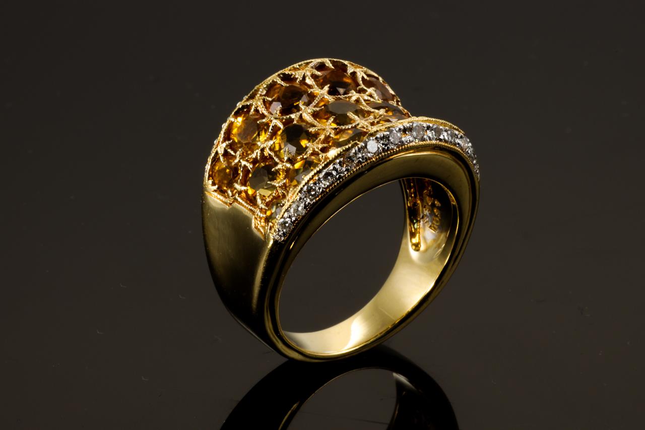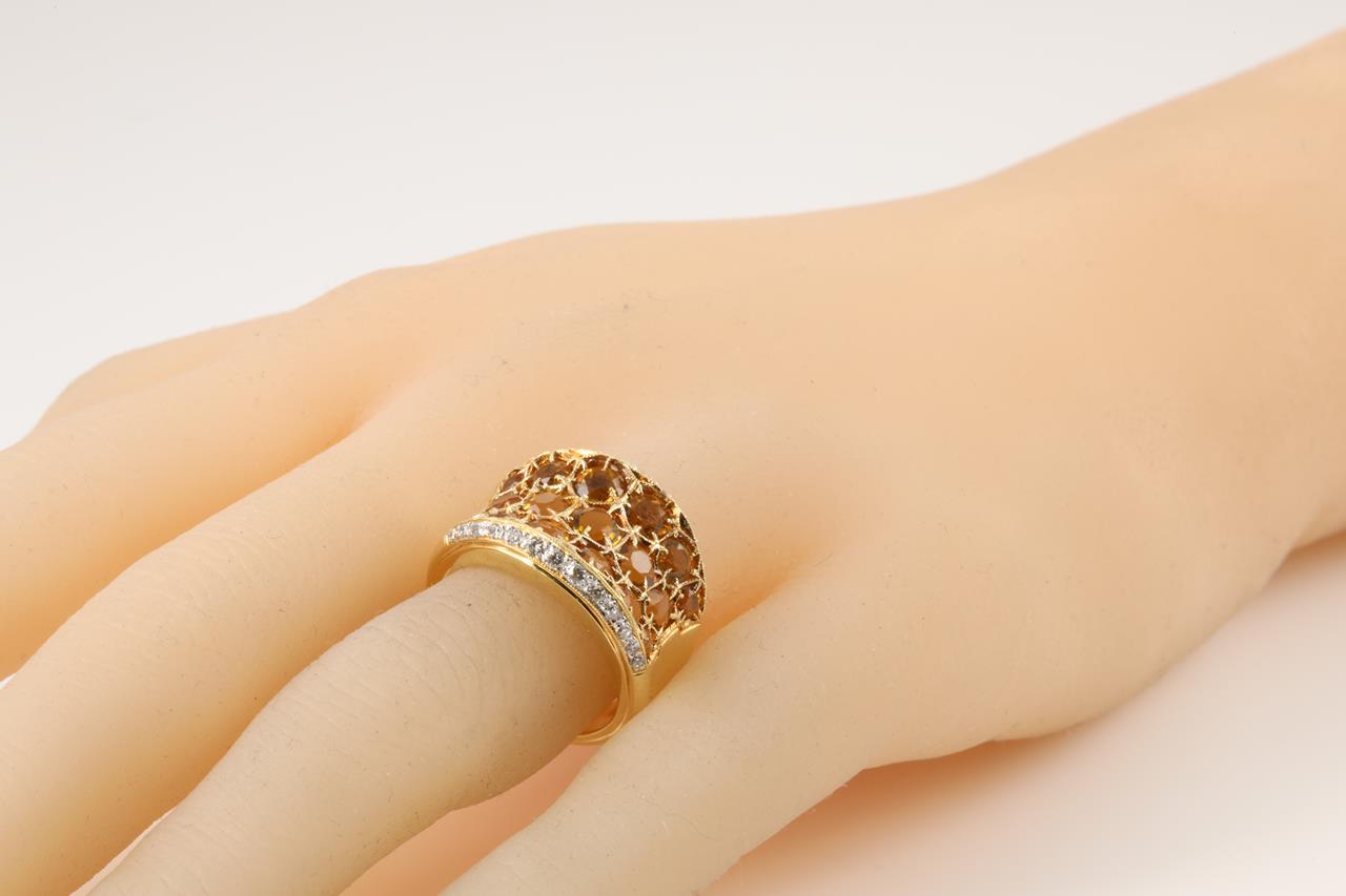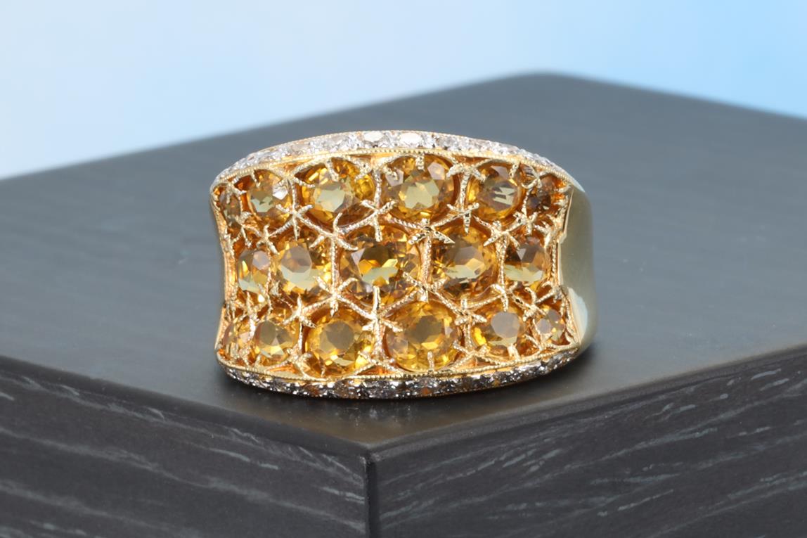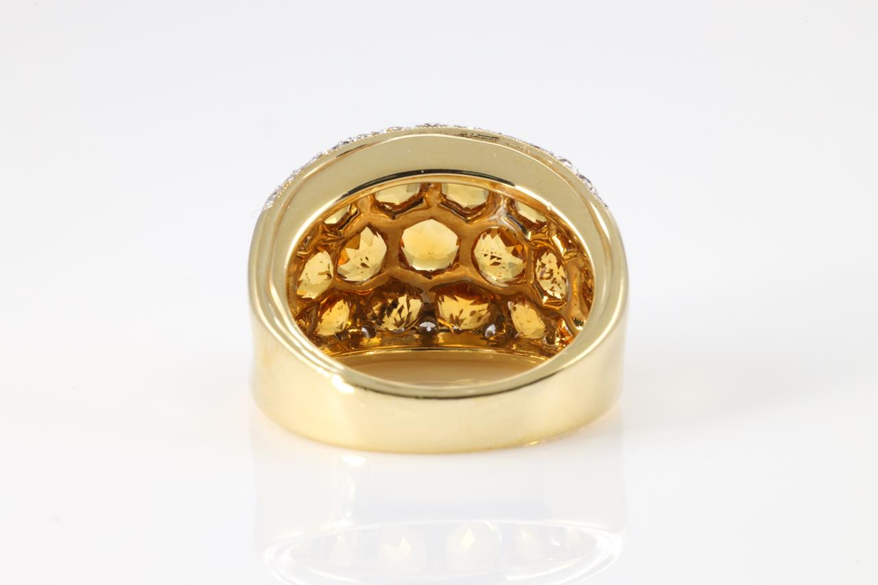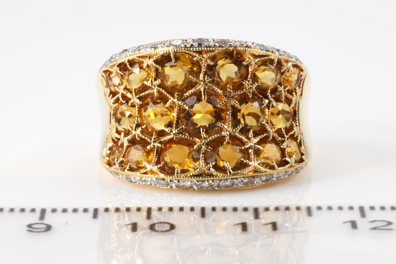 Citrine and Diamond ring with round shape Citrines totalling 3.34cts and Diamonds totalling 0.31cts (Estimated grading: G SI). 18ct yellow gold. Ring size M - ring resizing is not recommended. Weight: 10.5g (Pre-owned)