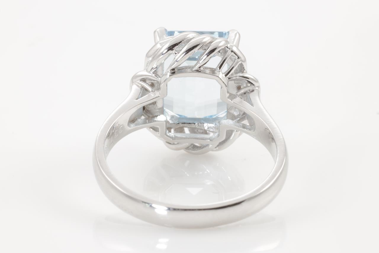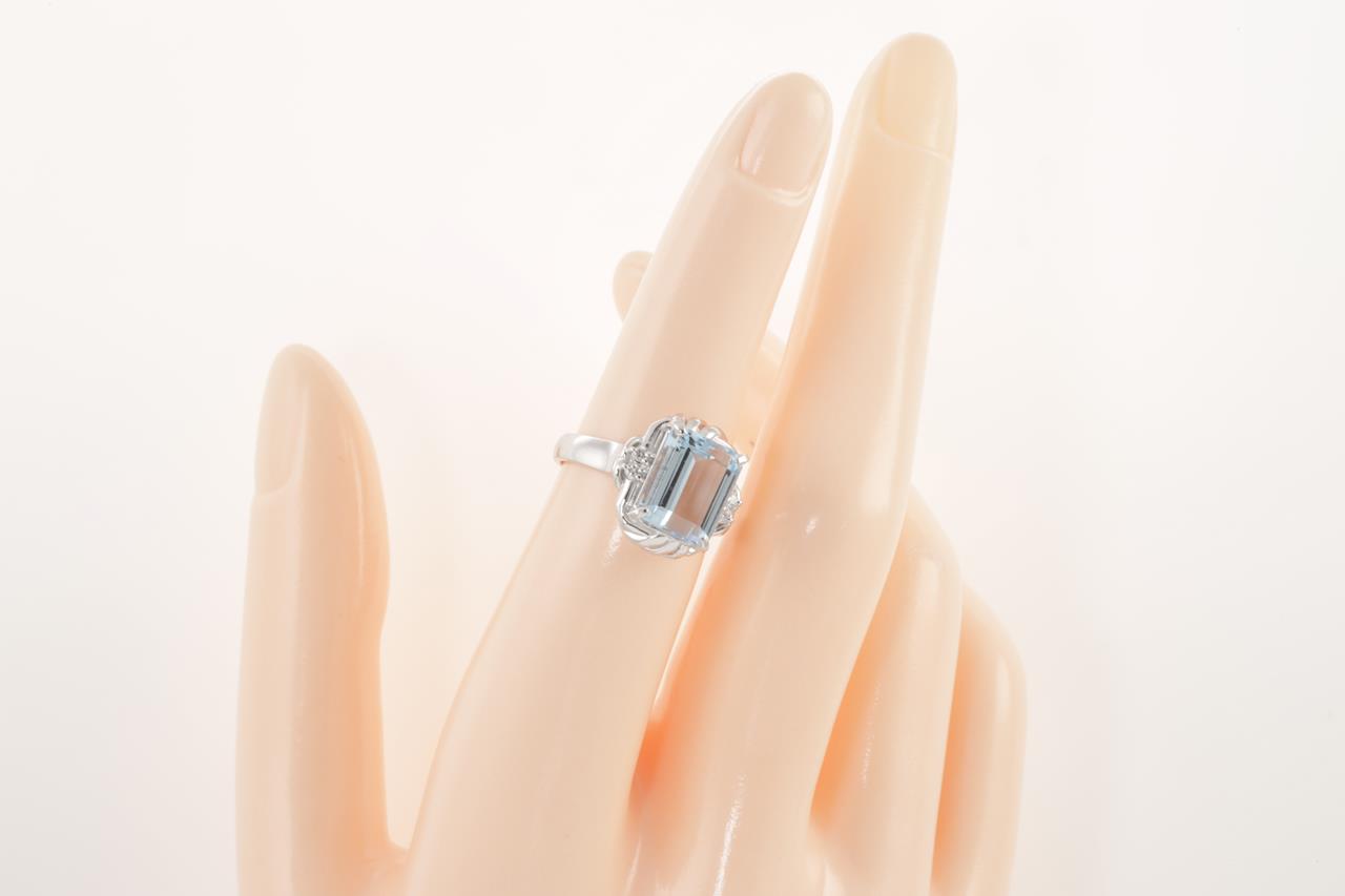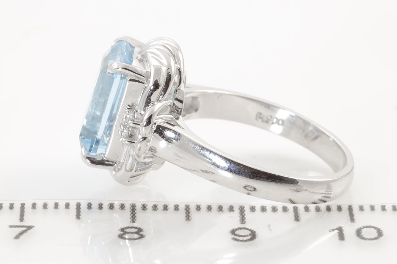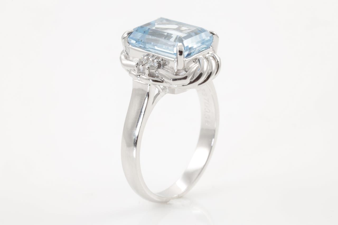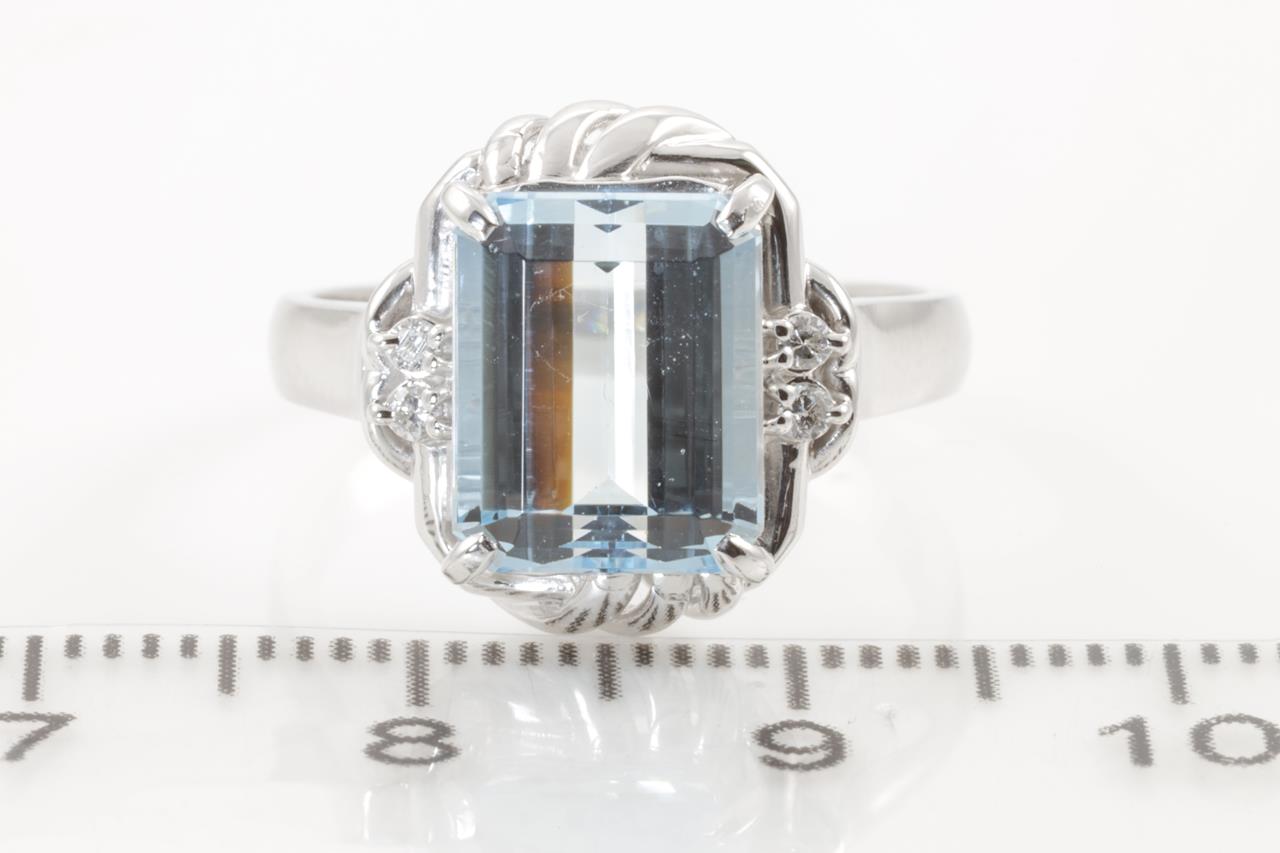 Aquamarine and Diamond ring with emerald cut Aquamarine of 3.37ct and Diamonds totalling 0.06cts. Platinum. Ring size L1/2. Weight: 7.2g. (Pre-owned)