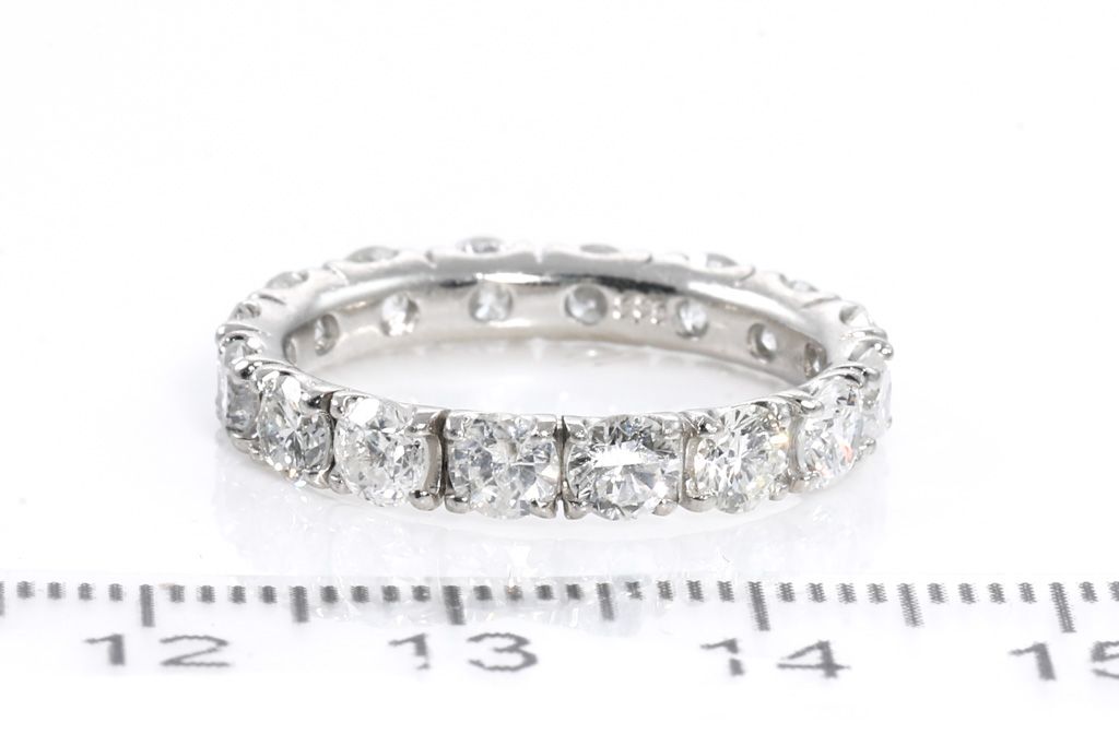 Diamond full hoop eternity ring with round Diamonds totalling 3.38cts (Estimated grading: H-I SI-P1). Platinum. Ring size O - ring resizing is not recommended. Platinum. Weight: 4.7g. With certificate #416341. (Pre-owned)