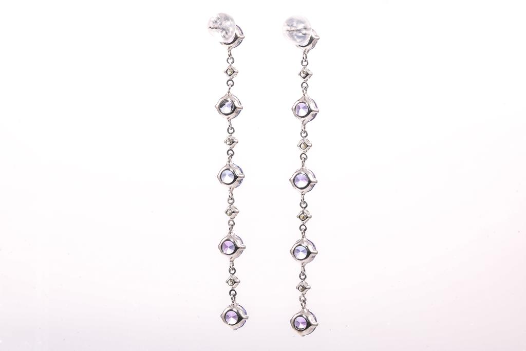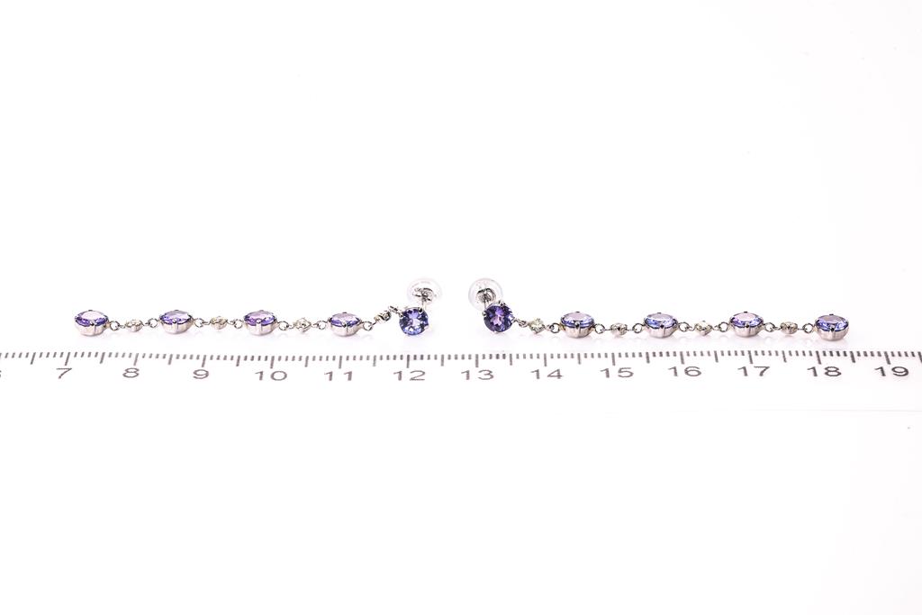 Tanzanite and Diamond drop earrings with round Tanzanite totalling 3.38cts and round Diamonds totalling 0.37cts (Estimated grading: K-L SI). Platinum with silicon & platinum backs. Weight: 2.5g. (Pre-owned)