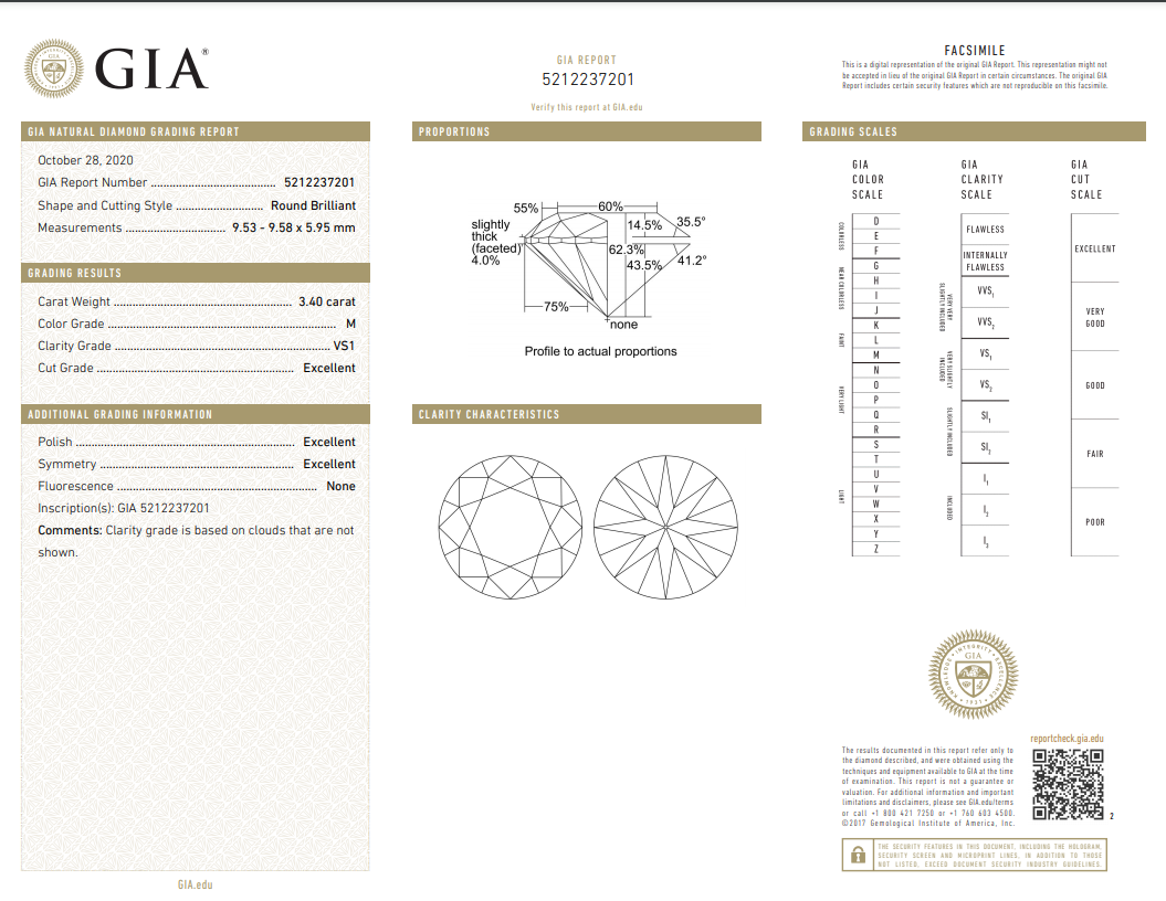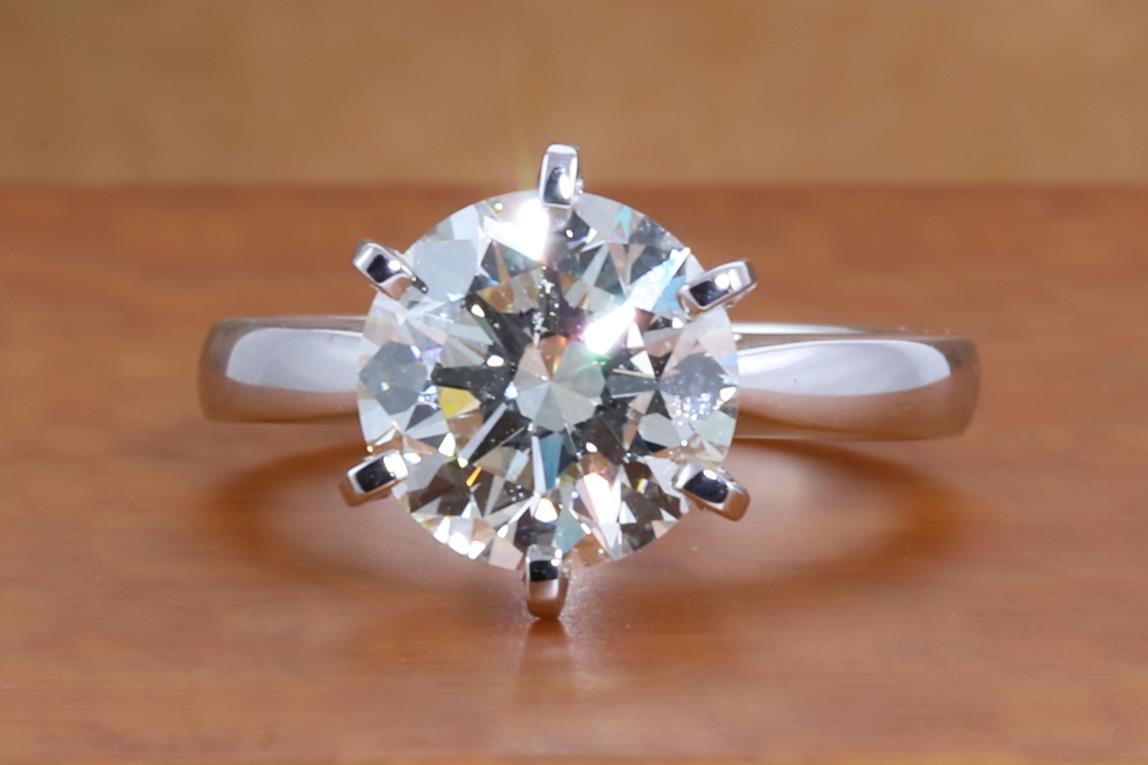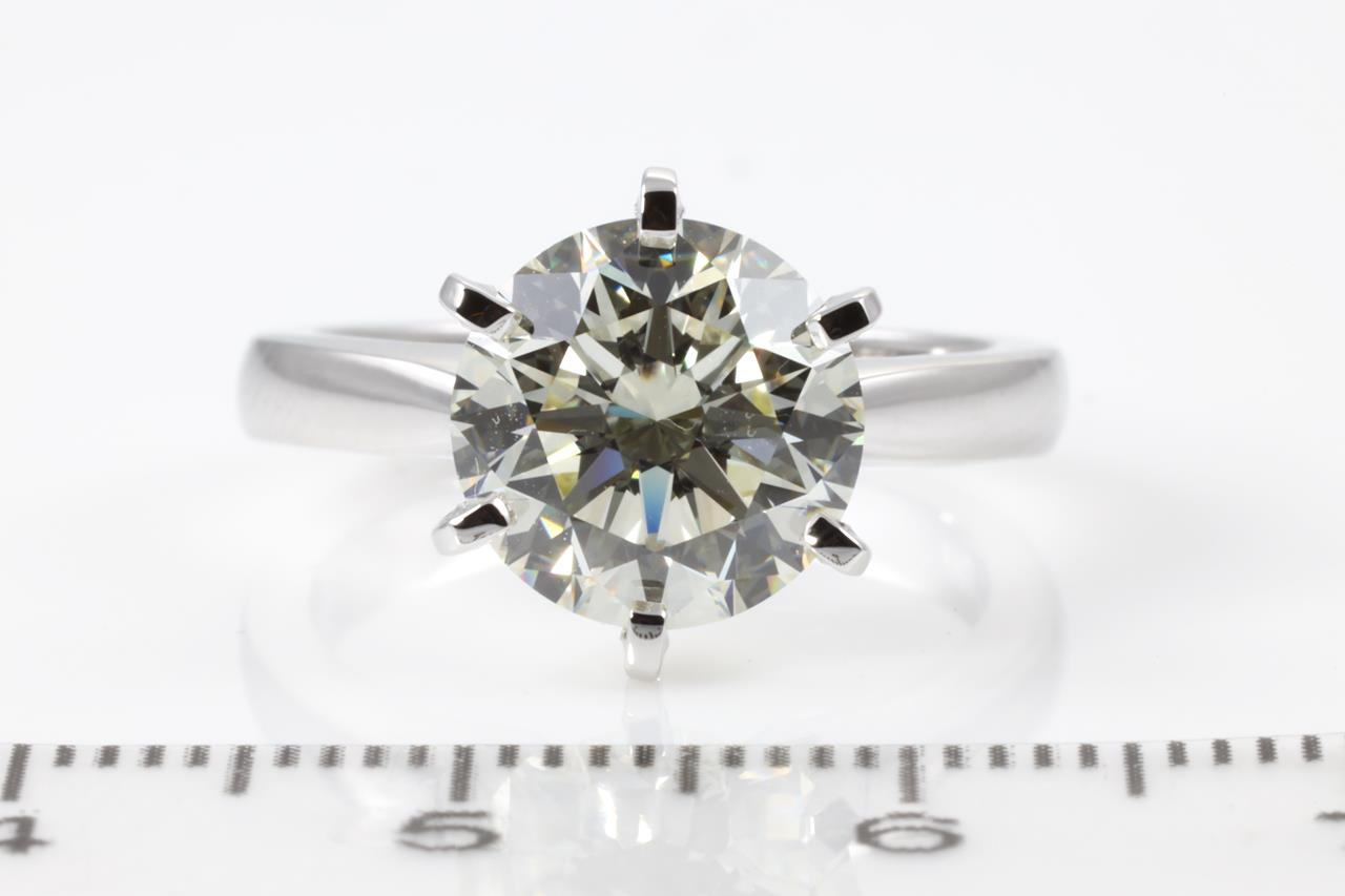 Diamond solitaire ring with Round Brilliant cut Diamond of 3.40ct (with GIA report graded as M VS2 #5212237201) set in 18ct white gold ring. Ring size L. Weight: 6.3g (New)