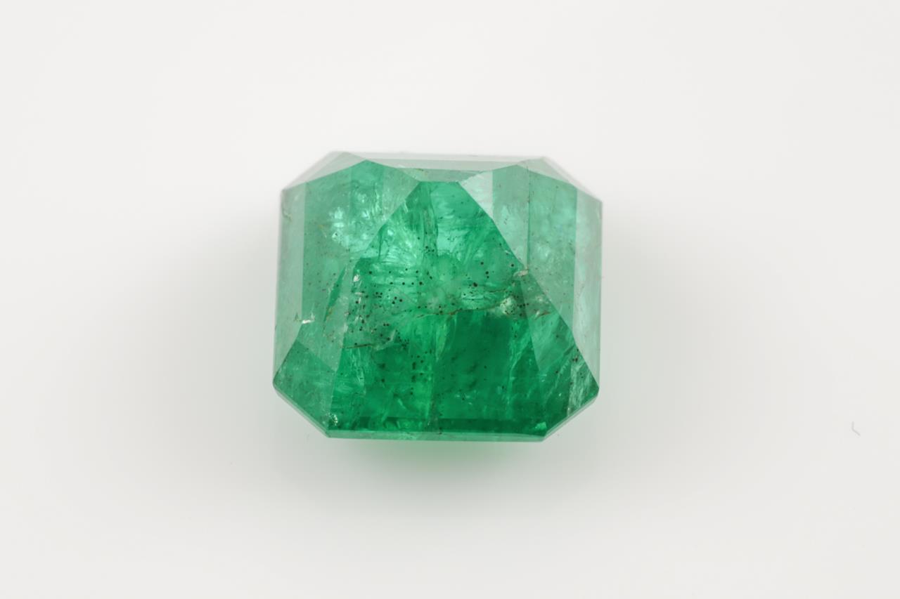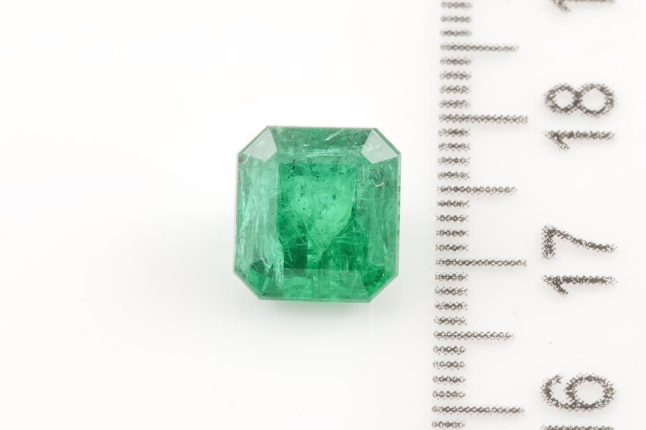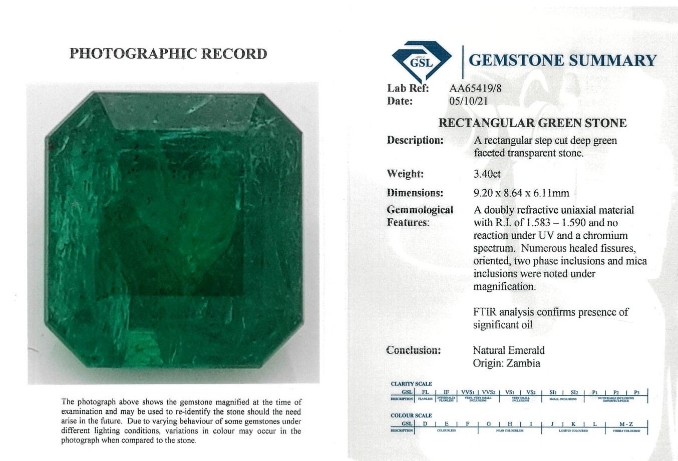 A loose Zambian emerald cut Emerald of 3.40ct (with GSL Gemstone summary report #AA65419/8). Dimensions: 9.20 x 8.64 x 6.11mm. (New)