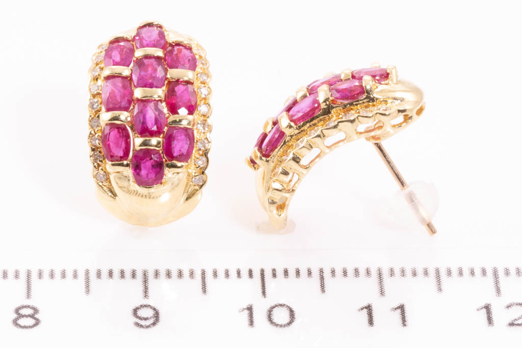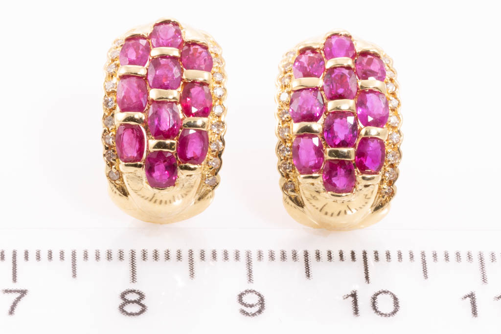 Ruby and Diamond earrings with oval Rubies totalling 3.40cts and round Diamonds totalling 0.16cts. 18ct yellow gold with silicon backs. Weight: 6.4g. (Pre-owned)