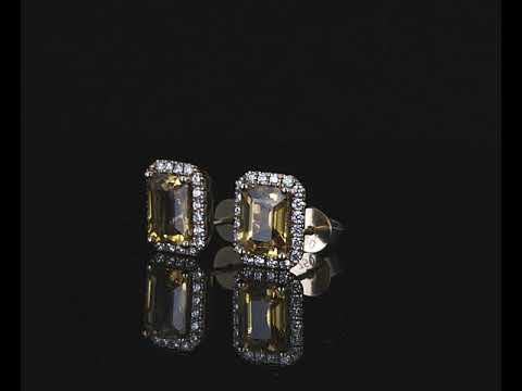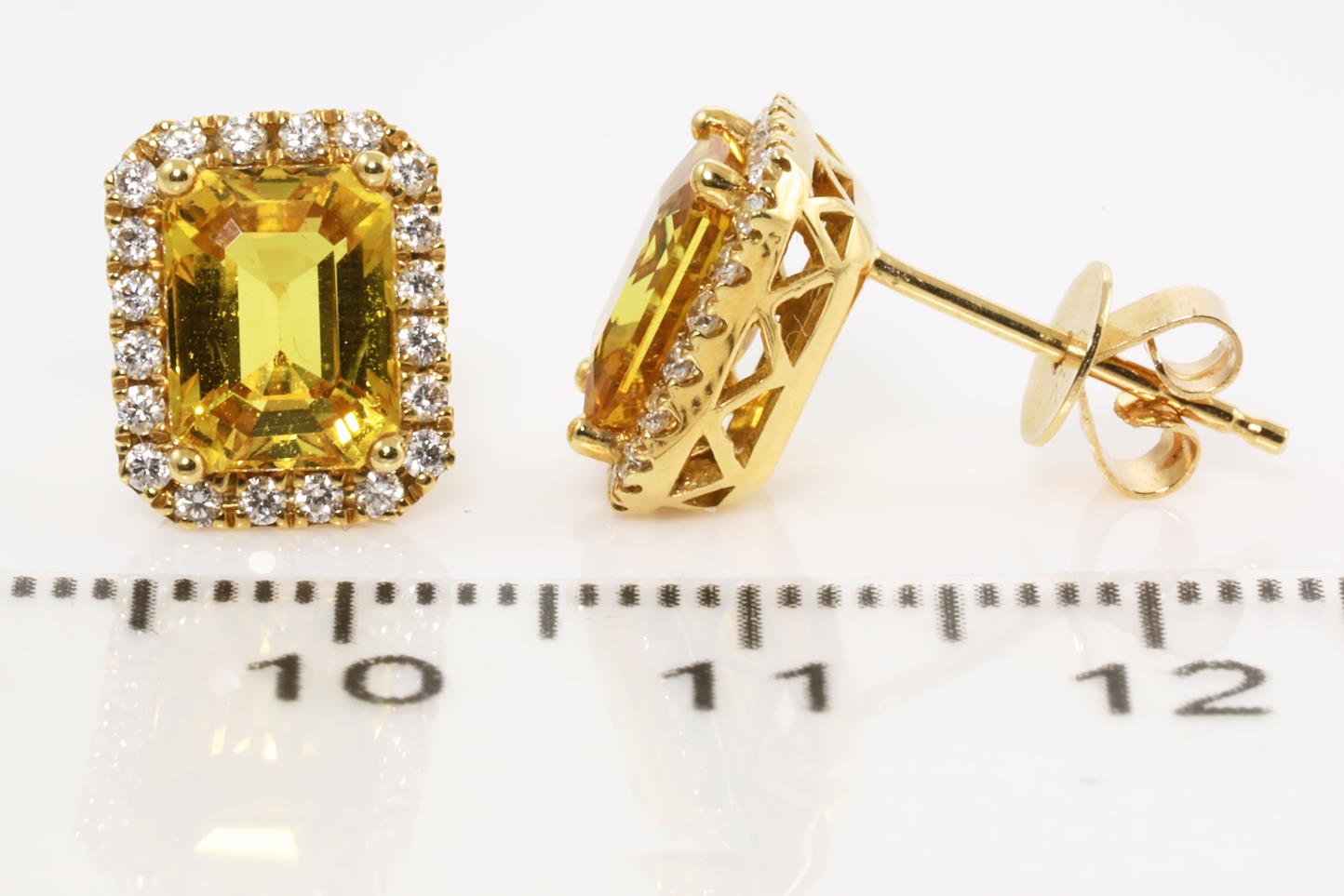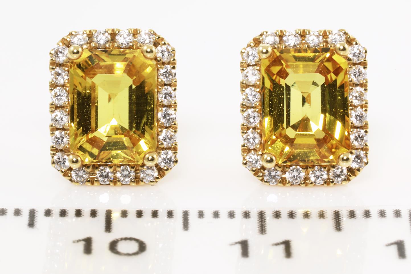 Sapphire and Diamond earrings with 2 emerald cut Yellow Sapphires totalling approximately 3.40cts and round Diamonds totalling approximately 0.30cts (Estimated grading: H SI). 18ct yellow gold. Weight: 4g (Pre-owned)