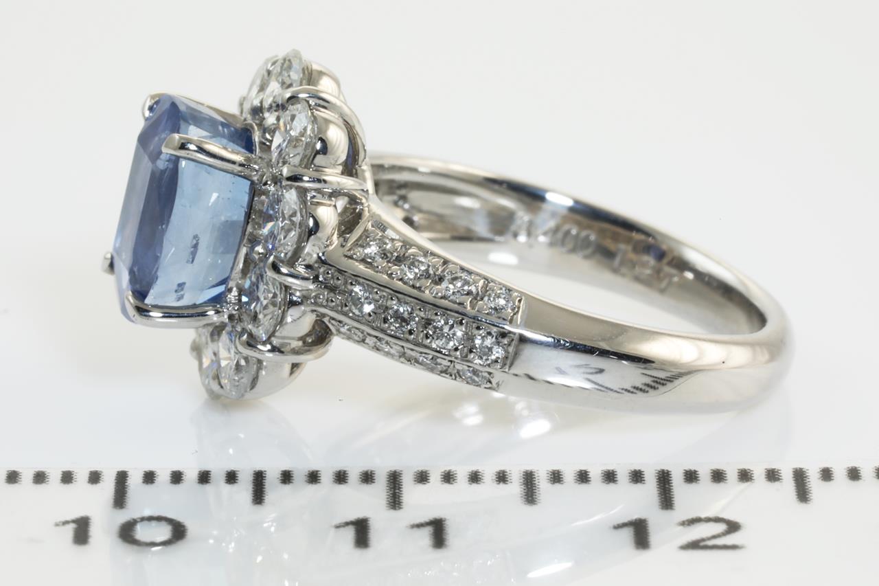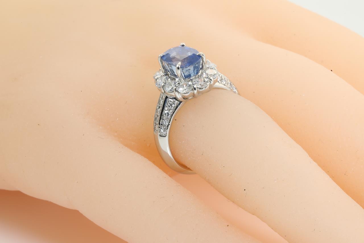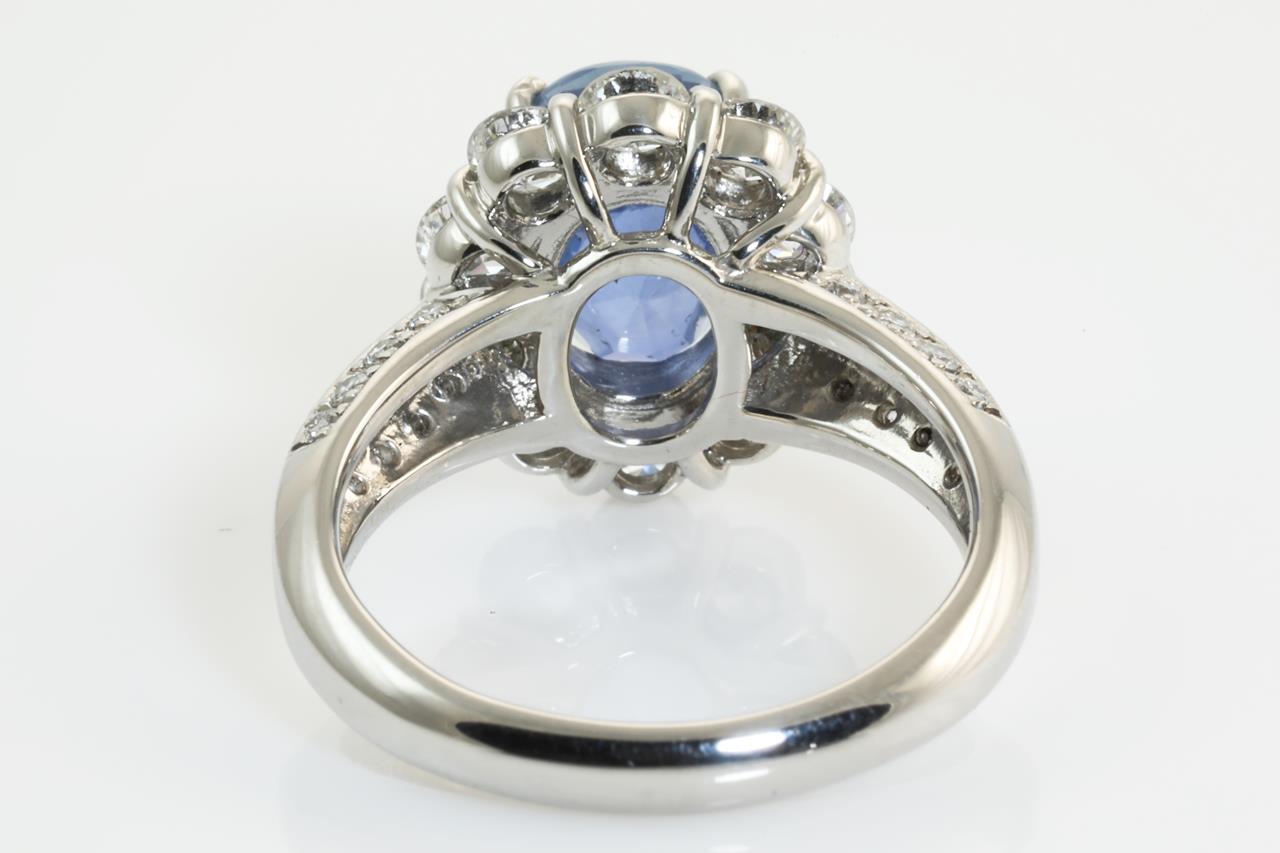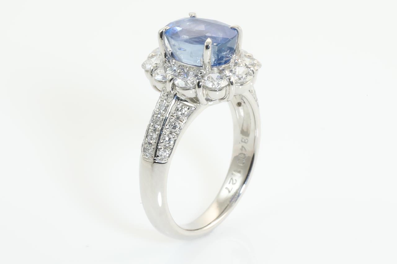 Sapphire and Diamond ring with oval cut non-heated blue Sapphire of 3.40ct (with GIA report #1359812087) and Diamonds totalling 1.27cts (Estimated grading: G VS-SI). Platinum. Ring size: L. Weight: 9.1g (Pre-owned)