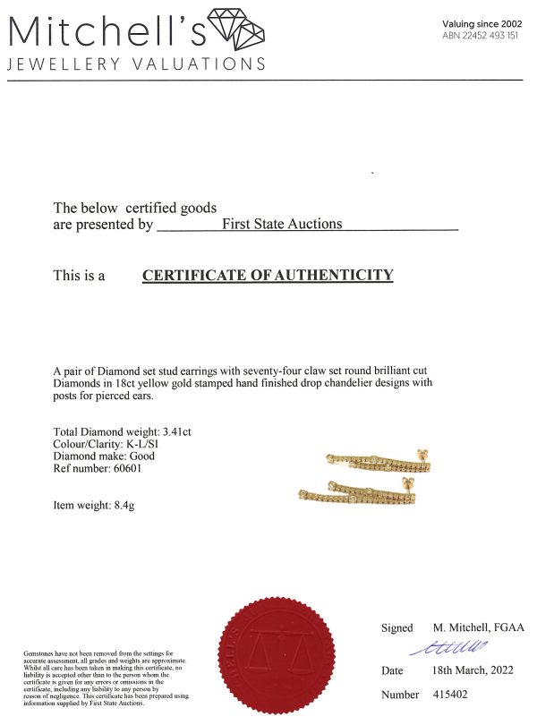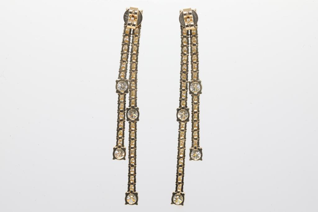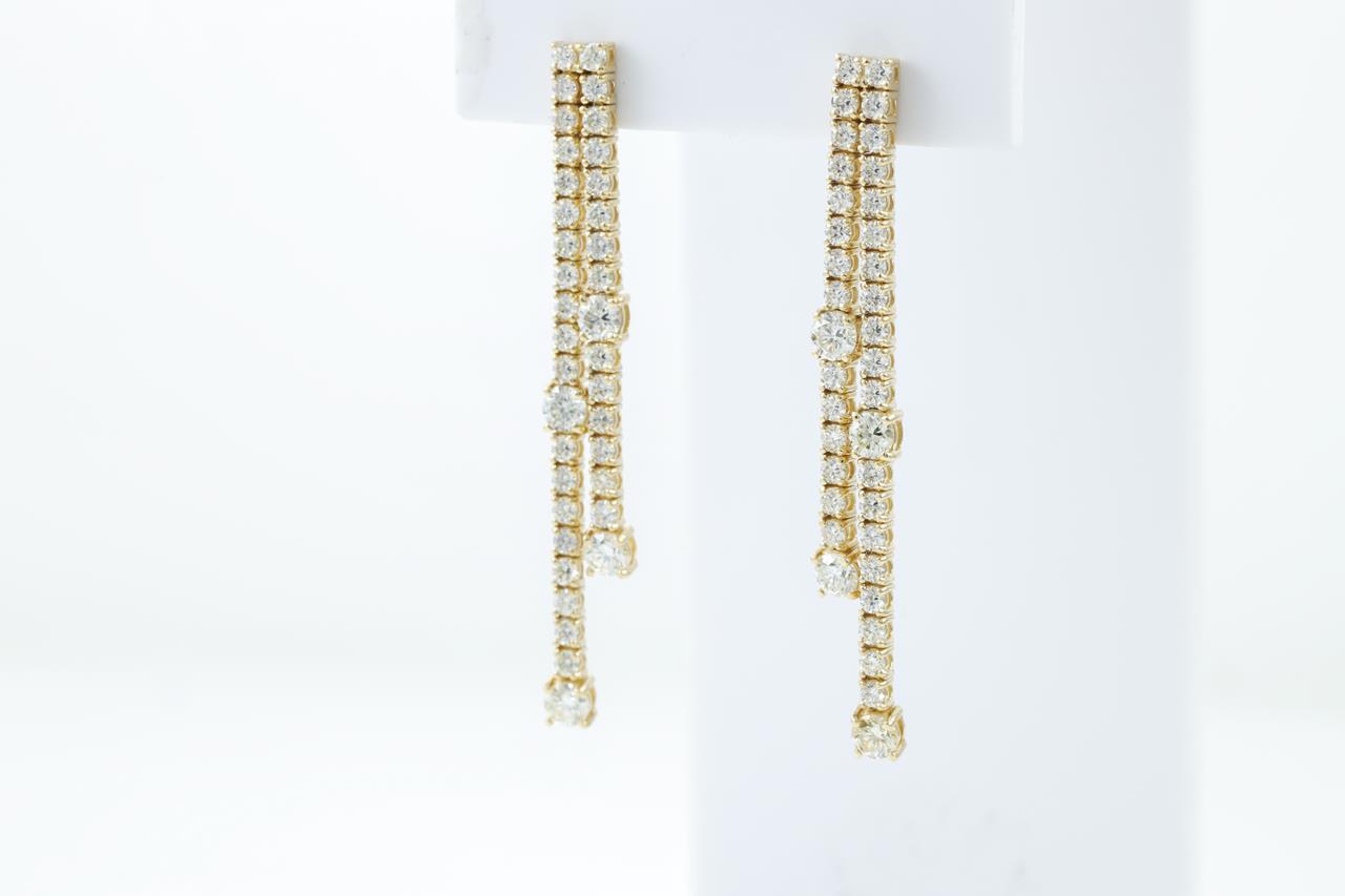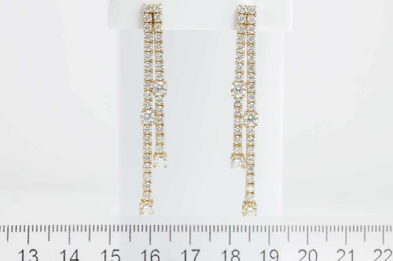 Diamond drop earrings with 74 round Diamonds totalling 3.41cts (Estimated grading: K-L SLI). 18ct yellow gold. Weight: 8.4g. With certificate #415402. (New)