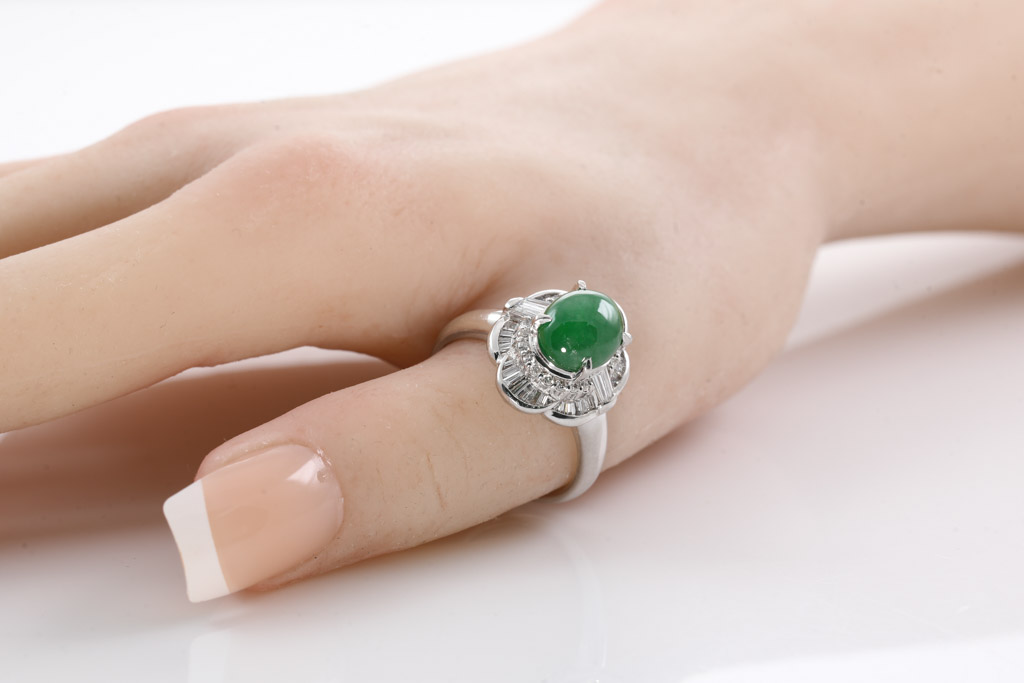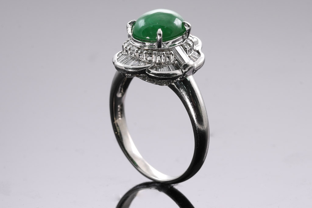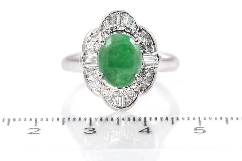 Jade and Diamond ring with oval cabochon cut green natural Jadeite Jade (Type A) of 3.41ct and baguette & round Diamonds totalling 0.67cts (Estimated grading: G-H SI). Platinum. Ring size S. Weight: 11.1g. (Pre-owned)