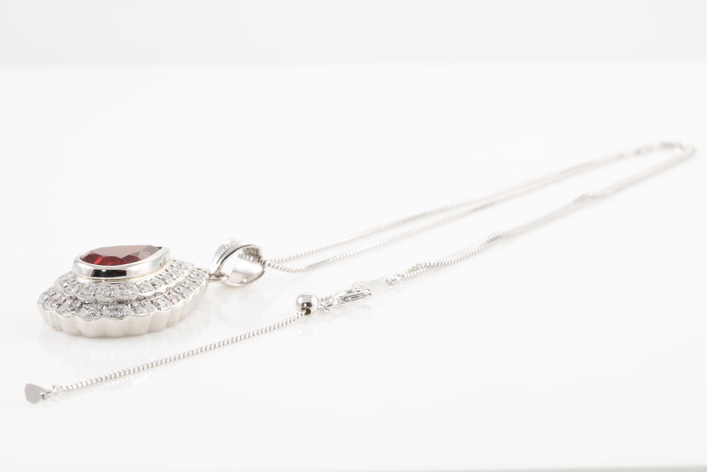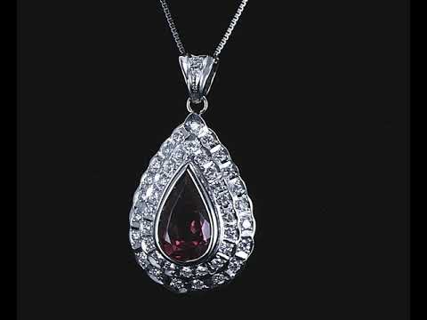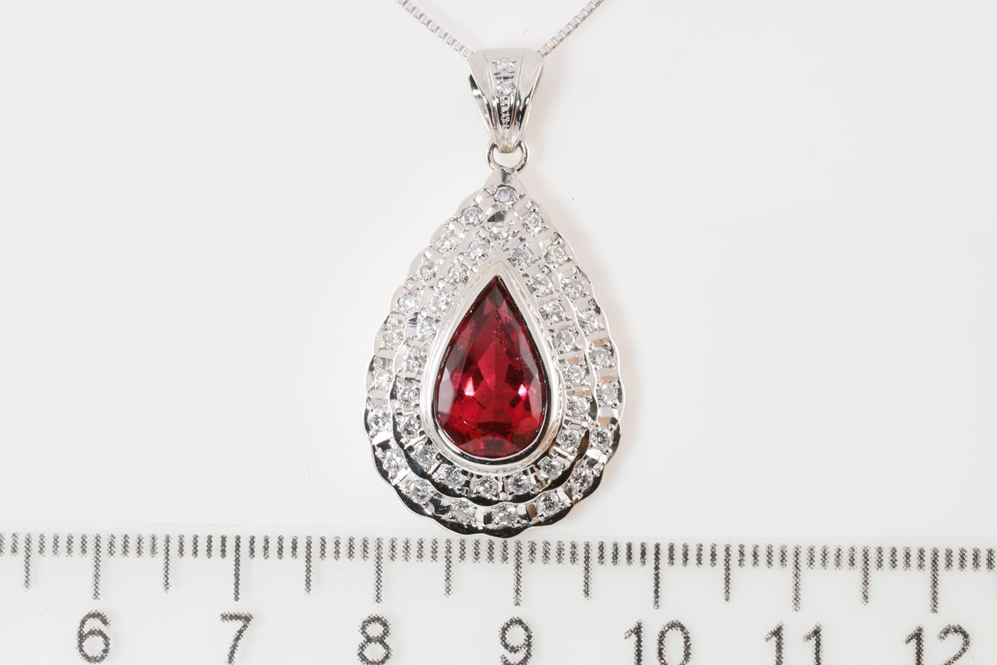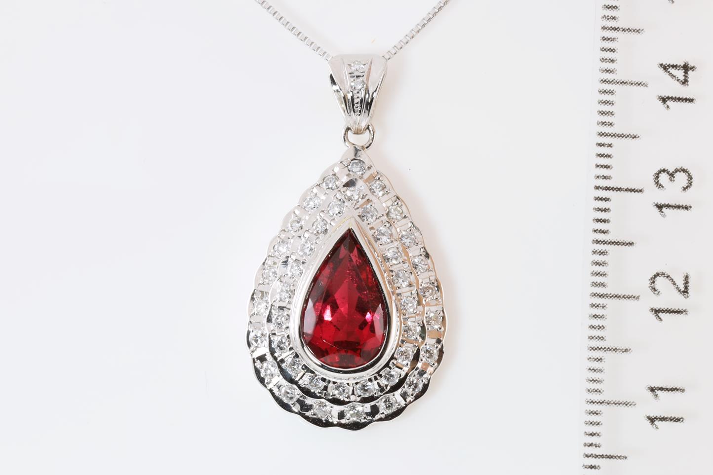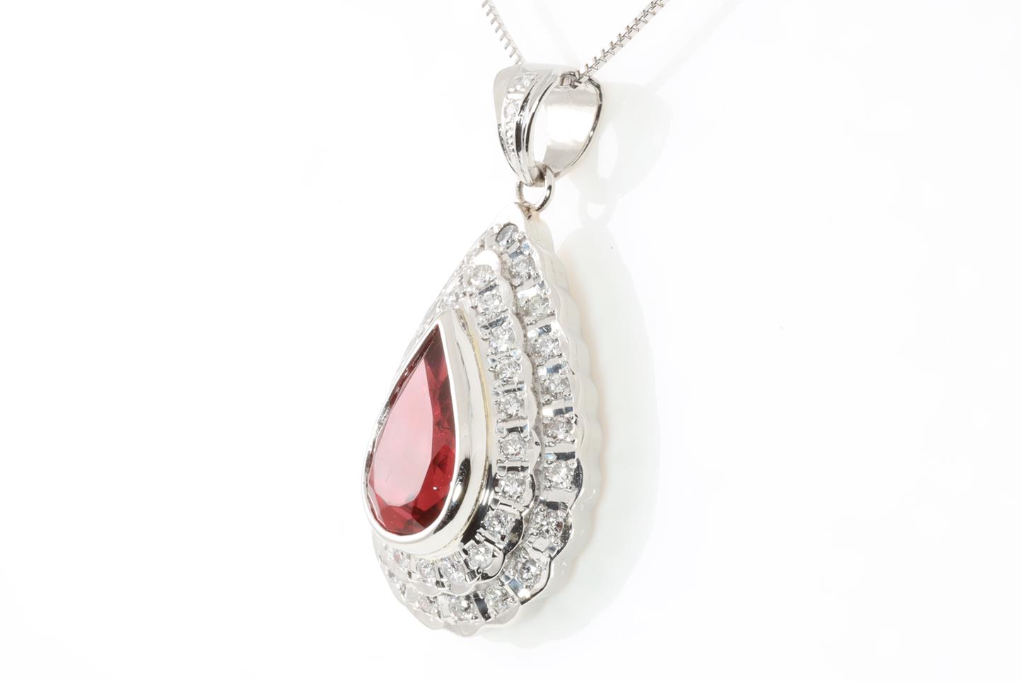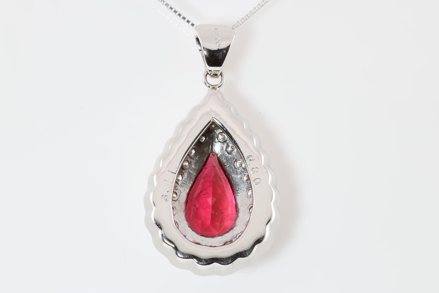 Rubellite and Diamond pendant with pear shape Rubellite of 3.41ct and Diamonds totalling 0.80cts (Estimated grading: G VS). Platinum with 18ct white gold 45cm adjustable chain. Weight: 12.3g (Pre-owned)